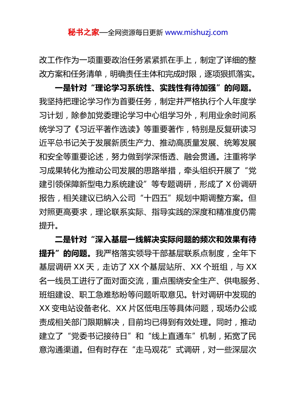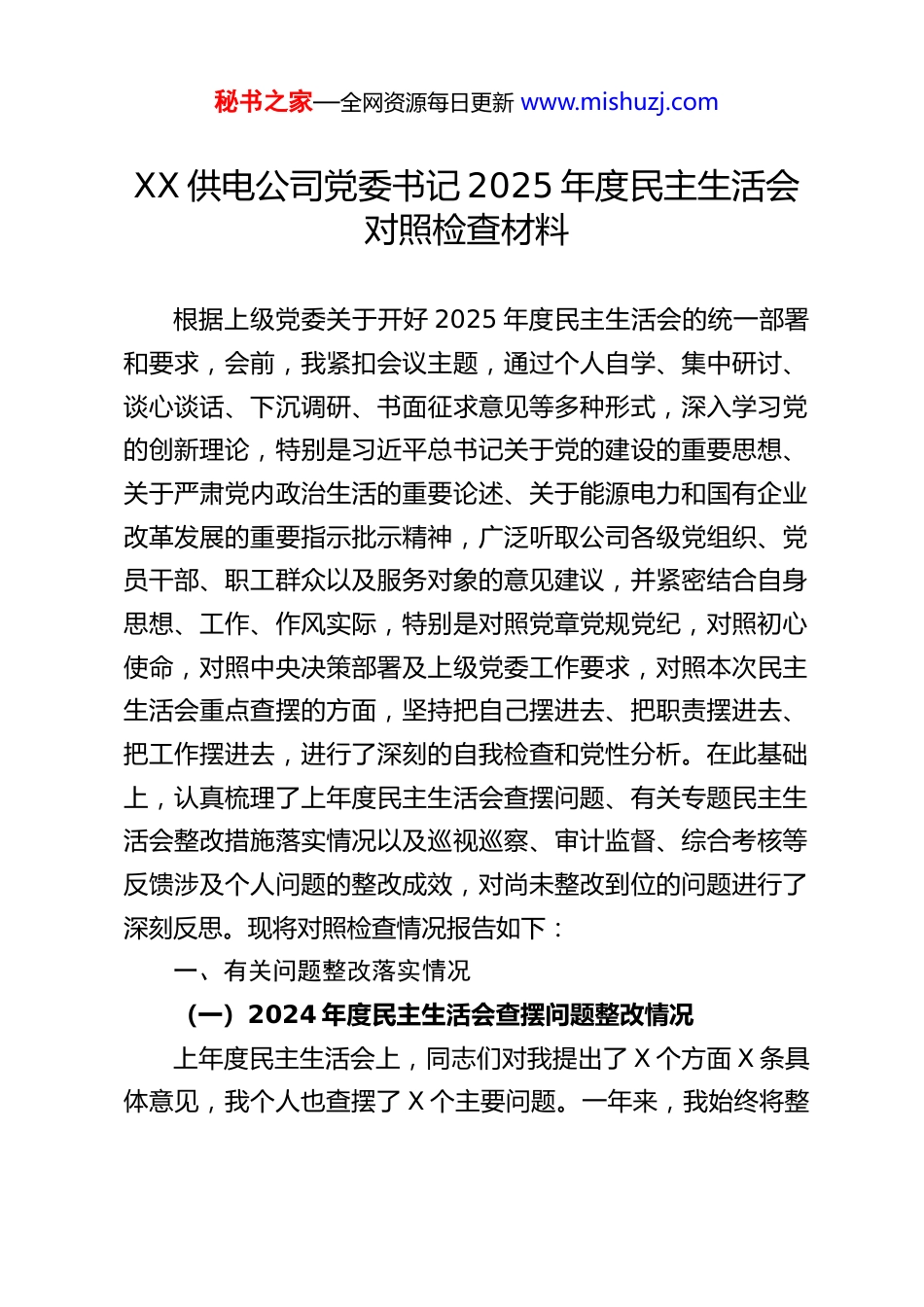 秘书之家—全网资源每日更新 www.mishuzj.comXX 供电公司党委书记 2025 年度民主生活会对照检查材料根据上级党委关于开好 2025 年度民主生活会的统一部署和要求,会前,我紧扣会议主题,通过个人自学、集中研讨、谈心谈话、下沉调研、书面征求意见等多种形式,深入学习党的创新理论,特别是习近平总书记关于党的建设的重要思想、关于严肃党内政治生活的重要论述、关于能源电力和国有企业改革发展的重要指示批示精神,广泛听取公司各级党组织、党员干部、职工群众以及服务对象的意见建议,并紧密结合自身思想、工作、作风实际,特别是对照党章党规党纪,对照初心使命,对照中央决策部署及上级党委工作要求,对照本次民主生活会重点查摆的方面,坚持把自己摆进去、把职责摆进去、把工作摆进去,进行了深刻的自我检查和党性分析。在此基础上,认真梳理了上年度民主生活会查摆问题、有关专题民主生活会整改措施落实情况以及巡视巡察、审计监督、综合考核等反馈涉及个人问题的整改成效,对尚未整改到位的问题进行了深刻反思。现将对照检查情况报告如下:一、有关问题整改落实情况(一)2024 年度民主生活会查摆问题整改情况上年度民主生活会上,同志们对我提出了 X 个方面 X 条具体意见,我个人也查摆了 X 个主要问题。一年来,我始终将整秘书之家—全网资源每日更新 www.mishuzj.com改工作作为一项重要政治任务紧紧抓在手上,制定了详细的整改方案和任务清单,明确责任主体和完成时限,逐项狠抓落实。一是针对“理论学习系统性、实践性有待加强”的问题。我坚持把理论学习作为首要任务,制定并严格执行个人年度学习计划,除参加党委理论学习中心组学习外,利用业余时间系统学习了《习近平著作选读》等重要著作,特别是反复研读习近平总书记关于发展新质生产力、推动高质量发展、统筹发展和安全等重要论述,努力做到学深悟透、融会贯通。注重将学习成果转化为推动公司发展的思路举措,牵头组织开展了“党建引领保障新型电力系统建设”等专题调研,形成了 X 份调研报告,相关建议已纳入公司“十四五”规划中期调整方案。但对照更高要求,理论联系实际、指导实践的深度和精准度仍需提升。二是针对“深入基层一线解决实际问题的频次和效果有待提升”的问题。我严格落实领导干部基层联系点制度,全年下基层调研 XX 天,走访了 XX 个基层站所、XX 个班组,与 XX名一线员工进行了面对面交流,重点围绕安全生产、供电服务、班组建设、职工急难愁盼等问题听取意见。针对调研中发现的XX 变电站设备老化、XX 片区低电压等具体问题,现场办公或责成相关部门限期解决,目前均已得到有效处理。同时,推动建立了“党委书记接待日”和“线上直通车”机制,拓宽了民意沟通渠道。但有时存在“走马观花”式调研,对一些深层次秘书之家—全网资源每日更新 www.mishuzj.com矛盾挖掘不够,跟踪问效的韧劲还需加强。三是针对“履行全面从严治党‘第一责任人’责任压力传导不够到位”的问题。我主持召开 X 次党委会专题研究全面从严治党工作,与班子成员、下级党组织书记开展廉政谈话 XX人次,修订完善了公司《党风廉政建设责任制实施细则》,层层签订了责任书。支持纪委履行监督责任,对发现的苗头性、倾向性问题及时提醒纠正。严肃查处了 X 起违纪违规案件,并开展警示教育。但在推动“一岗双责”落细落实、加强对关键少数特别是下级“一把手”的日常监督方面,力度和精度仍有提升空间,个别单位仍存在责任虚化、弱化现象。四是针对“攻坚克难、推动改革创新的锐气需进一步提振”的问题。面对电力体制改革深化和能源转型加速的新形势,我牵头组织研究公司发展战略,积极推动电网数字化转型、绿色低碳发展。在应对去年夏季极端高温天气保供电中,靠前指挥,确保了电网安全稳定运行和电力可靠供应。推动解决了 XX重点工程建设中的堵点难点问题。但有时在推动一些历史遗留问题或需要多方协调的复杂事项时,存在畏难情绪,创新突破的力度和成效与高质量发展要求相比还有差距。总体看,上年度查摆的问题已基本整改到位,取得了阶段性成效,但一些深层次问题需要持续用力、久久为功...