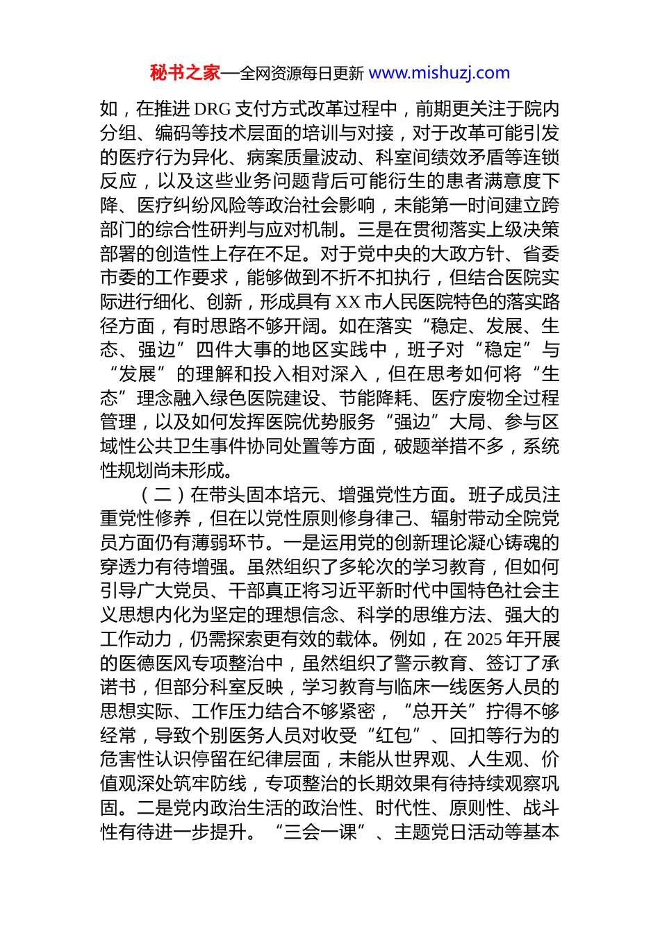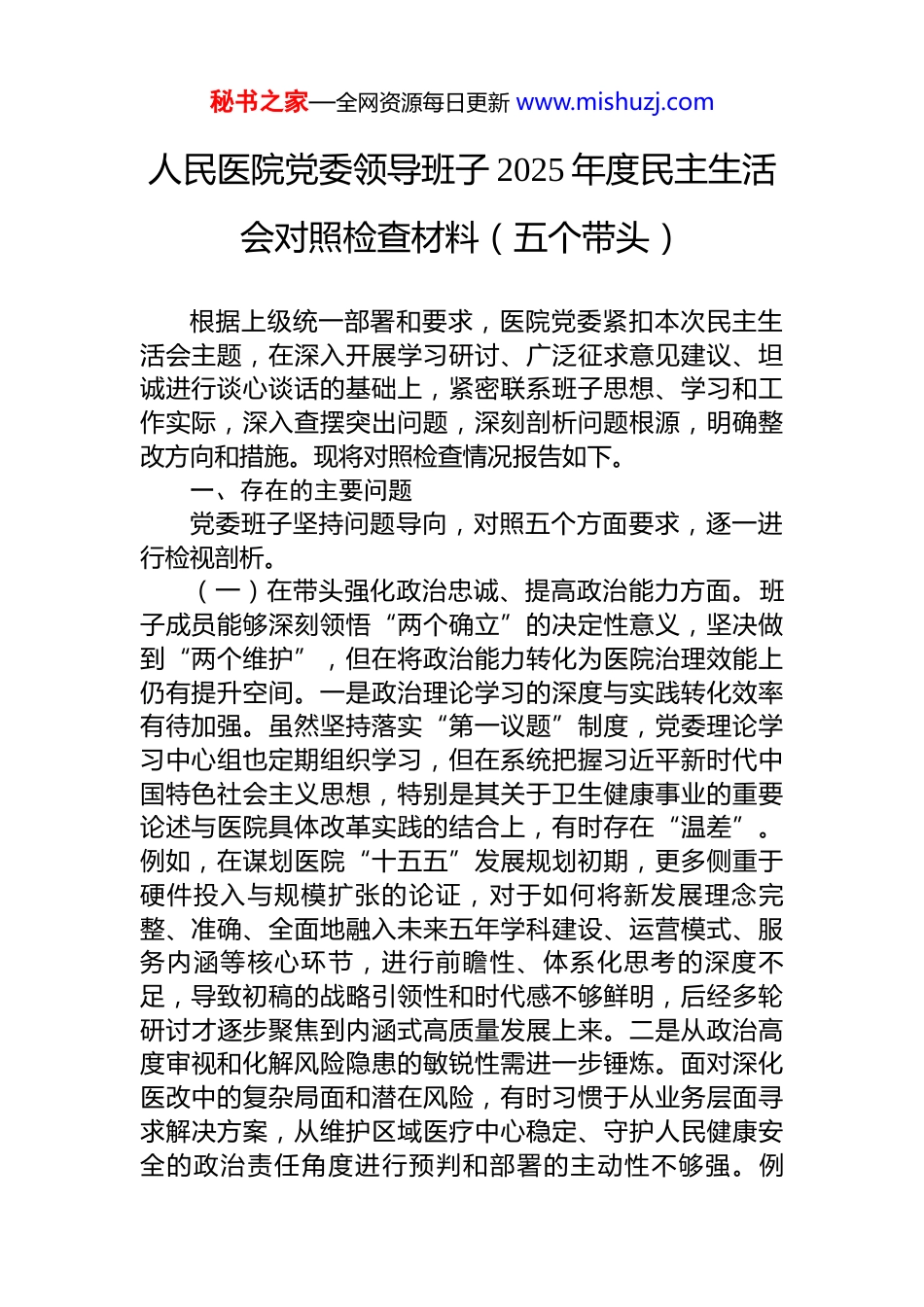 秘书之家—全网资源每日更新 www.mishuzj.com人民医院党委领导班子 2025 年度民主生活会对照检查材料(五个带头)根据上级统一部署和要求,医院党委紧扣本次民主生活会主题,在深入开展学习研讨、广泛征求意见建议、坦诚进行谈心谈话的基础上,紧密联系班子思想、学习和工作实际,深入查摆突出问题,深刻剖析问题根源,明确整改方向和措施。现将对照检查情况报告如下。一、存在的主要问题党委班子坚持问题导向,对照五个方面要求,逐一进行检视剖析。(一)在带头强化政治忠诚、提高政治能力方面。班子成员能够深刻领悟“两个确立”的决定性意义,坚决做到“两个维护”,但在将政治能力转化为医院治理效能上仍有提升空间。一是政治理论学习的深度与实践转化效率有待加强。虽然坚持落实“第一议题”制度,党委理论学习中心组也定期组织学习,但在系统把握习近平新时代中国特色社会主义思想,特别是其关于卫生健康事业的重要论述与医院具体改革实践的结合上,有时存在“温差”。例如,在谋划医院“十五五”发展规划初期,更多侧重于硬件投入与规模扩张的论证,对于如何将新发展理念完整、准确、全面地融入未来五年学科建设、运营模式、服务内涵等核心环节,进行前瞻性、体系化思考的深度不足,导致初稿的战略引领性和时代感不够鲜明,后经多轮研讨才逐步聚焦到内涵式高质量发展上来。二是从政治高度审视和化解风险隐患的敏锐性需进一步锤炼。面对深化医改中的复杂局面和潜在风险,有时习惯于从业务层面寻求解决方案,从维护区域医疗中心稳定、守护人民健康安全的政治责任角度进行预判和部署的主动性不够强。例秘书之家—全网资源每日更新 www.mishuzj.com如,在推进 DRG 支付方式改革过程中,前期更关注于院内分组、编码等技术层面的培训与对接,对于改革可能引发的医疗行为异化、病案质量波动、科室间绩效矛盾等连锁反应,以及这些业务问题背后可能衍生的患者满意度下降、医疗纠纷风险等政治社会影响,未能第一时间建立跨部门的综合性研判与应对机制。三是在贯彻落实上级决策部署的创造性上存在不足。对于党中央的大政方针、省委市委的工作要求,能够做到不折不扣执行,但结合医院实际进行细化、创新,形成具有 XX 市人民医院特色的落实路径方面,有时思路不够开阔。如在落实“稳定、发展、生态、强边”四件大事的地区实践中,班子对“稳定”与“发展”的理解和投入相对深入,但在思考如何将“生态”理念融入绿色医院建设、节能降耗、医疗废物全过程管理,以及如何发挥医院优势服务“强边”大局、参与区域性公共卫生事件协同处置等方面,破题举措不多,系统性规划尚未形成。(二)在带头固本培元、增强党性方面。班子成员注重党性修养,但在以党性原则修身律己、辐射带动全院党员方面仍有薄弱环节。一是运用党的创新理论凝心铸魂的穿透力有待增强。虽然组织了多轮次的学习教育,但如何引导广大党员、干部真正将习近平新时代中国特色社会主义思想内化为坚定的理想信念、科学的思维方法、强大的工作动力,仍需探索更有效的载体。例如,在 2025 年开展的医德医风专项整治中,虽然组织了警示教育、签订了承诺书,但部分科室反映,学习教育与临床一线医务人员的思想实际、工作压力结合不够紧密,“总开关”拧得不够经常,导致个别医务人员对收受“红包”、回扣等行为的危害性认识停留在纪律层面,未能从世界观、人生观、价值观深处筑牢防线,专项整治的长期效果有待持续观察巩固。二是党内政治生活的政治性、时代性、原则性、战斗性有待进一步提升。“三会一课”、主题党日活动等基本秘书之家—全网资源每日更新 www.mishuzj.com制度得到落实,但活动形式有时略显单一,吸引力和感染力不足。例如,在支部标准化建设过程中,个别支部满足于完成“规定动作”,在结合科室特点开展特色党建活动、将组织生活与解决临床难题、服务患者需求深度融合方面创新不够。班子在指导支部工作时,有时偏重于检查记录是否规范,对组织生活实际效果、党员党性锻炼程度的关注和评估不够深入具体。三是班子自身在弘扬共产党人精神追求上示范引领的标杆作用可以更加凸显。班子成员能够做到清正廉洁...