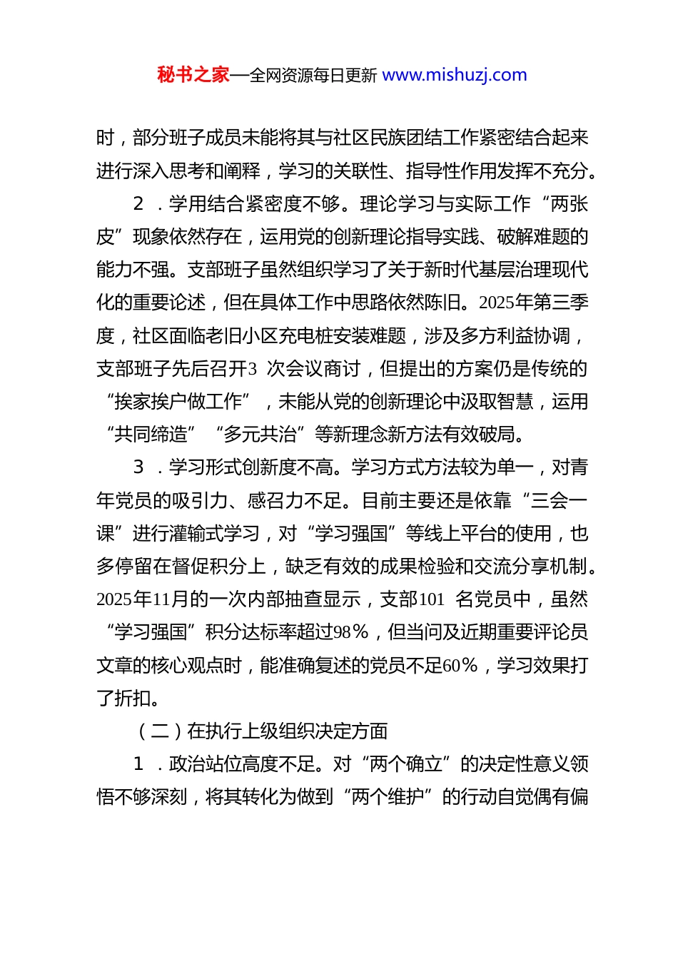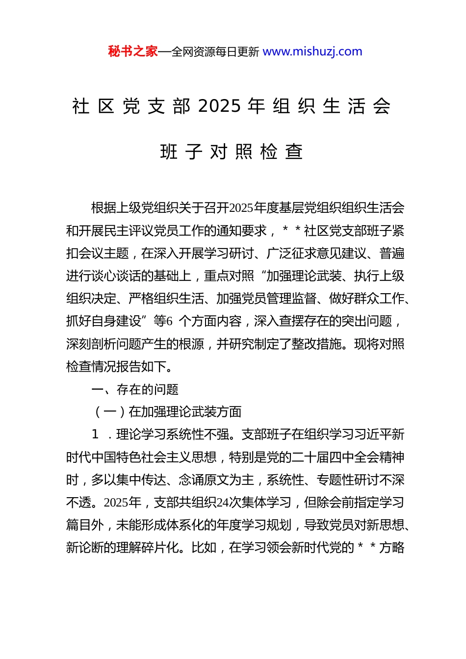 秘书之家—全网资源每日更新 www.mishuzj.com社 区 党 支 部 2025 年 组 织 生 活 会班 子 对 照 检 查根据上级党组织关于召开2025年度基层党组织组织生活会和开展民主评议党员工作的通知要求,**社区党支部班子紧扣会议主题,在深入开展学习研讨、广泛征求意见建议、普遍进行谈心谈话的基础上,重点对照“加强理论武装、执行上级组织决定、严格组织生活、加强党员管理监督、做好群众工作、抓好自身建设”等6 个方面内容,深入查摆存在的突出问题,深刻剖析问题产生的根源,并研究制定了整改措施。现将对照检查情况报告如下。一、存在的问题(一)在加强理论武装方面1 .理论学习系统性不强。支部班子在组织学习习近平新时代中国特色社会主义思想,特别是党的二十届四中全会精神时,多以集中传达、念诵原文为主,系统性、专题性研讨不深不透。2025年,支部共组织24次集体学习,但除会前指定学习篇目外,未能形成体系化的年度学习规划,导致党员对新思想、新论断的理解碎片化。比如,在学习领会新时代党的**方略秘书之家—全网资源每日更新 www.mishuzj.com时,部分班子成员未能将其与社区民族团结工作紧密结合起来进行深入思考和阐释,学习的关联性、指导性作用发挥不充分。2 .学用结合紧密度不够。理论学习与实际工作“两张皮”现象依然存在,运用党的创新理论指导实践、破解难题的能力不强。支部班子虽然组织学习了关于新时代基层治理现代化的重要论述,但在具体工作中思路依然陈旧。2025年第三季度,社区面临老旧小区充电桩安装难题,涉及多方利益协调,支部班子先后召开3 次会议商讨,但提出的方案仍是传统的“挨家挨户做工作”,未能从党的创新理论中汲取智慧,运用“共同缔造”“多元共治”等新理念新方法有效破局。3 .学习形式创新度不高。学习方式方法较为单一,对青年党员的吸引力、感召力不足。目前主要还是依靠“三会一课”进行灌输式学习,对“学习强国”等线上平台的使用,也多停留在督促积分上,缺乏有效的成果检验和交流分享机制。2025年11月的一次内部抽查显示,支部101 名党员中,虽然“学习强国”积分达标率超过98%,但当问及近期重要评论员文章的核心观点时,能准确复述的党员不足60%,学习效果打了折扣。(二)在执行上级组织决定方面1 .政治站位高度不足。对“两个确立”的决定性意义领悟不够深刻,将其转化为做到“两个维护”的行动自觉偶有偏秘书之家—全网资源每日更新 www.mishuzj.com差。在执行上级决策部署时,有时会优先考虑本社区的局部利益和现实困难,导致在贯彻落实上打折扣、搞变通。2 .大局意识强度不彰。在服务中心大局、发挥兵团“三大功能”“四大作用”等重大要求上,思考谋划不深入,未能将宏观战略要求完全转化为支部层面的具体行动方案。支部班子在制定年度工作计划时,更多聚焦于社区环境整治、邻里纠纷调解等日常事务,对于如何通过支部工作,在维护稳定、促进融合等方面贡献力量,缺乏前瞻性思考和系统性布局。2025年支部工作总结中,涉及服务全县发展大局的内容仅有2 条,且较为笼统。3 .报告制度刚度不严。在执行重大事项报告、重要工作请示制度上存在不及时、不规范的问题。有时认为某些工作属于社区内部事务,或自认为能够妥善处理,便简化了向上级党组织请示报告的程序。2025年7 月,社区一处共有产权房因产权划分问题引发了10余户居民的集体申诉,支部书记**同志在未向街道党工委正式报告的情况下,自行组织调解,虽然后续问题得到解决,但这种“先斩后奏”的做法,不符合组织原则和纪律要求。(三)在严格组织生活方面1 .批评与自我批评辣味不足。组织生活会上的相互批评环节,存在“你好我好大家好”的现象,碍于情面,不愿点名道姓、揭短亮丑。在2025年上半年的专题组织生活会上,班子秘书之家—全网资源每日更新 www.mishuzj.com成员之间的相互批评意见共计15条,其中涉及具体工作问题的仅有4 条,其余多为“希望加强理论学习”“建议多下基层”等宽泛化、程序性的建议,未能真正起到“红脸出汗、排毒治病”的效果,党内政治生活的熔炉作用发挥不充分。2 .谈心谈话质量效...