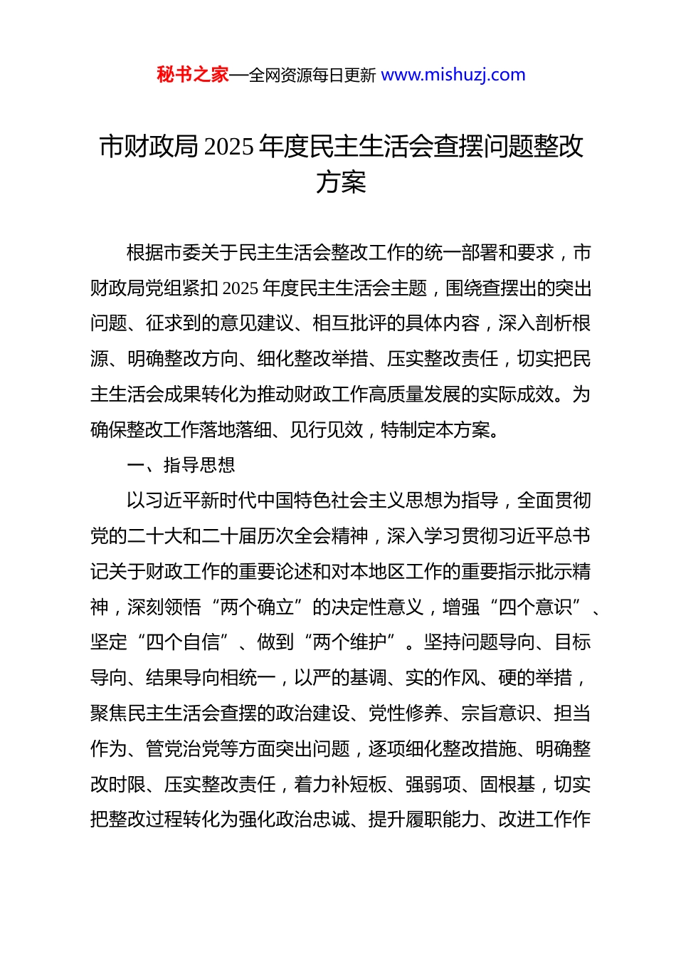 秘书之家—全网资源每日更新 www.mishuzj.com市财政局 2025 年度民主生活会查摆问题整改方案 根据市委关于民主生活会整改工作的统一部署和要求,市财政局党组紧扣 2025 年度民主生活会主题,围绕查摆出的突出问题、征求到的意见建议、相互批评的具体内容,深入剖析根源、明确整改方向、细化整改举措、压实整改责任,切实把民主生活会成果转化为推动财政工作高质量发展的实际成效。为确保整改工作落地落细、见行见效,特制定本方案。一、指导思想以习近平新时代中国特色社会主义思想为指导,全面贯彻党的二十大和二十届历次全会精神,深入学习贯彻习近平总书记关于财政工作的重要论述和对本地区工作的重要指示批示精神,深刻领悟“两个确立”的决定性意义,增强“四个意识”、坚定“四个自信”、做到“两个维护”。坚持问题导向、目标导向、结果导向相统一,以严的基调、实的作风、硬的举措,聚焦民主生活会查摆的政治建设、党性修养、宗旨意识、担当作为、管党治党等方面突出问题,逐项细化整改措施、明确整改时限、压实整改责任,着力补短板、强弱项、固根基,切实把整改过程转化为强化政治忠诚、提升履职能力、改进工作作秘书之家—全网资源每日更新 www.mishuzj.com风、推动财政事业高质量发展的过程,为全市经济社会高质量发展提供坚实财政保障,为实现“十五五”良好开局筑牢财政根基。二、整改目标通过集中整改,推动市财政局领导班子及成员政治判断力政治领悟力、政治执行力显著提升,对“两个确立”的决定性意义领悟更加深刻,“两个维护”更加坚决有力,始终在思想上政治上行动上同以习近平同志为核心的党中央保持高度一致。党性修养持续锤炼,理想信念更加坚定,世界观、人生观、价值观总开关问题得到有效解决,为民情怀更加深厚,廉洁自律意识显著增强。宗旨意识牢固树立,“三下基层”制度落实到位,群众急难愁盼的财政领域问题得到切实解决,党群干群关系更加密切。担当作为精神全面提振,正确政绩观牢固树立,新发展理念全面践行,财政改革发展各项任务落地见效,在推动高质量发展中展现财政担当。管党治党责任全面压实,中央八项规定精神落地生根,作风建设常态化长效化推进,风腐同查同治深入开展,财政系统政治生态持续净化。典型案例警示作用充分发挥,以案促改、以案促治成效显著,全体党员干部纪律规矩意识显著增强,形成干事创业、清正廉洁的良好氛围。三、整改措施秘书之家—全网资源每日更新 www.mishuzj.com(一)在带头强化政治忠诚,提高政治能力方面针对查摆出的政治理论学习与财政实践结合不够紧密、政治能力与履职需求不够匹配、贯彻落实党中央财政决策部署不够精准等问题,结合市财政局主要负责人工作职责,制定以下整改措施:1.深化理论武装铸忠诚,锚定财政政治方向。坚持把学习贯彻习近平新时代中国特色社会主义思想作为首要政治任务,牵头制定党组理论学习中心组年度学习计划,每月开展 1 次集中学习研讨,每季度带头讲授 1 次专题党课,全年组织财政系统政治理论培训不少于 8 场次,实现全体中层干部全覆盖。聚焦习近平总书记关于财政工作的重要论述,带头开展专题调研,每年形成不少于 2 篇高质量学习心得和调研报告,将理论学习成果转化为破解财政收支矛盾、优化财政资源配置、防范财政风险的具体举措。建立理论学习考核机制,将学习情况纳入干部年度考核,考核权重不低于 15%,倒逼全体干部学深悟透、学以致用,切实把学习成效体现到坚决贯彻落实党中央减税降费、民生保障、风险防控等财政决策部署的具体行动上,确保财政工作始终沿着正确政治方向前进。2.锤炼政治能力强担当,服务发展大局全局。带头强化政治历练,主动把财政工作融入全市发展大局,每季度主持召开秘书之家—全网资源每日更新 www.mishuzj.com1 次财政运行分析会,深入研判宏观经济形势和财政收支态势,精准对接市委市政府中心工作,全年统筹整合财政资金不少于50 亿元,重点支持产业升级、基础设施建设、生态环境保护等重点领域。严格执行重大事项请示报告制度,涉及财政重大政策调整、大额资金分配、重大项目安排等事项,坚决做到事前请示、事中汇报...