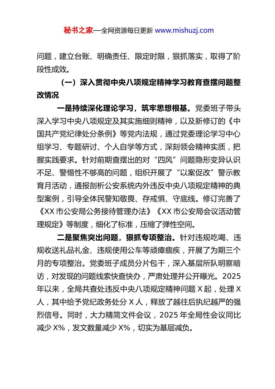 秘书之家—全网资源每日更新 www.mishuzj.comXX 市公安局党委班子 2025 年度民主生活会对照检查材料根据市委关于开好 2025 年度民主生活会的统一部署和要求,市公安局党委班子紧紧围绕“学思想、强党性、重实践、建新功”的总要求,聚焦“带头强化政治忠诚、提高政治能力,带头固本培元、增强党性,带头敬畏人民、敬畏组织、敬畏法纪,带头干事创业、担当作为,带头坚决扛起管党治党责任”等五个方面,结合公安工作实际,特别是对照习近平总书记关于政法工作、公安工作的重要指示批示精神,深入贯彻中央八项规定及其实施细则精神,严格落实意识形态工作责任制,针对上级巡视巡察、环保督察、统计督察、审计监督、政治生态分析研判反馈问题,以及整治违规吃喝、违规打牌赌博、调研考察中的形式主义等突出问题整改情况,在深入学习研讨、广泛征求意见、深入谈心谈话的基础上,坚持把自己摆进去、把职责摆进去、把工作摆进去,严肃认真开展了对照检查,深刻剖析了问题根源,明确了努力方向和整改措施。现将局党委班子对照检查情况报告如下:一、有关问题整改落实情况局党委班子坚持把问题整改作为重大政治任务来抓,对上年度民主生活会、有关专题民主生活会查摆的问题,以及中央八项规定精神学习教育、各类督察检查反馈中需持续整改的秘书之家—全网资源每日更新 www.mishuzj.com问题,建立台账、明确责任、限定时限,狠抓落实,取得了阶段性成效。(一)深入贯彻中央八项规定精神学习教育查摆问题整改情况一是持续深化理论学习,筑牢思想根基。党委班子带头深入学习中央八项规定及其实施细则精神,以及新修订的《中国共产党纪律处分条例》等党内法规,通过党委理论学习中心组学习、专题研讨、个人自学等方式,深刻领会精神实质,把握实践要求。针对前期查摆出的对“四风”问题隐形变异认识不足、警惕性不够高的问题,组织开展了“以案促改”警示教育月活动,通报剖析公安系统内外违反中央八项规定精神的典型案例,引导全体民警知敬畏、存戒惧、守底线。修订完善了《XX 市公安局公务接待管理办法》《XX 市公安局会议活动管理规定》等制度,细化了标准,压缩了弹性空间。二是聚焦突出问题,狠抓专项整治。针对违规吃喝、违规收送礼品礼金、违规使用公车等顽瘴痼疾,开展了为期三个月的专项整治。党委班子成员分片包干,深入基层所队明察暗访,对发现的问题线索快查快办,严肃处理并公开曝光。2025年以来,全局共查处违反中央八项规定精神问题 X 起,处理 X人,其中给予党纪政务处分 X 人,释放了越往后执纪越严的强烈信号。同时,大力精简文件会议,2025 年全局性会议同比减少 X%,发文数量减少 X%,切实为基层减负。秘书之家—全网资源每日更新 www.mishuzj.com三是健全长效机制,巩固整改成果。坚持“当下改”与“长久立”相结合,在抓好集中整治的同时,注重从制度机制上堵塞漏洞。建立了作风建设常态化分析研判机制,每季度对全局“四风”问题新动向进行分析,提出针对性防治措施。完善了内部审计和警务督察联动机制,加强对“三公”经费、基建项目、采购招标等重点领域的监督。推动信息化手段在作风建设中的应用,升级了公务用车监管平台,实现了全程在线审批、轨迹可溯。(二)2024 年度民主生活会查摆问题整改情况一是在提升政治能力方面。针对上年度查摆出的运用党的创新理论指导公安实践不够深入、政治判断力、政治领悟力、政治执行力有待加强的问题,党委班子制定并严格执行年度理论学习计划,将学习贯彻习近平新时代中国特色社会主义思想特别是习近平法治思想、习近平总书记关于新时代公安工作的重要论述作为首要政治任务。2025 年共组织党委理论学习中心组学习 X 次,举办政治轮训班 X 期,覆盖局机关处室和分局领导班子成员。建立健全了“第一议题”制度,及时传达学习习近平总书记最新重要讲话和指示批示精神,并研究制定贯彻落实措施。在重大安保任务、复杂敏感案件处理中,首先从政治上看,自觉同党中央决策部署对标对表,确保公安工作始终沿着正确政治方向前进。二是在强化担当作为方面。针对上年度提出的攻坚克难秘书之家—全网资源每日更新...