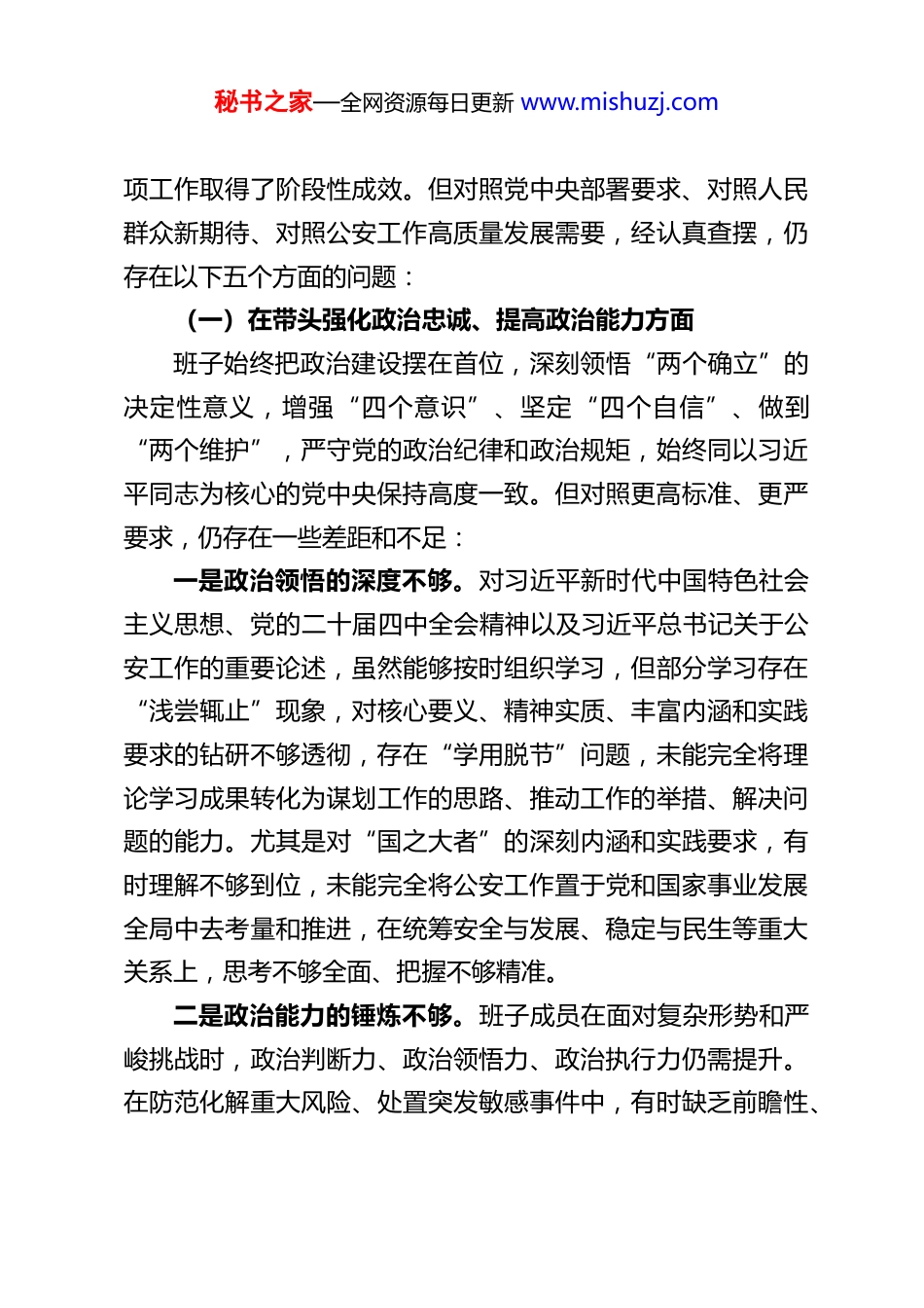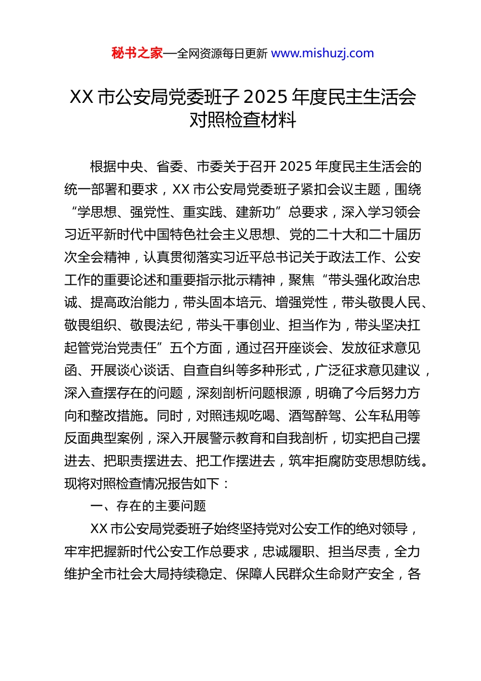 秘书之家—全网资源每日更新 www.mishuzj.comXX 市公安局党委班子 2025 年度民主生活会对照检查材料根据中央、省委、市委关于召开 2025 年度民主生活会的统一部署和要求,XX 市公安局党委班子紧扣会议主题,围绕“学思想、强党性、重实践、建新功”总要求,深入学习领会习近平新时代中国特色社会主义思想、党的二十大和二十届历次全会精神,认真贯彻落实习近平总书记关于政法工作、公安工作的重要论述和重要指示批示精神,聚焦“带头强化政治忠诚、提高政治能力,带头固本培元、增强党性,带头敬畏人民、敬畏组织、敬畏法纪,带头干事创业、担当作为,带头坚决扛起管党治党责任”五个方面,通过召开座谈会、发放征求意见函、开展谈心谈话、自查自纠等多种形式,广泛征求意见建议,深入查摆存在的问题,深刻剖析问题根源,明确了今后努力方向和整改措施。同时,对照违规吃喝、酒驾醉驾、公车私用等反面典型案例,深入开展警示教育和自我剖析,切实把自己摆进去、把职责摆进去、把工作摆进去,筑牢拒腐防变思想防线。现将对照检查情况报告如下:一、存在的主要问题XX 市公安局党委班子始终坚持党对公安工作的绝对领导,牢牢把握新时代公安工作总要求,忠诚履职、担当尽责,全力维护全市社会大局持续稳定、保障人民群众生命财产安全,各秘书之家—全网资源每日更新 www.mishuzj.com项工作取得了阶段性成效。但对照党中央部署要求、对照人民群众新期待、对照公安工作高质量发展需要,经认真查摆,仍存在以下五个方面的问题:(一)在带头强化政治忠诚、提高政治能力方面班子始终把政治建设摆在首位,深刻领悟“两个确立”的决定性意义,增强“四个意识”、坚定“四个自信”、做到“两个维护”,严守党的政治纪律和政治规矩,始终同以习近平同志为核心的党中央保持高度一致。但对照更高标准、更严要求,仍存在一些差距和不足:一是政治领悟的深度不够。对习近平新时代中国特色社会主义思想、党的二十届四中全会精神以及习近平总书记关于公安工作的重要论述,虽然能够按时组织学习,但部分学习存在“浅尝辄止”现象,对核心要义、精神实质、丰富内涵和实践要求的钻研不够透彻,存在“学用脱节”问题,未能完全将理论学习成果转化为谋划工作的思路、推动工作的举措、解决问题的能力。尤其是对“国之大者”的深刻内涵和实践要求,有时理解不够到位,未能完全将公安工作置于党和国家事业发展全局中去考量和推进,在统筹安全与发展、稳定与民生等重大关系上,思考不够全面、把握不够精准。二是政治能力的锤炼不够。班子成员在面对复杂形势和严峻挑战时,政治判断力、政治领悟力、政治执行力仍需提升。在防范化解重大风险、处置突发敏感事件中,有时缺乏前瞻性、秘书之家—全网资源每日更新 www.mishuzj.com主动性,对一些苗头性、倾向性问题察觉不够敏锐,未能及时从政治高度分析研判、防范处置,政治敏锐性和政治鉴别力有待进一步增强。对社会上出现的一些错误思潮、模糊认识,以及网络空间中的杂音噪音,虽然能够保持基本立场,但有时缺乏第一时间从政治高度洞察其本质、研判其风险的敏锐性,主动引导、坚决抵制的力度不够。三是贯彻落实党中央决策部署的力度不够。在落实党中央关于公安工作的大政方针和决策部署时,有时存在“上热中温下冷”的现象,部分工作部署多、跟踪问效少,推进力度不够、落实成效不够明显。尤其是在推动公安改革、基层基础建设等重点工作中,存在“按部就班”推进、缺乏创新突破的问题,未能结合 XX 市实际情况创造性地开展工作,确保党中央精神在公安系统落地生根、开花结果的政治执行力有待进一步增强。在意识形态工作责任制落实上,对分管领域的阵地管理、风险排查、人员思想动态掌握,有时抓得不够紧、不够实,主动设置议题、有效引导舆论的能力有待加强。四是政治纪律和政治规矩的执行不够严格。虽然能够严格遵守党的政治纪律和政治规矩,但在日常工作中,对一些细节问题重视不够,比如在落实“重大事项请示报告制度”时,有时存在报告不及时、内容不全面的情况;在党内政治生活中,有时存在批评与自我批评不够严肃认真的问题,辣味不足,未能真...