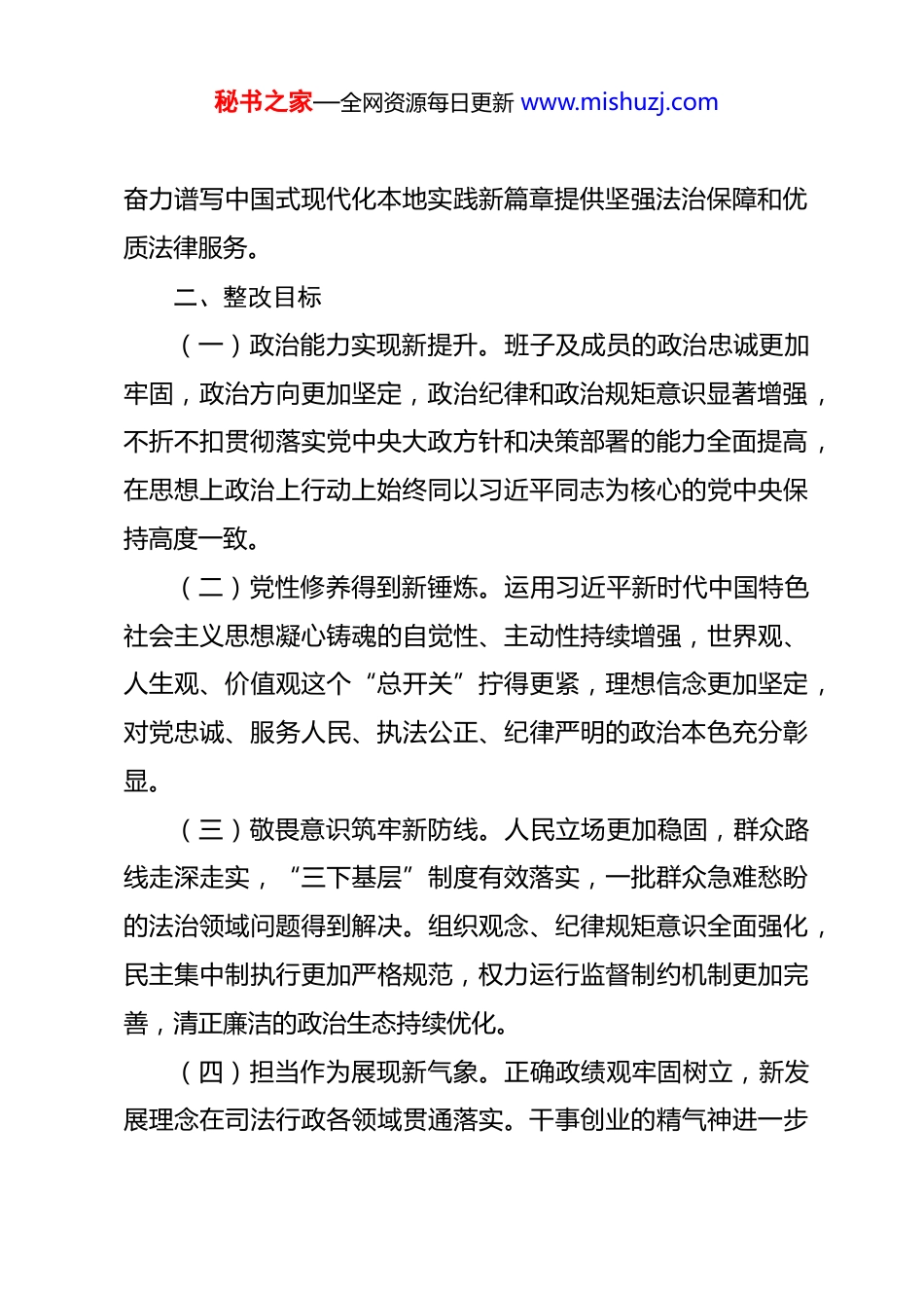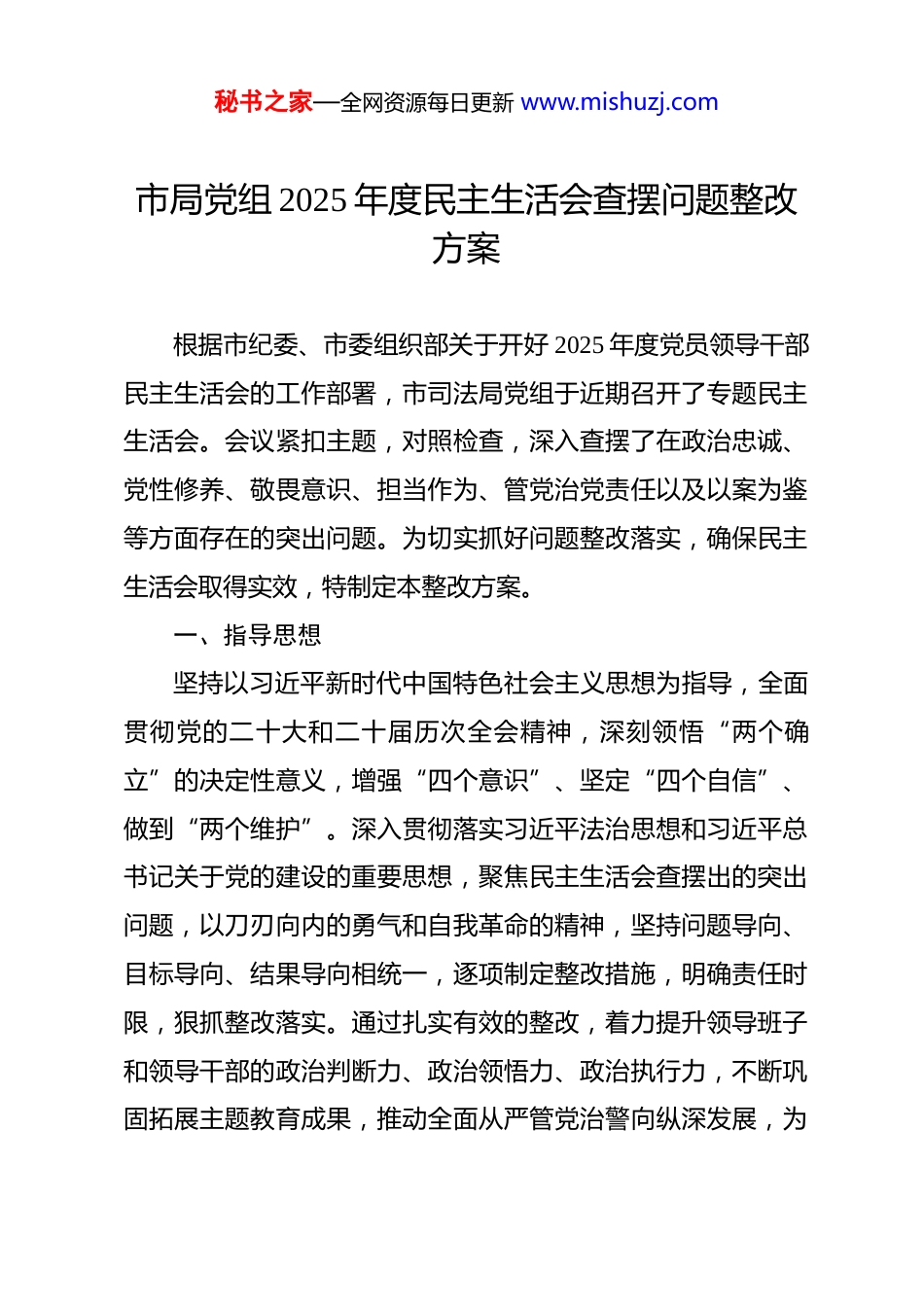 秘书之家—全网资源每日更新 www.mishuzj.com市局党组 2025 年度民主生活会查摆问题整改方案 根据市纪委、市委组织部关于开好 2025 年度党员领导干部民主生活会的工作部署,市司法局党组于近期召开了专题民主生活会。会议紧扣主题,对照检查,深入查摆了在政治忠诚、党性修养、敬畏意识、担当作为、管党治党责任以及以案为鉴等方面存在的突出问题。为切实抓好问题整改落实,确保民主生活会取得实效,特制定本整改方案。一、指导思想坚持以习近平新时代中国特色社会主义思想为指导,全面贯彻党的二十大和二十届历次全会精神,深刻领悟“两个确立”的决定性意义,增强“四个意识”、坚定“四个自信”、做到“两个维护”。深入贯彻落实习近平法治思想和习近平总书记关于党的建设的重要思想,聚焦民主生活会查摆出的突出问题,以刀刃向内的勇气和自我革命的精神,坚持问题导向、目标导向、结果导向相统一,逐项制定整改措施,明确责任时限,狠抓整改落实。通过扎实有效的整改,着力提升领导班子和领导干部的政治判断力、政治领悟力、政治执行力,不断巩固拓展主题教育成果,推动全面从严管党治警向纵深发展,为秘书之家—全网资源每日更新 www.mishuzj.com奋力谱写中国式现代化本地实践新篇章提供坚强法治保障和优质法律服务。二、整改目标(一)政治能力实现新提升。班子及成员的政治忠诚更加牢固,政治方向更加坚定,政治纪律和政治规矩意识显著增强,不折不扣贯彻落实党中央大政方针和决策部署的能力全面提高,在思想上政治上行动上始终同以习近平同志为核心的党中央保持高度一致。(二)党性修养得到新锤炼。运用习近平新时代中国特色社会主义思想凝心铸魂的自觉性、主动性持续增强,世界观、人生观、价值观这个“总开关”拧得更紧,理想信念更加坚定,对党忠诚、服务人民、执法公正、纪律严明的政治本色充分彰显。(三)敬畏意识筑牢新防线。人民立场更加稳固,群众路线走深走实,“三下基层”制度有效落实,一批群众急难愁盼的法治领域问题得到解决。组织观念、纪律规矩意识全面强化,民主集中制执行更加严格规范,权力运行监督制约机制更加完善,清正廉洁的政治生态持续优化。(四)担当作为展现新气象。正确政绩观牢固树立,新发展理念在司法行政各领域贯通落实。干事创业的精气神进一步秘书之家—全网资源每日更新 www.mishuzj.com提振,斗争精神和斗争本领不断增强,防范化解重大风险能力切实提高,在服务高质量发展、深化基层治理、完成急难险重任务中贡献更多司法行政力量。(五)管党治党取得新成效。全面从严治党主体责任层层压实,严的基调、严的措施、严的氛围长期坚持。作风建设长效机制健全完善,形式主义、官僚主义得到有效整治,选人用人导向更加鲜明,风腐一体纠治深入推进,党员干部网络言行规范有序,司法行政队伍革命化、正规化、专业化、职业化水平显著提升。(六)以案促改形成新常态。反面典型案例的警示教育作用充分发挥,“以案说德、以案说纪、以案说法、以案说责”机制常态运行,党员干部廉洁从政的思想自觉和行动自觉全面增强,拒腐防变的思想堤坝更加牢固。三、整改措施针对民主生活会查摆出的突出问题,结合市司法局工作实际,制定以下六个方面整改措施。(一)聚焦强化政治忠诚、提升政治能力方面的整改措施存在的主要问题:理论武装的系统性、转化度有待加强,从政治高度审视、谋划、推进司法行政工作的自觉性需提升;贯彻落实中央决策部署与本地法治实践结合不够紧密,创造性秘书之家—全网资源每日更新 www.mishuzj.com落实存在差距;政治敏锐性和政治鉴别力需进一步锤炼,对意识形态领域复杂斗争的警惕性有待提高。1.深化理论武装铸魂工程,夯实绝对忠诚思想根基。坚持将学习习近平新时代中国特色社会主义思想作为党组会议“第一议题”、理论学习中心组学习“第一主题”、干部教育培训“第一课程”。制定并严格执行年度学习计划,确保班子成员每年至少参加 1 次为期不少于 5 天的集中读书班,带头撰写高质量学习体会和调研报告不少于 2 篇。重点深学细悟习近平法治思想,开展专题研讨不少于 4 次,深刻把握其核心要义、精神实...