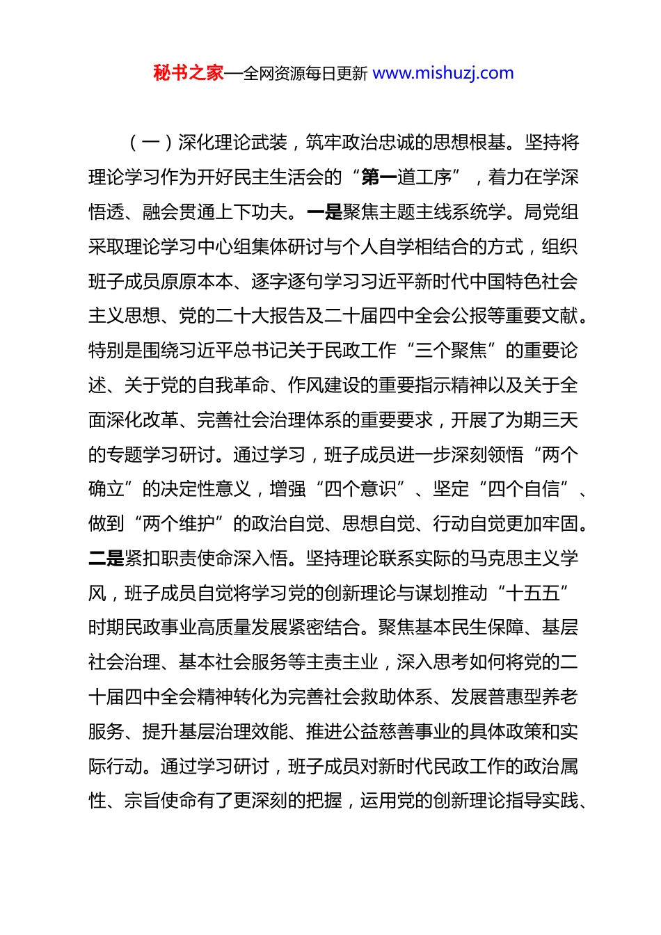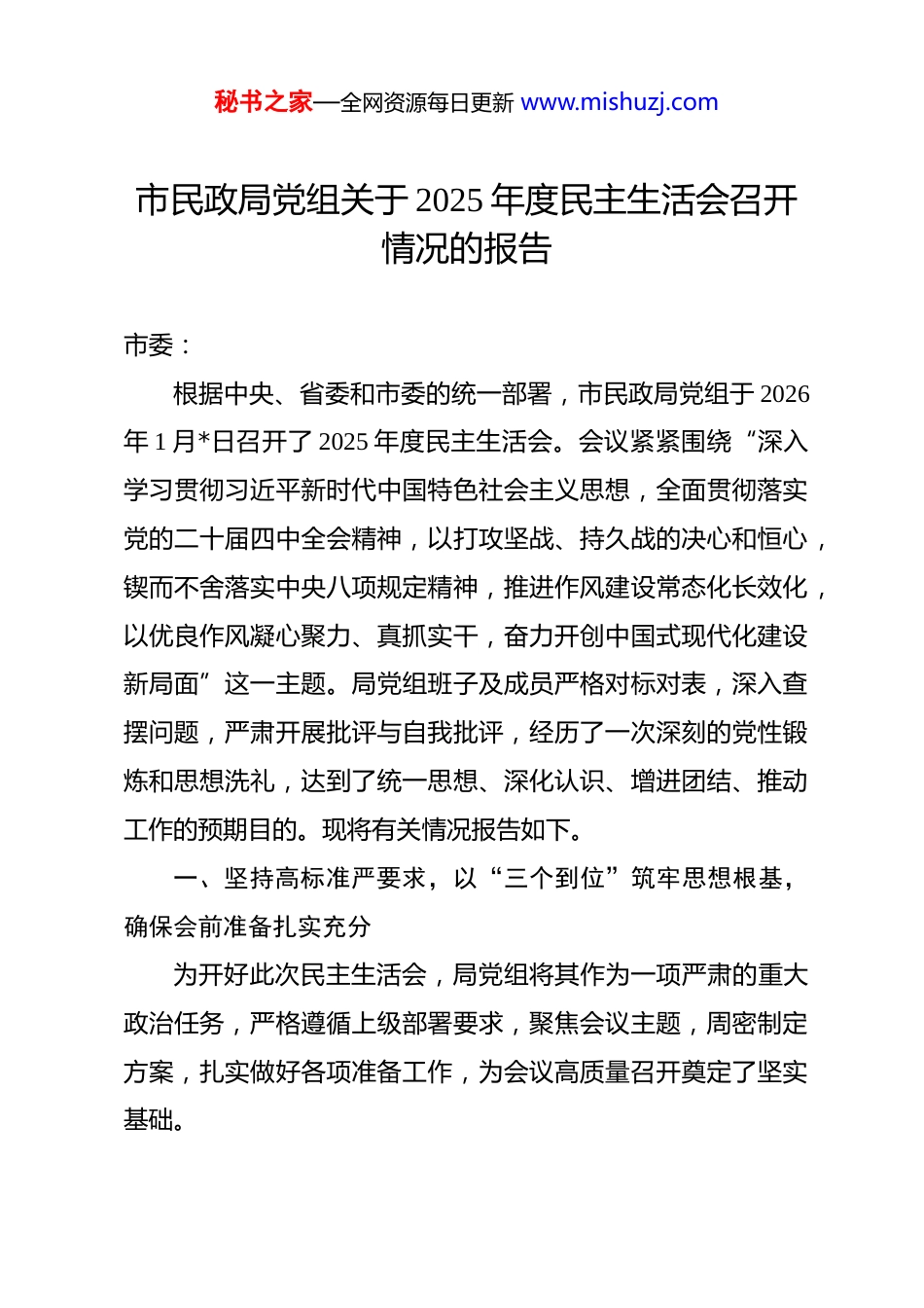 秘书之家—全网资源每日更新 www.mishuzj.com市民政局党组关于 2025 年度民主生活会召开情况的报告 市委:根据中央、省委和市委的统一部署,市民政局党组于 2026年 1 月*日召开了 2025 年度民主生活会。会议紧紧围绕“深入学习贯彻习近平新时代中国特色社会主义思想,全面贯彻落实党的二十届四中全会精神,以打攻坚战、持久战的决心和恒心,锲而不舍落实中央八项规定精神,推进作风建设常态化长效化,以优良作风凝心聚力、真抓实干,奋力开创中国式现代化建设新局面”这一主题。局党组班子及成员严格对标对表,深入查摆问题,严肃开展批评与自我批评,经历了一次深刻的党性锻炼和思想洗礼,达到了统一思想、深化认识、增进团结、推动工作的预期目的。现将有关情况报告如下。一、坚持高标准严要求,以“三个到位”筑牢思想根基,确保会前准备扎实充分为开好此次民主生活会,局党组将其作为一项严肃的重大政治任务,严格遵循上级部署要求,聚焦会议主题,周密制定方案,扎实做好各项准备工作,为会议高质量召开奠定了坚实基础。秘书之家—全网资源每日更新 www.mishuzj.com(一)深化理论武装,筑牢政治忠诚的思想根基。坚持将理论学习作为开好民主生活会的“第一道工序”,着力在学深悟透、融会贯通上下功夫。一是聚焦主题主线系统学。局党组采取理论学习中心组集体研讨与个人自学相结合的方式,组织班子成员原原本本、逐字逐句学习习近平新时代中国特色社会主义思想、党的二十大报告及二十届四中全会公报等重要文献。特别是围绕习近平总书记关于民政工作“三个聚焦”的重要论述、关于党的自我革命、作风建设的重要指示精神以及关于全面深化改革、完善社会治理体系的重要要求,开展了为期三天的专题学习研讨。通过学习,班子成员进一步深刻领悟“两个确立”的决定性意义,增强“四个意识”、坚定“四个自信”、做到“两个维护”的政治自觉、思想自觉、行动自觉更加牢固。二是紧扣职责使命深入悟。坚持理论联系实际的马克思主义学风,班子成员自觉将学习党的创新理论与谋划推动“十五五”时期民政事业高质量发展紧密结合。聚焦基本民生保障、基层社会治理、基本社会服务等主责主业,深入思考如何将党的二十届四中全会精神转化为完善社会救助体系、发展普惠型养老服务、提升基层治理效能、推进公益慈善事业的具体政策和实际行动。通过学习研讨,班子成员对新时代民政工作的政治属性、宗旨使命有了更深刻的把握,运用党的创新理论指导实践、秘书之家—全网资源每日更新 www.mishuzj.com破解难题的能力得到提升。三是巩固教育成果对标查。紧密结合巩固拓展党纪学习教育成果和深入开展中央八项规定精神学习教育的要求,班子成员重温《中国共产党章程》《关于新形势下党内政治生活的若干准则》等党内法规,学习中央和省委、市委关于加强作风建设的最新部署。大家对照党章党规党纪,对照初心使命,对照先进典型,深入检视自身在理想信念、政治纪律、作风建设等方面存在的差距,为撰写对照检查材料、开展自我批评做好了充分的思想准备和理论储备。(二)广纳意见建议,找准制约发展的症结所在。坚持开门搞活动,以海纳百川的胸襟广泛听取各方面意见建议,确保查摆问题精准聚焦、有的放矢。一是渠道多元“全面听”。局党组通过设立线上线下意见箱、发布征求意见公告、发放征求意见表等多种形式,面向全局系统党员干部职工、离退休老同志、各县(市、区)民政部门以及市直相关单位广泛征集意见。特别是充分利用数字化平台,开通线上“码上提”功能,方便服务对象和社会公众随时反映问题、提出建议。通过多种渠道,累计收集到原始意见建议百余条,内容涵盖养老服务、社会救助、儿童福利、社区治理、社会组织管理、殡葬服务等多个领域,确保了征求意见的广泛性。二是深入基层“当面听”。班子成员摒弃“办公室听汇报”的作风,主动沉下去,由党组成秘书之家—全网资源每日更新 www.mishuzj.com员分别带队,组成多个调研组,深入乡镇(街道)敬老院、城乡社区日间照料中心、困难群众家庭、社会组织孵化基地等基层一线和民政服务机构。通过召开座谈会、个别访谈、实地走访等形式,与基...