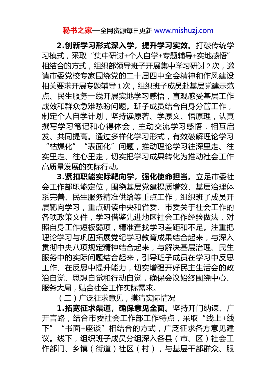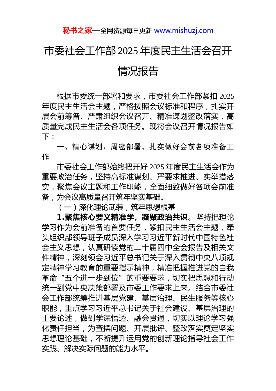 秘书之家—全网资源每日更新 www.mishuzj.com市委社会工作部 2025 年度民主生活会召开情况报告根据市委统一部署和要求,市委社会工作部紧扣 2025年度民主生活会主题,严格按照会议标准和程序,扎实开展会前筹备、严肃组织会议召开、精准谋划整改落实,高质量完成民主生活会各项任务。现将会议召开情况报告如下:一、精心谋划、周密部署,扎实做好会前各项准备工作市委社会工作部始终把开好 2025 年度民主生活会作为重要政治任务,坚持高标准谋划、严要求推进、实举措落实,聚焦会议主题和工作职能,全面细致做好各项会前准备,为会议高质量召开筑牢坚实基础。(一)深化理论武装,筑牢思想根基1.聚焦核心要义精准学,凝聚政治共识。坚持把理论学习作为会前准备的首要任务,紧扣民主生活会主题,牵头组织部领导班子成员深入学习习近平新时代中国特色社会主义思想,认真研读党的二十届四中全会报告及相关文件精神,深刻领会习近平总书记关于深入贯彻中央八项规定精神学习教育的重要指示精神,精准把握推进党的自我革命“五个进一步到位”的重要要求,切实把思想和行动统一到党中央决策部署及市委工作要求上来。结合市委社会工作部统筹推进基层党建、基层治理、民生服务等核心职能,重点学习习近平总书记关于社会建设、基层治理的重要论述,做到学深悟透、融会贯通,切实以理论学习强化责任担当,为查摆问题、开展批评、整改落实奠定坚实思想理论基础,不断提升运用党的创新理论指导社会工作实践、解决实际问题的能力水平。秘书之家—全网资源每日更新 www.mishuzj.com2.创新学习形式深入学,提升学习实效。打破传统学习模式,采取“集中研讨+个人自学+专题辅导+实地感悟”相结合的方式,组织部领导班子开展集中学习研讨 2 次,邀请市委党校专家围绕党的二十届四中全会精神和作风建设相关要求开展专题辅导 1 次,组织班子成员赴基层党建示范点、民生服务一线开展实地学习感悟,直观感受基层工作成效和群众急难愁盼问题。班子成员结合自身分管工作,制定个人自学计划,坚持读原著、学原文、悟原理,认真撰写学习笔记和心得体会,主动交流学习感悟,相互启发、共同提高。通过多样化学习形式,有效破解理论学习“枯燥化”“表面化”问题,推动理论学习往深里走、往实里走、往心里走,切实把学习成果转化为推动社会工作高质量发展的实际行动。3.紧扣职能实际靶向学,强化使命担当。立足市委社会工作部职能定位,围绕基层党建提质增效、基层治理体系完善、民生服务精准供给等重点工作,组织班子成员开展靶向学习,重点研读中央和省委、市委关于社会工作的各项政策文件,学习借鉴先进地区社会工作经验做法,对照自身工作短板弱项,精准查找学习差距和不足。注重把理论学习与巩固拓展党纪学习教育成果结合起来,与深入贯彻中央八项规定精神结合起来,与解决基层治理、民生服务中的实际问题结合起来,引导班子成员在学习中反思工作、在反思中提升能力,切实增强开好民主生活会的政治自觉、思想自觉和行动自觉,确保会议始终围绕中心、服务大局,贴合社会工作实际需求。(二)广泛征求意见,摸清实际情况1.拓宽征求渠道,确保意见全面。坚持开门纳谏、广开言路,结合市委社会工作部工作特点,采取“线上+线下”“书面+座谈”相结合的方式,广泛征求各方意见建议。线下,组织班子成员分组深入各县(市、区)社会工作部门、乡镇(街道)社区(村),与基层干部群众、服秘书之家—全网资源每日更新 www.mishuzj.com务对象面对面座谈交流;线上,通过官方网站、微信公众号发布征求意见公告,开通意见反馈渠道。同时,主动向市委相关部门、兄弟单位、基层党组织征求意见建议,全方位、多角度、深层次了解部领导班子及成员在思想、工作、作风、廉洁等方面存在的问题和不足,确保征求意见全覆盖、无死角。2.严格梳理汇总,确保问题精准。安排专人负责意见建议的收集、梳理和汇总工作,严格按照“原汁原味、实事求是”的原则,对收集到的意见建议进行分类整理,重点梳理出基层党建、基层治理、民生服务、作风建设等方面的突出问题。对模糊不清、表述不具体的意见建议,及时与相关单位和个人...