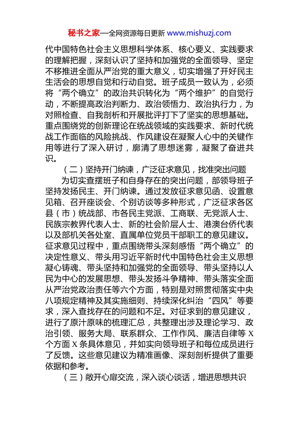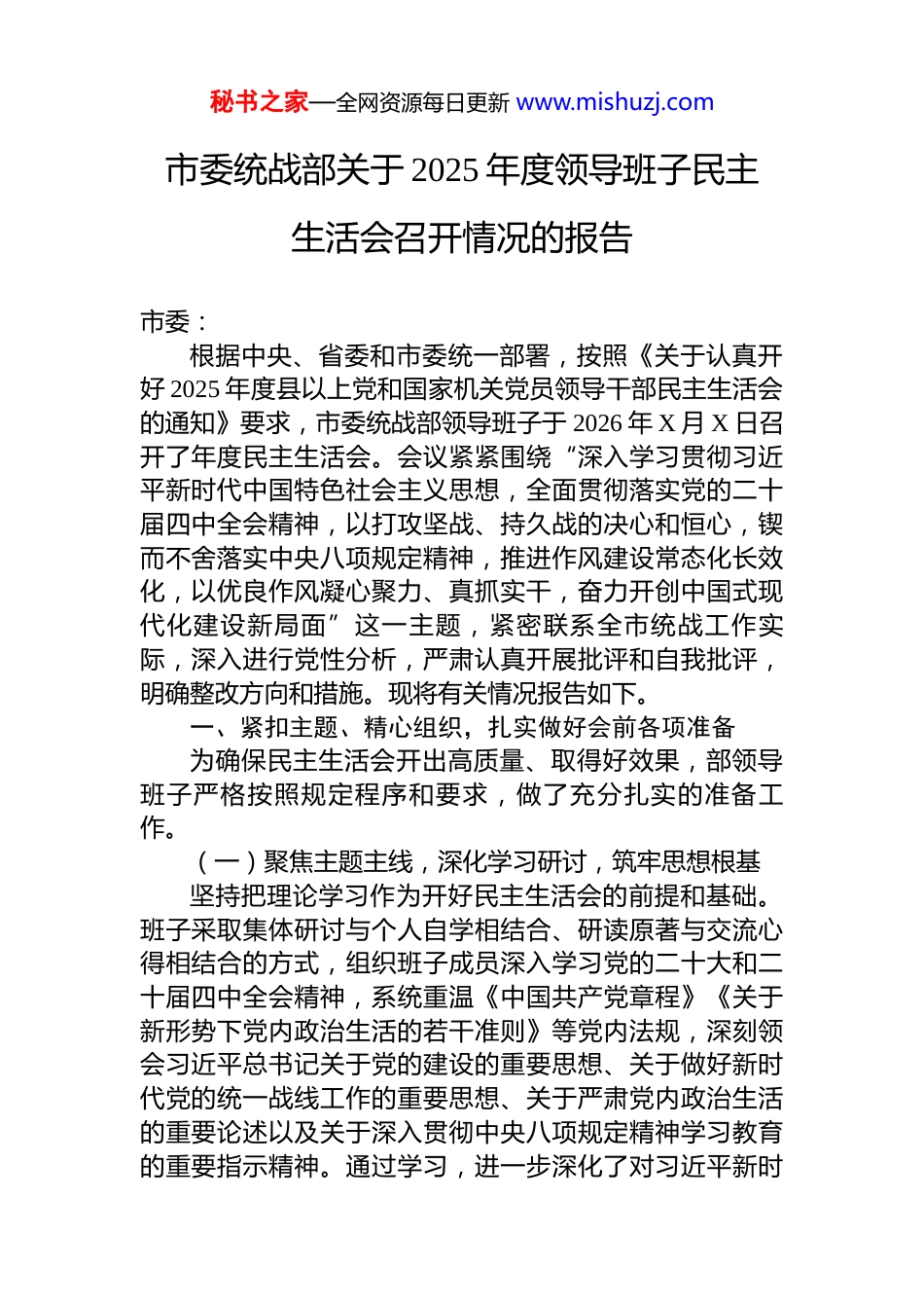 秘书之家—全网资源每日更新 www.mishuzj.com市委统战部关于 2025 年度领导班子民主生活会召开情况的报告市委:根据中央、省委和市委统一部署,按照《关于认真开好 2025 年度县以上党和国家机关党员领导干部民主生活会的通知》要求,市委统战部领导班子于 2026 年 X 月 X 日召开了年度民主生活会。会议紧紧围绕“深入学习贯彻习近平新时代中国特色社会主义思想,全面贯彻落实党的二十届四中全会精神,以打攻坚战、持久战的决心和恒心,锲而不舍落实中央八项规定精神,推进作风建设常态化长效化,以优良作风凝心聚力、真抓实干,奋力开创中国式现代化建设新局面”这一主题,紧密联系全市统战工作实际,深入进行党性分析,严肃认真开展批评和自我批评,明确整改方向和措施。现将有关情况报告如下。一、紧扣主题、精心组织,扎实做好会前各项准备为确保民主生活会开出高质量、取得好效果,部领导班子严格按照规定程序和要求,做了充分扎实的准备工作。(一)聚焦主题主线,深化学习研讨,筑牢思想根基坚持把理论学习作为开好民主生活会的前提和基础。班子采取集体研讨与个人自学相结合、研读原著与交流心得相结合的方式,组织班子成员深入学习党的二十大和二十届四中全会精神,系统重温《中国共产党章程》《关于新形势下党内政治生活的若干准则》等党内法规,深刻领会习近平总书记关于党的建设的重要思想、关于做好新时代党的统一战线工作的重要思想、关于严肃党内政治生活的重要论述以及关于深入贯彻中央八项规定精神学习教育的重要指示精神。通过学习,进一步深化了对习近平新时秘书之家—全网资源每日更新 www.mishuzj.com代中国特色社会主义思想科学体系、核心要义、实践要求的理解把握,深刻认识了坚持和加强党的全面领导、坚定不移推进全面从严治党的重大意义,切实增强了开好民主生活会的思想自觉和行动自觉。班子成员一致认为,必须将“两个确立”的政治共识转化为“两个维护”的自觉行动,不断提高政治判断力、政治领悟力、政治执行力,为对照检查、自我剖析和开展批评打下了坚实的思想基础。重点围绕党的创新理论在统战领域的实践要求、新时代统战工作面临的风险挑战、作风建设在凝聚人心中的关键作用等进行了深入研讨,廓清了思想迷雾,凝聚了奋进共识。(二)坚持开门纳谏,广泛征求意见,找准突出问题为切实查摆班子和自身存在的突出问题,部领导班子坚持发扬民主、开门纳谏。通过发放征求意见函、设置意见箱、召开座谈会、个别访谈等多种形式,广泛征求各区县(市)统战部、市各民主党派、工商联、无党派人士、民族宗教界代表人士、新的社会阶层人士、港澳台侨代表以及部机关各处室、直属单位党员干部职工的意见建议。征求意见过程中,重点围绕带头深刻感悟“两个确立”的决定性意义、带头用习近平新时代中国特色社会主义思想凝心铸魂、带头坚持和加强党的全面领导、带头坚持以人民为中心的发展思想、带头发扬斗争精神、带头落实全面从严治党政治责任等六个方面,特别是对照贯彻落实中央八项规定精神及其实施细则、持续深化纠治“四风”等要求,深入查找存在的问题和不足。对征求到的意见建议,进行了原汁原味的梳理汇总,共整理出涉及理论学习、政治引领、服务大局、联系群众、工作作风、廉洁自律等 X个方面 X 条具体意见,并如实向领导班子和每位成员进行了反馈。这些意见建议为精准画像、深刻剖析提供了重要依据和参考。(三)敞开心扉交流,深入谈心谈话,增进思想共识秘书之家—全网资源每日更新 www.mishuzj.com认真落实“四必谈”要求,主要负责同志与班子成员之间、班子成员相互之间、班子成员与分管处室(单位)负责同志之间、主要负责同志及班子成员与本人组织关系所在党支部党员代表之间,普遍开展了谈心谈话。谈心谈话坚持一对一、面对面,既谈工作问题、也谈思想问题,既谈自身差距、也提醒对方不足,特别是对拟在会上提出的批评意见,进行了充分沟通和交换看法。谈话中,大家开诚布公、推心置腹,主动亮明自身存在的问题,诚恳指出对方的问题,相互交换对班子存在问题的看法,深入探讨解决问题的意见建议。通过深入的谈心谈话,大家交流...