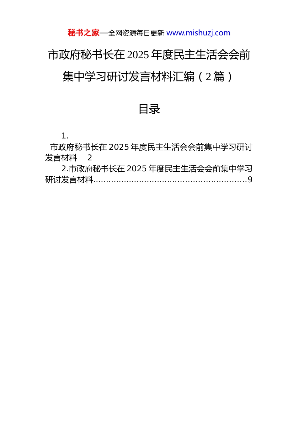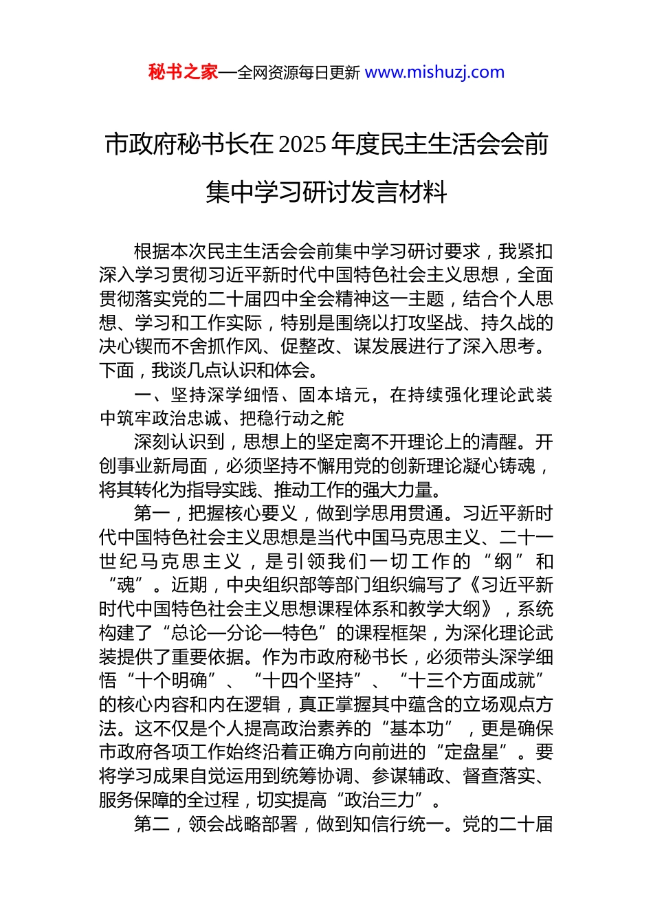 秘书之家—全网资源每日更新 www.mishuzj.com市政府秘书长在 2025 年度民主生活会会前集中学习研讨发言材料汇编(2 篇)目录1.市政府秘书长在 2025 年度民主生活会会前集中学习研讨发言材料22.市政府秘书长在 2025 年度民主生活会会前集中学习研讨发言材料............................................................9秘书之家—全网资源每日更新 www.mishuzj.com市政府秘书长在 2025 年度民主生活会会前集中学习研讨发言材料根据本次民主生活会会前集中学习研讨要求,我紧扣深入学习贯彻习近平新时代中国特色社会主义思想,全面贯彻落实党的二十届四中全会精神这一主题,结合个人思想、学习和工作实际,特别是围绕以打攻坚战、持久战的决心锲而不舍抓作风、促整改、谋发展进行了深入思考。下面,我谈几点认识和体会。一、坚持深学细悟、固本培元,在持续强化理论武装中筑牢政治忠诚、把稳行动之舵深刻认识到,思想上的坚定离不开理论上的清醒。开创事业新局面,必须坚持不懈用党的创新理论凝心铸魂,将其转化为指导实践、推动工作的强大力量。第一,把握核心要义,做到学思用贯通。习近平新时代中国特色社会主义思想是当代中国马克思主义、二十一世 纪 马 克 思 主 义 , 是 引 领 我 们 一 切 工 作 的 “ 纲 ” 和“魂”。近期,中央组织部等部门组织编写了《习近平新时代中国特色社会主义思想课程体系和教学大纲》,系统构建了“总论—分论—特色”的课程框架,为深化理论武装提供了重要依据。作为市政府秘书长,必须带头深学细悟“十个明确”、“十四个坚持”、“十三个方面成就”的核心内容和内在逻辑,真正掌握其中蕴含的立场观点方法。这不仅是个人提高政治素养的“基本功”,更是确保市政府各项工作始终沿着正确方向前进的“定盘星”。要将学习成果自觉运用到统筹协调、参谋辅政、督查落实、服务保障的全过程,切实提高“政治三力”。第二,领会战略部署,做到知信行统一。党的二十届秘书之家—全网资源每日更新 www.mishuzj.com四中全会为国家“十五五”时期发展擘画了宏伟蓝图。全会精神与总书记对内蒙古的重要讲话重要指示精神一脉相承,是我们谋划推进乌兰察布未来发展的总遵循。必须站在坚定捍卫“两个确立”、坚决做到“两个维护”的政治高度来学习领会。要深刻把握党中央关于当前形势的重大判断和关于推动高质量发展、深化改革开放、推进共同富裕等一系列战略任务。对于市政府办公厅而言,就是要紧紧围绕全会《建议》部署,自觉将其与乌兰察布发展实际紧密结合,将“十五五”规划建议中确定的各项目标任务,转化为我们起草文件、筹办会议、协调事务、推动落实的具体行动,确保党中央决策部署和自治区党委、市委工作要求不折不扣落地生根。第三,聚焦主责主业,提升服务效能。理论的价值在于指导实践。省政府办公厅提出要践行“五个坚持”,锚定“做得最好”标准,有效发挥“三服务”职能。这为我们树立了标杆。学习创新理论和全会精神,最终要落到“干”字上。我们必须聚焦市政府中心工作和全市发展大局,把学习成效转化为谋划工作的思路、破解难题的办法和推动发展的实效。要着力提升统筹协调的系统性、参谋服务的精准性、督促检查的实效性和服务保障的规范性,以高质量的政务运转服务保障全市高质量发展。二、保持战略定力、常抓不懈,以打攻坚战持久战的决心推进作风建设常态化长效化作风建设关系事业成败、人心向背。必须清醒认识到,“四风”问题具有顽固性、反复性,决不能有松劲歇脚、疲劳厌战的情绪。第一,树立“经常抓、深入抓、持久抓”的鲜明导向。中央党的建设工作领导小组会议强调,要牢固树立经常抓、深入抓、持久抓的思想观念。这要求我们必须克服“一阵风”思想,将作风建设深度融入日常工作和管理。要像江苏省常熟市等地那样,坚持经常性教育与集中性教秘书之家—全网资源每日更新 www.mishuzj.com育相结合,把作风要求贯穿于干部教育、管理、监督各环节。市政府办公厅作为中枢机关,作风形象具有风向标意义,必须标准更高、要求更严,带头弘扬勤勉务实、廉洁高效的新风正气。第二,紧盯“关键少数”和突...