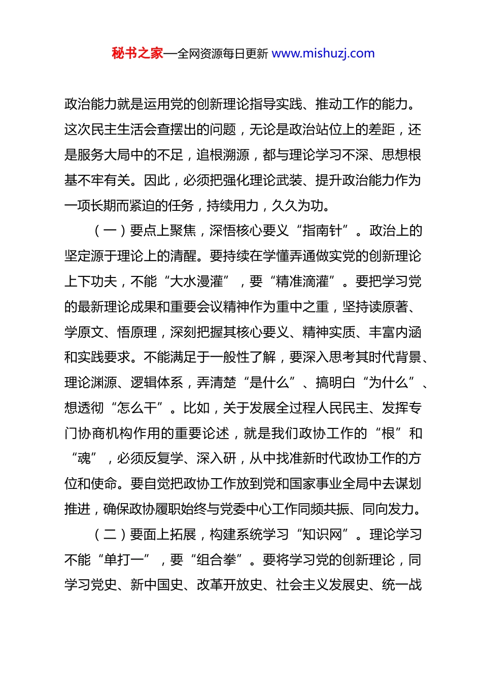 秘书之家—全网资源每日更新 www.mishuzj.com市政协党组书记、主席在市政协党组班子2025 年度民主生活会暨以案促改专题民主生活会上的总结讲话 同志们:刚才,我们召开了市政协党组班子 2025 年度民主生活会暨以案促改专题民主生活会。会议传达学习了相关精神,通报了有关整改落实情况,我代表党组班子作了对照检查,班子成员逐一进行了个人对照检查,大家敞开心扉、坦诚相见,开展了严肃认真的批评和自我批评。总的来看,这次民主生活会准备工作比较扎实,查摆问题比较深入,批评意见比较中肯,整改方向比较明确,达到了统一思想、增进团结、改进工作的预期目的。市纪委监委、市委组织部有关同志到会指导,给予了肯定,也提出了宝贵意见,我们要认真领会落实。开好民主生活会只是一个开端,关键在于做好“后半篇文章”,把会议成果转化为加强班子建设、推动政协工作的实际成效。下面,结合大家的发言和当前工作实际,我讲四点意见。一、扎深理论之根,筑牢政治忠诚的坚实基座思想是行动的先导,理论是实践的指南。只有理论上的清醒,才有政治上的坚定。对于我们政协党组班子而言,首要的秘书之家—全网资源每日更新 www.mishuzj.com政治能力就是运用党的创新理论指导实践、推动工作的能力。这次民主生活会查摆出的问题,无论是政治站位上的差距,还是服务大局中的不足,追根溯源,都与理论学习不深、思想根基不牢有关。因此,必须把强化理论武装、提升政治能力作为一项长期而紧迫的任务,持续用力,久久为功。(一)要点上聚焦,深悟核心要义“指南针”。政治上的坚定源于理论上的清醒。要持续在学懂弄通做实党的创新理论上下功夫,不能“大水漫灌”,要“精准滴灌”。要把学习党的最新理论成果和重要会议精神作为重中之重,坚持读原著、学原文、悟原理,深刻把握其核心要义、精神实质、丰富内涵和实践要求。不能满足于一般性了解,要深入思考其时代背景、理论渊源、逻辑体系,弄清楚“是什么”、搞明白“为什么”、想透彻“怎么干”。比如,关于发展全过程人民民主、发挥专门协商机构作用的重要论述,就是我们政协工作的“根”和“魂”,必须反复学、深入研,从中找准新时代政协工作的方位和使命。要自觉把政协工作放到党和国家事业全局中去谋划推进,确保政协履职始终与党委中心工作同频共振、同向发力。(二)要面上拓展,构建系统学习“知识网”。理论学习不能“单打一”,要“组合拳”。要将学习党的创新理论,同学习党史、新中国史、改革开放史、社会主义发展史、统一战秘书之家—全网资源每日更新 www.mishuzj.com线史、人民政协史结合起来,同学习经济、政治、文化、社会、生态文明等各方面知识结合起来,同学习宪法法律、政协章程和统一战线理论政策结合起来。这样,才能构建起系统完备的知识体系,拓展思维的广度和深度,提升从政治高度观察分析经济社会问题的能力。党组理论学习中心组要发挥“头雁效应”,制定系统学习计划,丰富学习形式,不仅要“请进来”辅导,也要“走出去”调研,在理论与实践的结合中深化认识。班子成员要带头撰写学习心得、理论文章,在思想交流碰撞中提升学习成效。(三)要体上贯通,锻造知行合一“转化器”。学习的最终目的在于运用。要坚持理论联系实际的马克思主义学风,大力弘扬“四下基层”优良传统,带着问题学、联系实际思、对准工作用。要把学习成果转化为坚定的政治信仰,深刻领悟“两个确立”的决定性意义,增强“四个意识”、坚定“四个自信”、做到“两个维护”,始终在思想上政治上行动上同党中央保持高度一致,确保政协事业正确的政治方向。要把学习成果转化为科学的工作方法,学会运用贯穿其中的立场观点方法来研究新情况、解决新问题、总结新经验。比如,在谋划年度协商计划、开展专题调研时,要自觉运用系统思维、辩证思维,抓住主要矛盾和矛盾的主要方面,提升建言靶向性和实效秘书之家—全网资源每日更新 www.mishuzj.com性。要把学习成果转化为履职的实际成效,紧扣党委政府中心工作,精准选择议题,深入协商议政,强化民主监督,广泛凝聚共识,切实把学习成效体现到服务高质量发展的具体行动上。二、高扬整改之...