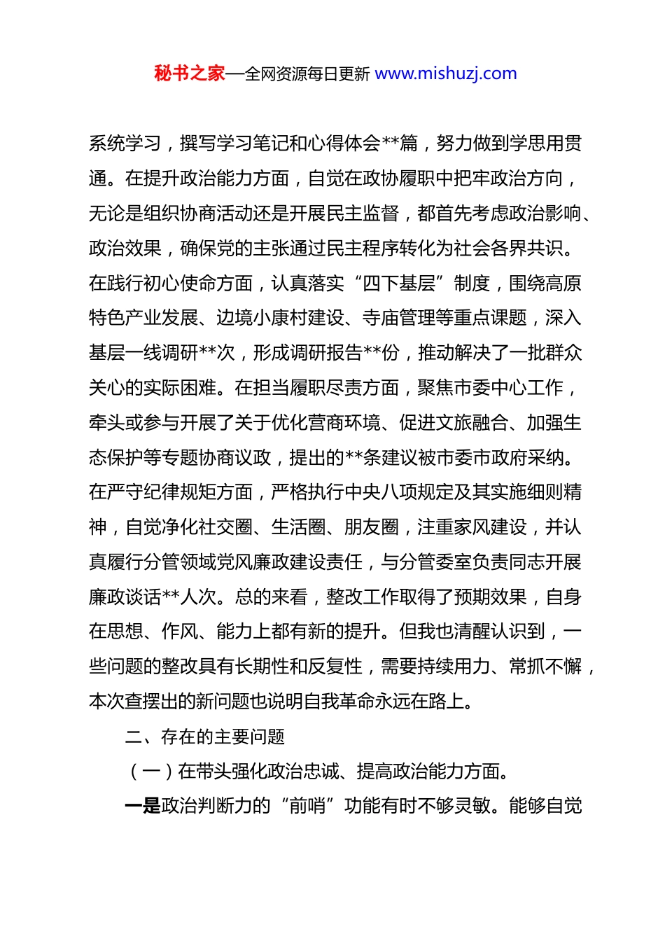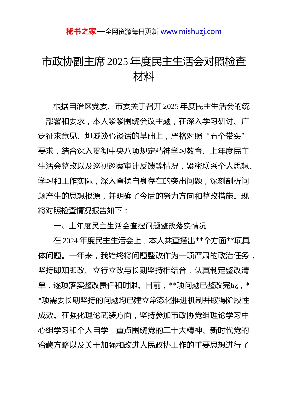 秘书之家—全网资源每日更新 www.mishuzj.com市政协副主席 2025 年度民主生活会对照检查材料 根据自治区党委、市委关于召开 2025 年度民主生活会的统一部署和要求,本人紧紧围绕会议主题,在深入学习研讨、广泛征求意见、坦诚谈心谈话的基础上,严格对照“五个带头”要求,结合深入贯彻中央八项规定精神学习教育、上年度民主生活会整改以及巡视巡察审计反馈等情况,紧密联系个人思想、学习和工作实际,深入查摆自身存在的突出问题,深刻剖析问题产生的思想根源,并明确了今后的努力方向和整改措施。现将对照检查情况报告如下:一、上年度民主生活会查摆问题整改落实情况在 2024 年度民主生活会上,本人共查摆出**个方面**项具体问题。一年来,我始终将问题整改作为一项严肃的政治任务,坚持即知即改、立行立改与长期坚持相结合,认真制定整改清单,逐项落实整改责任和时限。目前,**项问题已整改完成,**项需要长期坚持的问题均已建立常态化推进机制并取得阶段性成效。在强化理论武装方面,坚持参加市政协党组理论学习中心组学习和个人自学,重点围绕党的二十大精神、新时代党的治藏方略以及关于加强和改进人民政协工作的重要思想进行了秘书之家—全网资源每日更新 www.mishuzj.com系统学习,撰写学习笔记和心得体会**篇,努力做到学思用贯通。在提升政治能力方面,自觉在政协履职中把牢政治方向,无论是组织协商活动还是开展民主监督,都首先考虑政治影响、政治效果,确保党的主张通过民主程序转化为社会各界共识。在践行初心使命方面,认真落实“四下基层”制度,围绕高原特色产业发展、边境小康村建设、寺庙管理等重点课题,深入基层一线调研**次,形成调研报告**份,推动解决了一批群众关心的实际困难。在担当履职尽责方面,聚焦市委中心工作,牵头或参与开展了关于优化营商环境、促进文旅融合、加强生态保护等专题协商议政,提出的**条建议被市委市政府采纳。在严守纪律规矩方面,严格执行中央八项规定及其实施细则精神,自觉净化社交圈、生活圈、朋友圈,注重家风建设,并认真履行分管领域党风廉政建设责任,与分管委室负责同志开展廉政谈话**人次。总的来看,整改工作取得了预期效果,自身在思想、作风、能力上都有新的提升。但我也清醒认识到,一些问题的整改具有长期性和反复性,需要持续用力、常抓不懈,本次查摆出的新问题也说明自我革命永远在路上。二、存在的主要问题(一)在带头强化政治忠诚、提高政治能力方面。一是政治判断力的“前哨”功能有时不够灵敏。能够自觉秘书之家—全网资源每日更新 www.mishuzj.com在思想上政治上行动上同党中央保持高度一致,坚决维护党中央权威和集中统一领导。但在面对一些复杂社会思潮或网络舆论时,有时更多是从维护稳定角度考虑,从政治高度进行深度辨析、主动亮剑的斗争精神还显不足。例如,在意识形态领域,对政协平台上面临的潜在风险点,虽然心中有警惕,但系统性研判和前瞻性部署不够,未能完全做到防患于未然。二是政治领悟力的“转化”文章做得不够精准。对党中央的大政方针和区党委、市委的决策部署,能够及时学习传达,但在结合*实际、结合政协职能进行创造性落实上,思路和举措的创新性有待加强。比如,对“筑牢国家生态安全屏障”这一重大战略,更多地是组织委员视察调研、提出建议,如何发挥政协优势,更广泛地凝聚起全市各族各界群众共建美丽家园的思想共识和行动合力,方法还不够多、抓手还不够硬。三是政治执行力的“穿透”效果有待增强。贯彻落实上级决策部署态度是坚决的,但在推动落实过程中,有时存在“重程序、轻实效”的倾向。比如,在组织专题协商时,有时满足于会议开了、报告报了,但对协商成果转化的跟踪问效不够紧密,导致一些高质量的建议未能完全落地生根。在落实全面从严治党要求方面,对分管委室党员干部的日常政治教育和监督提醒,有时停留在会议部署和口头要求上,深入细致的政治体检做得不够经常。秘书之家—全网资源每日更新 www.mishuzj.com(二)在带头固本培元、增强党性方面。一是理论学习的“深耕细作”有差距。虽然能够坚持学习,但有时存在“实用主义”倾向,与分管工作联...