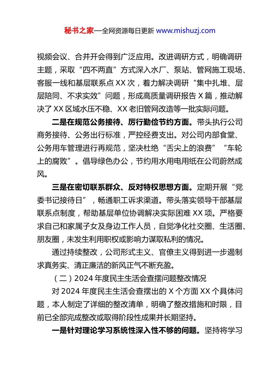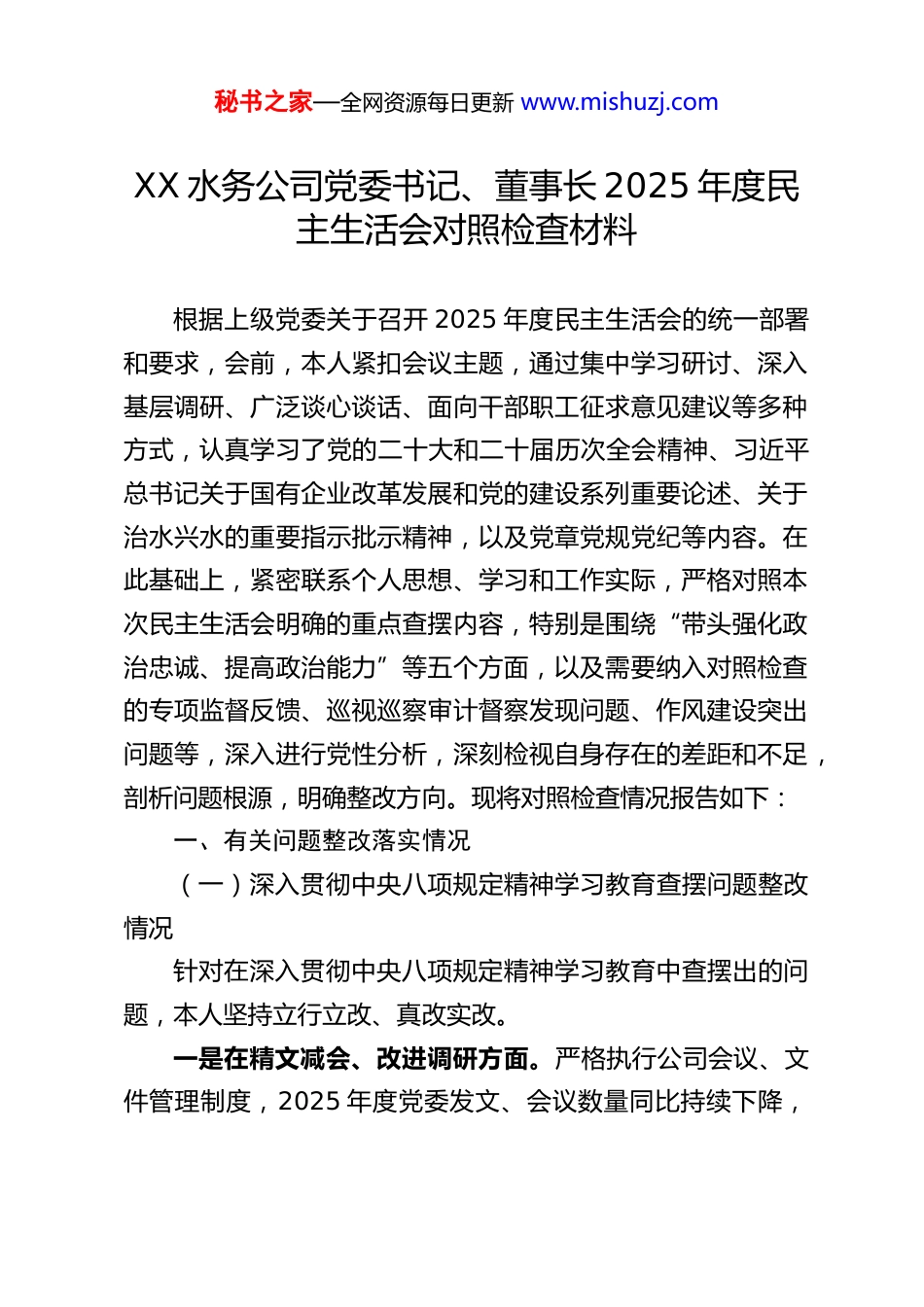 秘书之家—全网资源每日更新 www.mishuzj.comXX 水务公司党委书记、董事长 2025 年度民主生活会对照检查材料根据上级党委关于召开 2025 年度民主生活会的统一部署和要求,会前,本人紧扣会议主题,通过集中学习研讨、深入基层调研、广泛谈心谈话、面向干部职工征求意见建议等多种方式,认真学习了党的二十大和二十届历次全会精神、习近平总书记关于国有企业改革发展和党的建设系列重要论述、关于治水兴水的重要指示批示精神,以及党章党规党纪等内容。在此基础上,紧密联系个人思想、学习和工作实际,严格对照本次民主生活会明确的重点查摆内容,特别是围绕“带头强化政治忠诚、提高政治能力”等五个方面,以及需要纳入对照检查的专项监督反馈、巡视巡察审计督察发现问题、作风建设突出问题等,深入进行党性分析,深刻检视自身存在的差距和不足,剖析问题根源,明确整改方向。现将对照检查情况报告如下:一、有关问题整改落实情况(一)深入贯彻中央八项规定精神学习教育查摆问题整改情况针对在深入贯彻中央八项规定精神学习教育中查摆出的问题,本人坚持立行立改、真改实改。一是在精文减会、改进调研方面。严格执行公司会议、文件管理制度,2025 年度党委发文、会议数量同比持续下降,秘书之家—全网资源每日更新 www.mishuzj.com视频会议、合并开会得到广泛应用。改进调研方式,明确调研主题,采取“四不两直”方式深入水厂、泵站、管网施工现场、客服一线和基层联系点 XX 次,着力解决调研“集中扎堆、层层陪同、不求实效”问题,形成高质量调研报告 X 篇,推动解决了 XX 区域水压不稳、XX 老旧管网改造等一批实际问题。二是在规范公务接待、厉行勤俭节约方面。带头执行公司商务接待、公务出行标准,严控经费支出。对公司内部食堂、公务用车管理进行再规范,坚决杜绝“舌尖上的浪费”“车轮上的腐败”。倡导绿色办公,节约用水用电用纸在公司蔚然成风。三是在密切联系群众、反对特权思想方面。定期开展“党委书记接待日”,畅通职工诉求渠道。带头落实领导干部基层联系点制度,帮助基层单位协调解决实际困难 XX 项。严格要求自己和家属子女及身边工作人员,自觉净化社交圈、生活圈、朋友圈,未发生利用职权或影响力谋取私利的情况。通过持续整改,公司形式主义、官僚主义得到进一步遏制求真务实、清正廉洁的新风正气不断充盈。(二)2024 年度民主生活会查摆问题整改情况对 2024 年度民主生活会查摆出的 X 个方面 XX 个具体问题,本人制定了详细的整改清单,明确了整改措施和时限,目前已全部完成整改或取得阶段性成果并长期坚持。一是针对理论学习系统性深入性不够的问题。坚持将学习秘书之家—全网资源每日更新 www.mishuzj.com党的创新理论作为首要政治任务,制定并严格执行个人年度学习计划,2025 年参加党委理论学习中心组学习 XX 次,专题研讨 X 次,带头讲党课 X 次,撰写学习心得、理论文章 X 篇,对新时代治水思路、国企使命担当的认识更加深刻。二是针对推动水务高质量发展的战略谋划有待加强的问题牵头组织编制公司“十五五”发展规划前期研究,围绕城乡供水一体化、智慧水务建设、水资源集约节约利用、水环境治理等开展专题论证。推动实施 XX 水厂深度处理工艺改造、XX 区域供水管网互联互通工程等一批重点项目,公司供水保障能力和水质安全水平稳步提升。三是针对全面从严治党压力传导存在层层递减现象的问题认真履行第一责任人职责,主持召开党委会专题研究党建工作XX 次,听取纪委工作汇报 X 次,与班子成员、下级党组织书记开展廉政谈话 XX 人次。修订完善公司《廉政风险防控手册》,加强对工程项目、物资采购、选人用人等重点领域和关键环节的监督。支持纪委深化运用监督执纪“四种形态”2025 年公司各级开展提醒谈话 XX 人次。四是针对服务群众“最后一公里”仍有短板的问题。推动升级供水服务热线和线上服务平台,简化报装流程,压缩办理时限。投入 XX 万元实施 XX 片区老旧小区供水设施改造,惠及居民 XX 户。牵头解决历史遗留的 XX 小区水质投诉问题,用户满意度显著提高。秘书之家—全网资源每日...