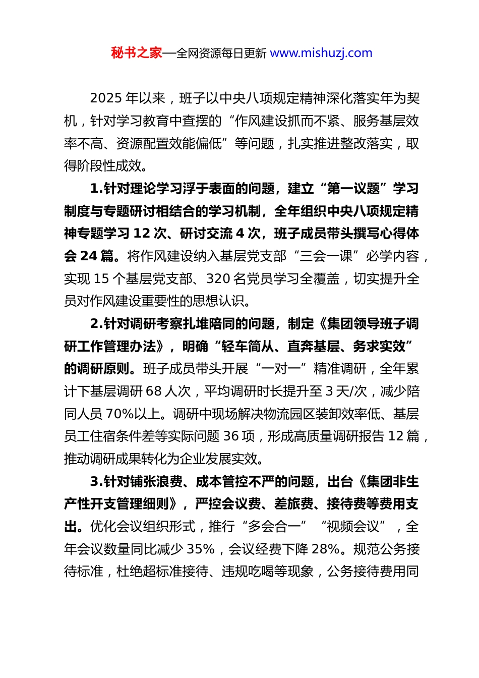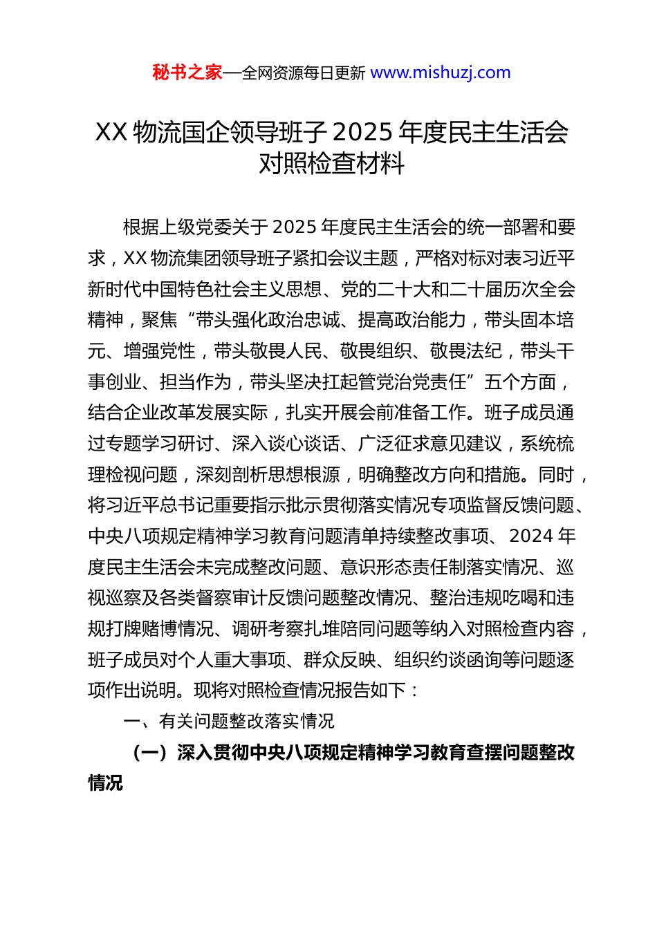 秘书之家—全网资源每日更新 www.mishuzj.comXX 物流国企领导班子 2025 年度民主生活会对照检查材料根据上级党委关于 2025 年度民主生活会的统一部署和要求,XX 物流集团领导班子紧扣会议主题,严格对标对表习近平新时代中国特色社会主义思想、党的二十大和二十届历次全会精神,聚焦“带头强化政治忠诚、提高政治能力,带头固本培元、增强党性,带头敬畏人民、敬畏组织、敬畏法纪,带头干事创业、担当作为,带头坚决扛起管党治党责任”五个方面,结合企业改革发展实际,扎实开展会前准备工作。班子成员通过专题学习研讨、深入谈心谈话、广泛征求意见建议,系统梳理检视问题,深刻剖析思想根源,明确整改方向和措施。同时,将习近平总书记重要指示批示贯彻落实情况专项监督反馈问题、中央八项规定精神学习教育问题清单持续整改事项、2024 年度民主生活会未完成整改问题、意识形态责任制落实情况、巡视巡察及各类督察审计反馈问题整改情况、整治违规吃喝和违规打牌赌博情况、调研考察扎堆陪同问题等纳入对照检查内容,班子成员对个人重大事项、群众反映、组织约谈函询等问题逐项作出说明。现将对照检查情况报告如下:一、有关问题整改落实情况(一)深入贯彻中央八项规定精神学习教育查摆问题整改情况秘书之家—全网资源每日更新 www.mishuzj.com2025 年以来,班子以中央八项规定精神深化落实年为契机,针对学习教育中查摆的“作风建设抓而不紧、服务基层效率不高、资源配置效能偏低”等问题,扎实推进整改落实,取得阶段性成效。1.针对理论学习浮于表面的问题,建立“第一议题”学习制度与专题研讨相结合的学习机制,全年组织中央八项规定精神专题学习 12 次、研讨交流 4 次,班子成员带头撰写心得体会 24 篇。将作风建设纳入基层党支部“三会一课”必学内容,实现 15 个基层党支部、320 名党员学习全覆盖,切实提升全员对作风建设重要性的思想认识。2.针对调研考察扎堆陪同的问题,制定《集团领导班子调研工作管理办法》,明确“轻车简从、直奔基层、务求实效”的调研原则。班子成员带头开展“一对一”精准调研,全年累计下基层调研 68 人次,平均调研时长提升至 3 天/次,减少陪同人员 70%以上。调研中现场解决物流园区装卸效率低、基层员工住宿条件差等实际问题 36 项,形成高质量调研报告 12 篇,推动调研成果转化为企业发展实效。3.针对铺张浪费、成本管控不严的问题,出台《集团非生产性开支管理细则》,严控会议费、差旅费、接待费等费用支出。优化会议组织形式,推行“多会合一”“视频会议”,全年会议数量同比减少 35%,会议经费下降 28%。规范公务接待标准,杜绝超标准接待、违规吃喝等现象,公务接待费用同秘书之家—全网资源每日更新 www.mishuzj.com比压缩 40%。同时,强化物流运输成本管控,通过优化运输路线、整合车辆资源,降低运输成本 12%,实现降本增效与作风建设双提升。(二)2024 年度民主生活会查摆问题整改情况2024 年度民主生活会后,班子对照查摆的“政治引领力不足、改革创新动力不强、管党治党责任压实不够”等 3 个方面 11 项问题,制定整改台账,明确责任领导、责任部门和整改时限,目前大部分问题已整改完成,剩余 2 项长期整改任务稳步推进。1.针对政治引领与业务融合不紧密的问题,班子坚持把政治建设摆在首位,将习近平总书记关于物流行业发展的重要论述纳入年度培训计划,组织中层以上干部开展政治能力提升专题培训班 2 期。建立“党建+物流项目”融合机制,在智慧物流平台建设、冷链物流基地项目中成立临时党支部,发挥党员先锋模范作用,推动党建工作与生产经营深度融合。2024 年,集团党建考核获评上级党委“优秀”等次,党建引领企业发展的作用进一步凸显。2.针对物流业务创新发展滞后的问题,成立创新发展领导小组,班子成员牵头组建智慧物流、供应链金融、绿色物流三个专项攻坚小组。加大科技研发投入,全年研发费用同比增长30%,成功上线集团智慧物流管理平台,实现货物运输实时跟踪、智能调度,货物周转效率提升 25%。积极拓展冷链物流业秘书之家—全网资源每日更新 www.mishuzj.com务...