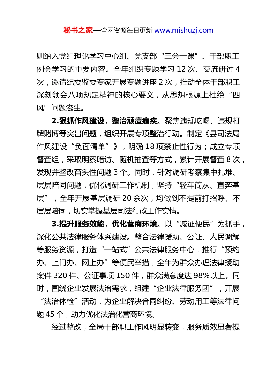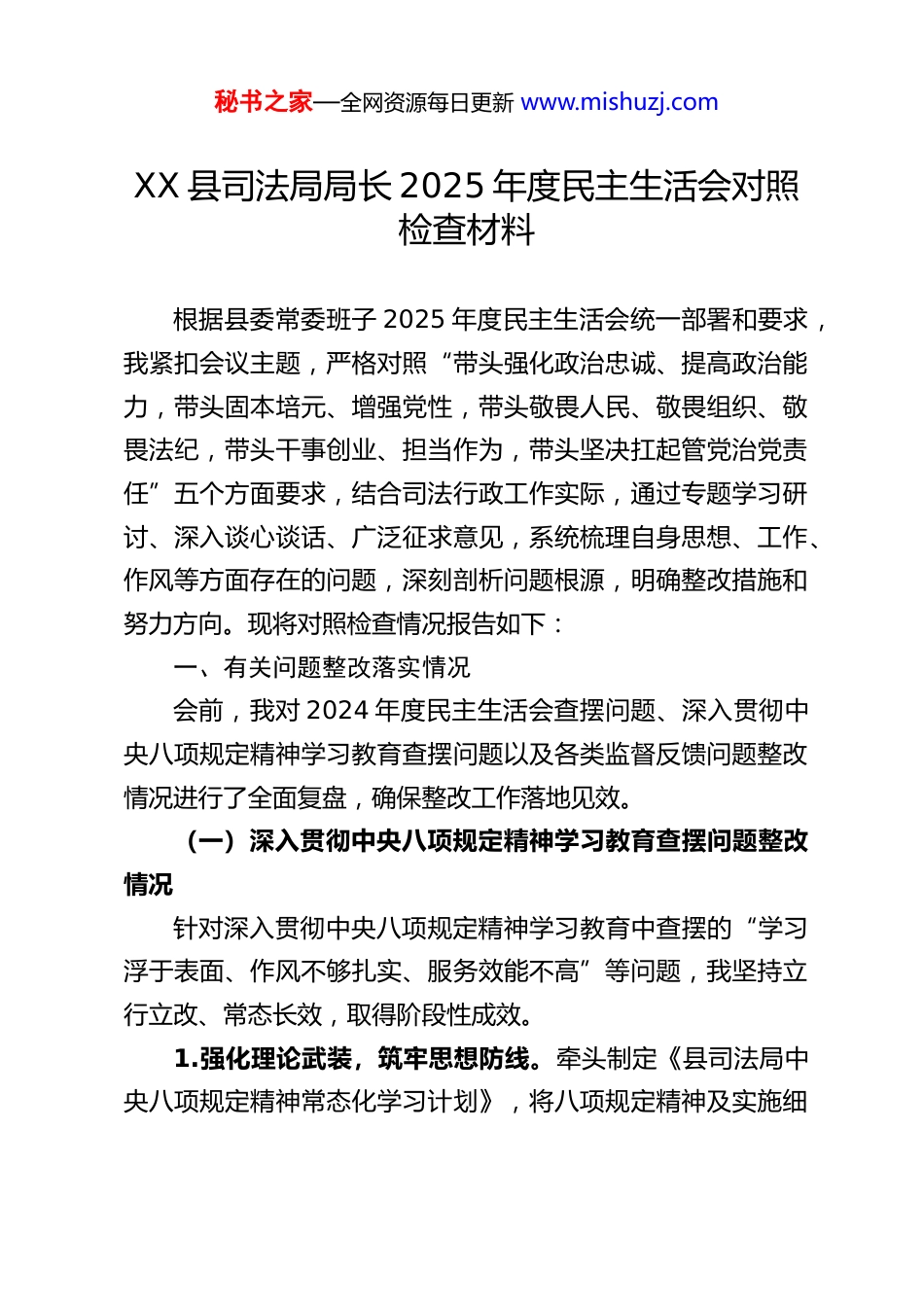 秘书之家—全网资源每日更新 www.mishuzj.comXX 县司法局局长 2025 年度民主生活会对照检查材料根据县委常委班子 2025 年度民主生活会统一部署和要求,我紧扣会议主题,严格对照“带头强化政治忠诚、提高政治能力,带头固本培元、增强党性,带头敬畏人民、敬畏组织、敬畏法纪,带头干事创业、担当作为,带头坚决扛起管党治党责任”五个方面要求,结合司法行政工作实际,通过专题学习研讨、深入谈心谈话、广泛征求意见,系统梳理自身思想、工作、作风等方面存在的问题,深刻剖析问题根源,明确整改措施和努力方向。现将对照检查情况报告如下:一、有关问题整改落实情况会前,我对 2024 年度民主生活会查摆问题、深入贯彻中央八项规定精神学习教育查摆问题以及各类监督反馈问题整改情况进行了全面复盘,确保整改工作落地见效。(一)深入贯彻中央八项规定精神学习教育查摆问题整改情况针对深入贯彻中央八项规定精神学习教育中查摆的“学习浮于表面、作风不够扎实、服务效能不高”等问题,我坚持立行立改、常态长效,取得阶段性成效。1.强化理论武装,筑牢思想防线。牵头制定《县司法局中央八项规定精神常态化学习计划》,将八项规定精神及实施细秘书之家—全网资源每日更新 www.mishuzj.com则纳入党组理论学习中心组、党支部“三会一课”、干部职工例会学习的重要内容。全年组织专题学习 12 次、交流研讨 4次,邀请纪委监委专家开展专题讲座 2 次,推动全体干部职工深刻领会八项规定精神的核心要义,从思想根源上杜绝“四风”问题滋生。2.狠抓作风建设,整治顽瘴痼疾。聚焦违规吃喝、违规打牌赌博等突出问题,组织开展专项整治行动。制定《县司法局作风建设“负面清单”》,明确 18 项禁止性行为;成立专项督查组,采取明察暗访、随机抽查等方式,累计开展督查 8 次,发现并整改苗头性问题 3 个。同时,针对调研考察集中扎堆、层层陪同问题,优化调研工作机制,坚持“轻车简从、直奔基层”,全年开展基层调研 20 余次,均做到不提前打招呼、不层层陪同,切实掌握基层司法行政工作实情。3.提升服务效能,优化营商环境。以“减证便民”为抓手,深化公共法律服务体系建设。整合法律援助、公证、人民调解等服务资源,打造“一站式”公共法律服务中心,推行“预约办、上门办、网上办”等便民举措,全年为群众办理法律援助案件 320 件、公证事项 150 件,群众满意度达 98%以上。同时,围绕企业发展法治需求,组建“企业法律服务团”,开展“法治体检”活动,为企业解决合同纠纷、劳动用工等法律问题 45 个,助力优化法治化营商环境。经过整改,全局干部职工作风明显转变,服务质效显著提秘书之家—全网资源每日更新 www.mishuzj.com升,但仍存在一些不足:一是部分干部作风建设的自觉性有待加强,存在“上热中温下冷”现象;二是服务企业的精准度不够,针对新兴产业的法律服务产品供给不足。(二)2024 年度民主生活会查摆问题整改情况2024 年度民主生活会上,我查摆了“政治理论学习深度不足、履职担当不够有力、管党治党责任压实不严”等 3 个方面 9 个具体问题。通过制定整改清单、明确整改时限、压实整改责任,截至目前,已完成整改 7 个问题,剩余 2 个问题正在持续整改中。1.针对“政治理论学习缺乏系统性”问题。建立“第一议题”制度,坚持把学习习近平新时代中国特色社会主义思想、习近平法治思想作为党组会议、理论学习中心组学习的首要内容,全年组织党组理论学习中心组学习 14 次,带头撰写心得体会 10 篇,带动全局形成“学思践悟”的良好氛围。同时,创新学习方式,依托“学习强国”“法宣在线”等平台,开展线上线下相结合的学习活动,确保学习入脑入心。2.针对“基层司法行政工作指导力度不足”问题。建立领导干部包联乡镇司法所制度,每位班子成员包联 3-4 个乡镇,定期深入基层调研指导,帮助解决司法所建设、队伍管理、业务开展等方面的问题。全年累计下基层指导工作 30 余次,协调解决司法所办公用房、经费保障等实际困难 6 个,推动基层司法所规范化建设水平显著提升。秘书之家—全网资源每日更新 www.mishuzj.co...