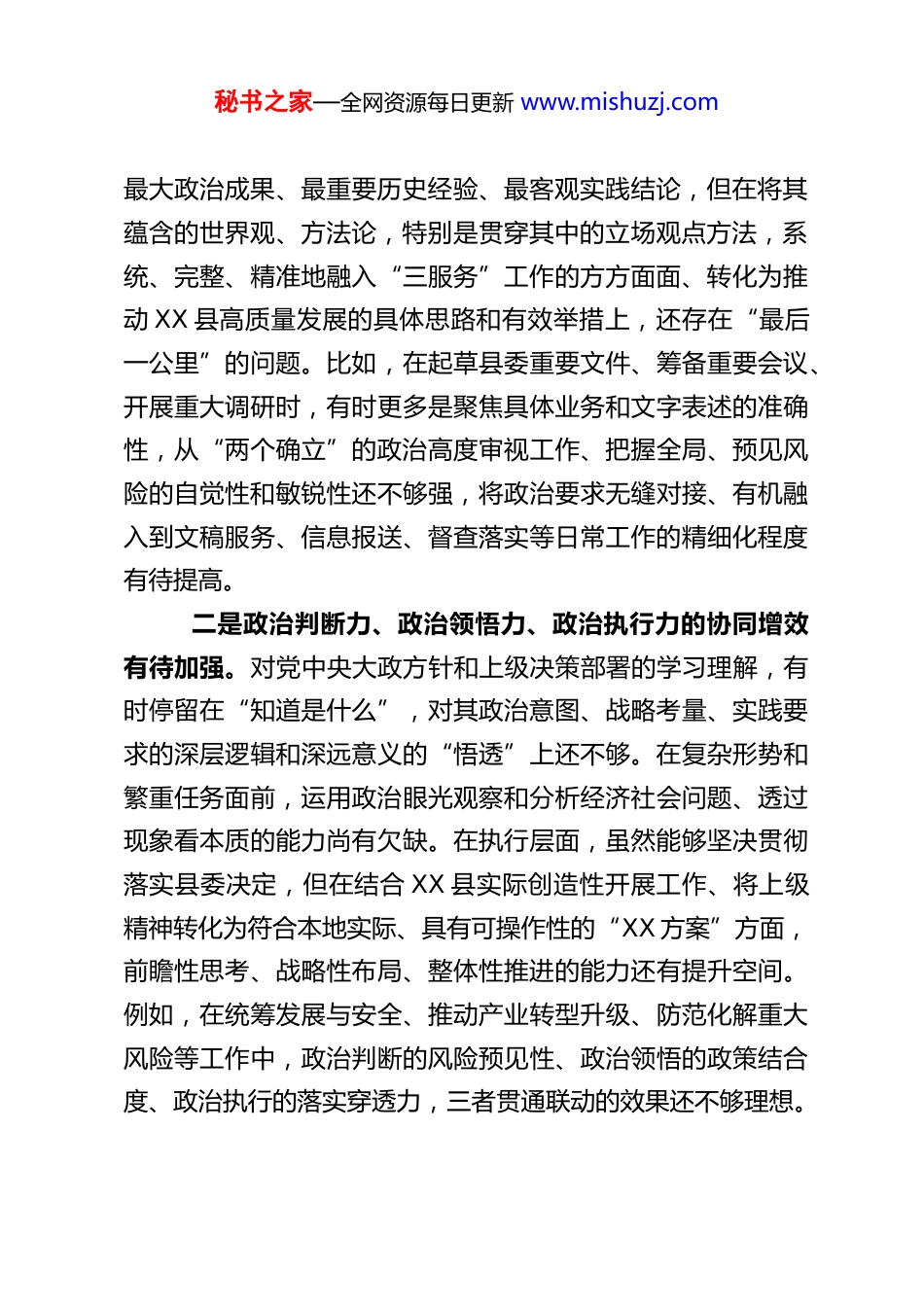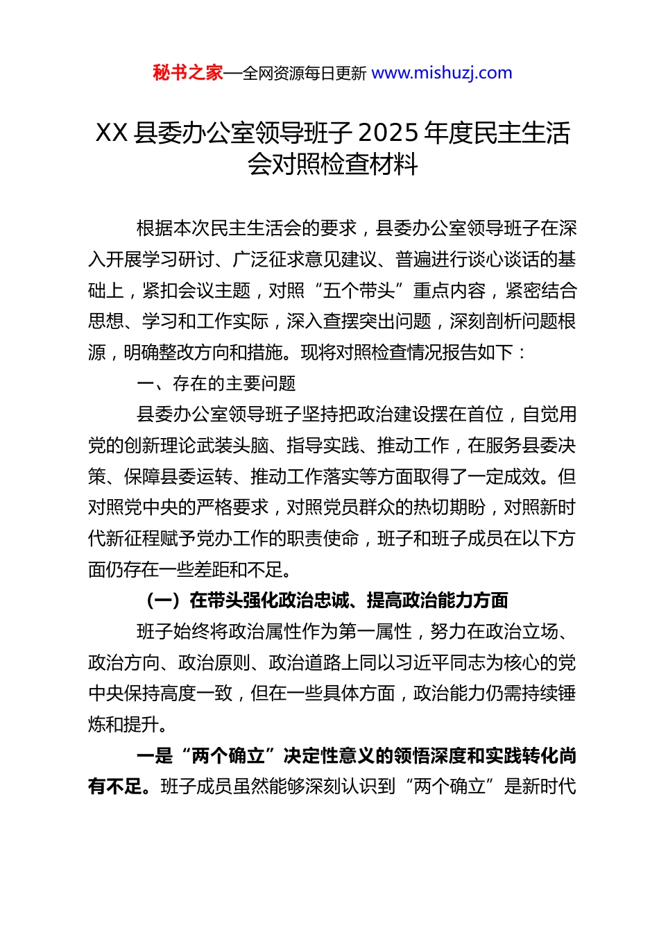秘书之家—全网资源每日更新 www.mishuzj.comXX 县委办公室领导班子 2025 年度民主生活会对照检查材料根据本次民主生活会的要求,县委办公室领导班子在深入开展学习研讨、广泛征求意见建议、普遍进行谈心谈话的基础上,紧扣会议主题,对照“五个带头”重点内容,紧密结合思想、学习和工作实际,深入查摆突出问题,深刻剖析问题根源,明确整改方向和措施。现将对照检查情况报告如下:一、存在的主要问题县委办公室领导班子坚持把政治建设摆在首位,自觉用党的创新理论武装头脑、指导实践、推动工作,在服务县委决策、保障县委运转、推动工作落实等方面取得了一定成效。但对照党中央的严格要求,对照党员群众的热切期盼,对照新时代新征程赋予党办工作的职责使命,班子和班子成员在以下方面仍存在一些差距和不足。(一)在带头强化政治忠诚、提高政治能力方面班子始终将政治属性作为第一属性,努力在政治立场、政治方向、政治原则、政治道路上同以习近平同志为核心的党中央保持高度一致,但在一些具体方面,政治能力仍需持续锤炼和提升。一是“两个确立”决定性意义的领悟深度和实践转化尚有不足。班子成员虽然能够深刻认识到“两个确立”是新时代秘书之家—全网资源每日更新 www.mishuzj.com最大政治成果、最重要历史经验、最客观实践结论,但在将其蕴含的世界观、方法论,特别是贯穿其中的立场观点方法,系统、完整、精准地融入“三服务”工作的方方面面、转化为推动 XX 县高质量发展的具体思路和有效举措上,还存在“最后一公里”的问题。比如,在起草县委重要文件、筹备重要会议、开展重大调研时,有时更多是聚焦具体业务和文字表述的准确性,从“两个确立”的政治高度审视工作、把握全局、预见风险的自觉性和敏锐性还不够强,将政治要求无缝对接、有机融入到文稿服务、信息报送、督查落实等日常工作的精细化程度有待提高。二是政治判断力、政治领悟力、政治执行力的协同增效有待加强。对党中央大政方针和上级决策部署的学习理解,有时停留在“知道是什么”,对其政治意图、战略考量、实践要求的深层逻辑和深远意义的“悟透”上还不够。在复杂形势和繁重任务面前,运用政治眼光观察和分析经济社会问题、透过现象看本质的能力尚有欠缺。在执行层面,虽然能够坚决贯彻落实县委决定,但在结合 XX 县实际创造性开展工作、将上级精神转化为符合本地实际、具有可操作性的“XX 方案”方面,前瞻性思考、战略性布局、整体性推进的能力还有提升空间。例如,在统筹发展与安全、推动产业转型升级、防范化解重大风险等工作中,政治判断的风险预见性、政治领悟的政策结合度、政治执行的落实穿透力,三者贯通联动的效果还不够理想。秘书之家—全网资源每日更新 www.mishuzj.com三是严守政治纪律和政治规矩的极端重要性的内化自觉仍需巩固。班子成员能够自觉遵守党的各项纪律规矩,但在一些细节上、在“八小时之外”的自我约束上,标准有时不够严格。对一些社会上出现的错误思潮和负面言论,虽然能够做到不信不传,但主动亮剑、坚决批驳的斗争精神有时不足。在办公室内部,对干部职工的政治纪律教育抓得还不够紧、不够实,常态化、制度化的政治体检机制还不够完善,对一些苗头性、倾向性问题提醒、批评不够及时、不够直接。四是保持战略定力、增强必胜信心的思想根基有待进一步夯实。面对当前经济下行压力加大、区域竞争日趋激烈、改革发展稳定任务艰巨繁重的形势,班子成员总体上能够保持定力、迎难而上,但有时也会流露出对完成某些高难度目标的焦虑情绪,对 XX 县发展的优势潜力挖掘宣传不够充分,对战胜前进道路上风险挑战的信心传递给基层和群众还不够有力。在服务县委推动工作落实中,有时过于强调困难,提出破局解困、化危为机的创新性思路和超常规举措相对较少。(二)在带头固本培元、增强党性方面班子高度重视党性锻炼,坚持把理论学习作为加强党性修养的首要途径,但在理论武装的深化、内化、转化上,在党性原则的坚守和践行上,还存在一些薄弱环节。一是以科学理论凝心铸魂的体系化、常态化机制不够健全。对习近平新时代中国特色社会主义思想的学习,虽然坚持秘书之家...