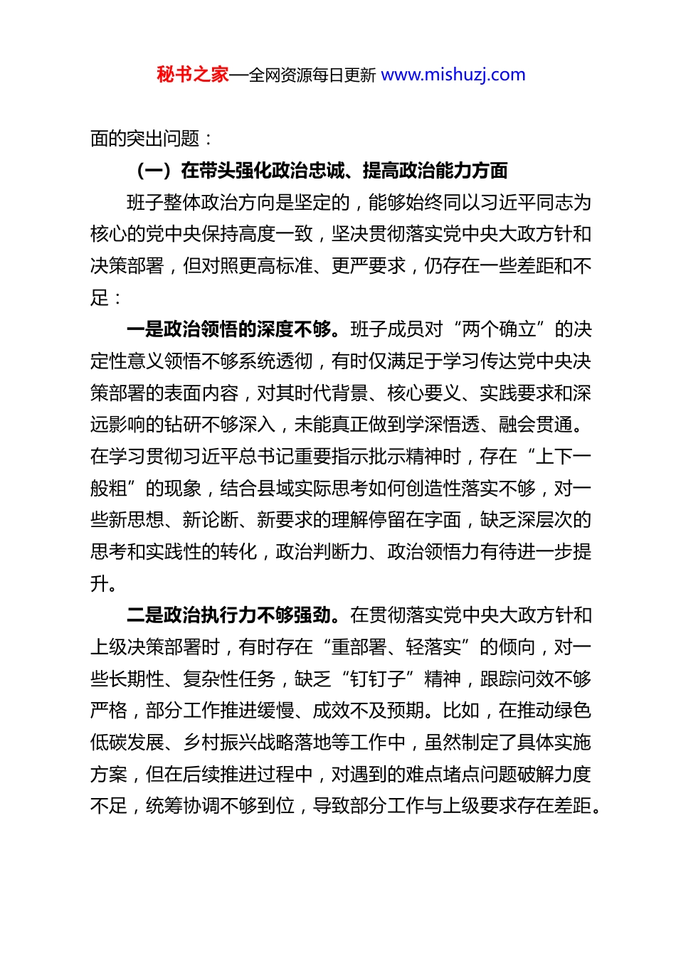 秘书之家—全网资源每日更新 www.mishuzj.comXX 县政府党组班子 2025 年度民主生活会对照检查材料根据中央、省委、市委关于召开 2025 年度民主生活会的统一部署和要求,XX 县政府党组班子紧扣会议主题,深入学习贯彻习近平新时代中国特色社会主义思想和党的二十届四中全会精神,认真落实中央政治局民主生活会精神要求,以中央八项规定作为铁规矩、硬杠杠,聚焦“带头强化政治忠诚、提高政治能力,带头固本培元、增强党性,带头敬畏人民、敬畏组织、敬畏法纪,带头干事创业、担当作为,带头坚决扛起管党治党责任”五个方面,广泛征求基层单位、党员干部、群众代表意见建议,深入开展谈心谈话,全面查摆存在的突出问题,深刻剖析问题产生的根源,结合违规吃喝、酒驾、公车私用等反面典型案例进行深刻警示教育,明确了今后努力方向和整改措施。现将对照检查情况报告如下:一、存在的主要问题县政府党组班子始终坚持以习近平新时代中国特色社会主义思想为指导,深刻领悟“两个确立”的决定性意义,增强“四个意识”、坚定“四个自信”、做到“两个维护”,自觉践行初心使命,扎实推进全县经济社会高质量发展,为“十五五”开局奠定了坚实基础。但对照党中央要求、人民群众期盼和新时代新征程使命任务,通过认真查摆,仍存在以下五个方秘书之家—全网资源每日更新 www.mishuzj.com面的突出问题:(一)在带头强化政治忠诚、提高政治能力方面班子整体政治方向是坚定的,能够始终同以习近平同志为核心的党中央保持高度一致,坚决贯彻落实党中央大政方针和决策部署,但对照更高标准、更严要求,仍存在一些差距和不足:一是政治领悟的深度不够。班子成员对“两个确立”的决定性意义领悟不够系统透彻,有时仅满足于学习传达党中央决策部署的表面内容,对其时代背景、核心要义、实践要求和深远影响的钻研不够深入,未能真正做到学深悟透、融会贯通。在学习贯彻习近平总书记重要指示批示精神时,存在“上下一般粗”的现象,结合县域实际思考如何创造性落实不够,对一些新思想、新论断、新要求的理解停留在字面,缺乏深层次的思考和实践性的转化,政治判断力、政治领悟力有待进一步提升。二是政治执行力不够强劲。在贯彻落实党中央大政方针和上级决策部署时,有时存在“重部署、轻落实”的倾向,对一些长期性、复杂性任务,缺乏“钉钉子”精神,跟踪问效不够严格,部分工作推进缓慢、成效不及预期。比如,在推动绿色低碳发展、乡村振兴战略落地等工作中,虽然制定了具体实施方案,但在后续推进过程中,对遇到的难点堵点问题破解力度不足,统筹协调不够到位,导致部分工作与上级要求存在差距。秘书之家—全网资源每日更新 www.mishuzj.com同时,存在“被动执行”的情况,主动对标对表、举一反三不够,缺乏前瞻性和主动性,未能结合县域发展实际找准落实决策部署的切入点和着力点,创造性开展工作的力度不足。三是政治敏锐性不够敏锐。班子成员对意识形态领域的复杂性、严峻性认识不够深刻,对一些苗头性、倾向性问题察觉不够及时,防范化解政治风险的意识和能力有待提升。在日常工作中,对一些涉及政治敏感的言论、行为警惕性不高,未能及时坚决制止和纠正;对县域内可能存在的政治风险排查不够全面,风险防控预案不够完善,应对复杂局面、处理复杂问题的政治能力有待进一步增强。四是政治纪律和政治规矩执行不够严格。虽然能够严格遵守党的政治纪律和政治规矩,但在一些细节方面,仍存在不够严谨的情况。比如,在落实请示报告制度时,有时存在报告不及时、内容不全面的问题;在民主生活会、组织生活会上,批评与自我批评不够严肃认真,存在“老好人”思想,辣味不足,未能真正达到“红脸出汗、排毒治病”的效果,对一些违反政治纪律和政治规矩的苗头性问题提醒不够、制止不力。(二)在带头固本培元、增强党性方面班子始终坚持把政治修养摆在党性修养的首位,自觉以习近平新时代中国特色社会主义思想凝心铸魂,努力坚守共产党人精神追求,但对照党章党规党纪要求和共产党人的初心使命,仍存在一些薄弱环节:秘书之家—全网资源每日更新 www.mishuzj.com一是理论武装不够扎实。班子成员...