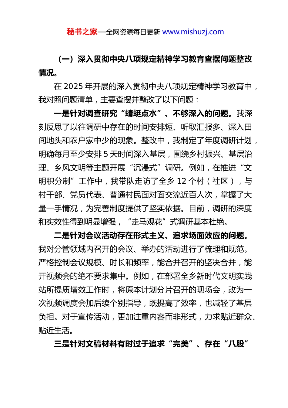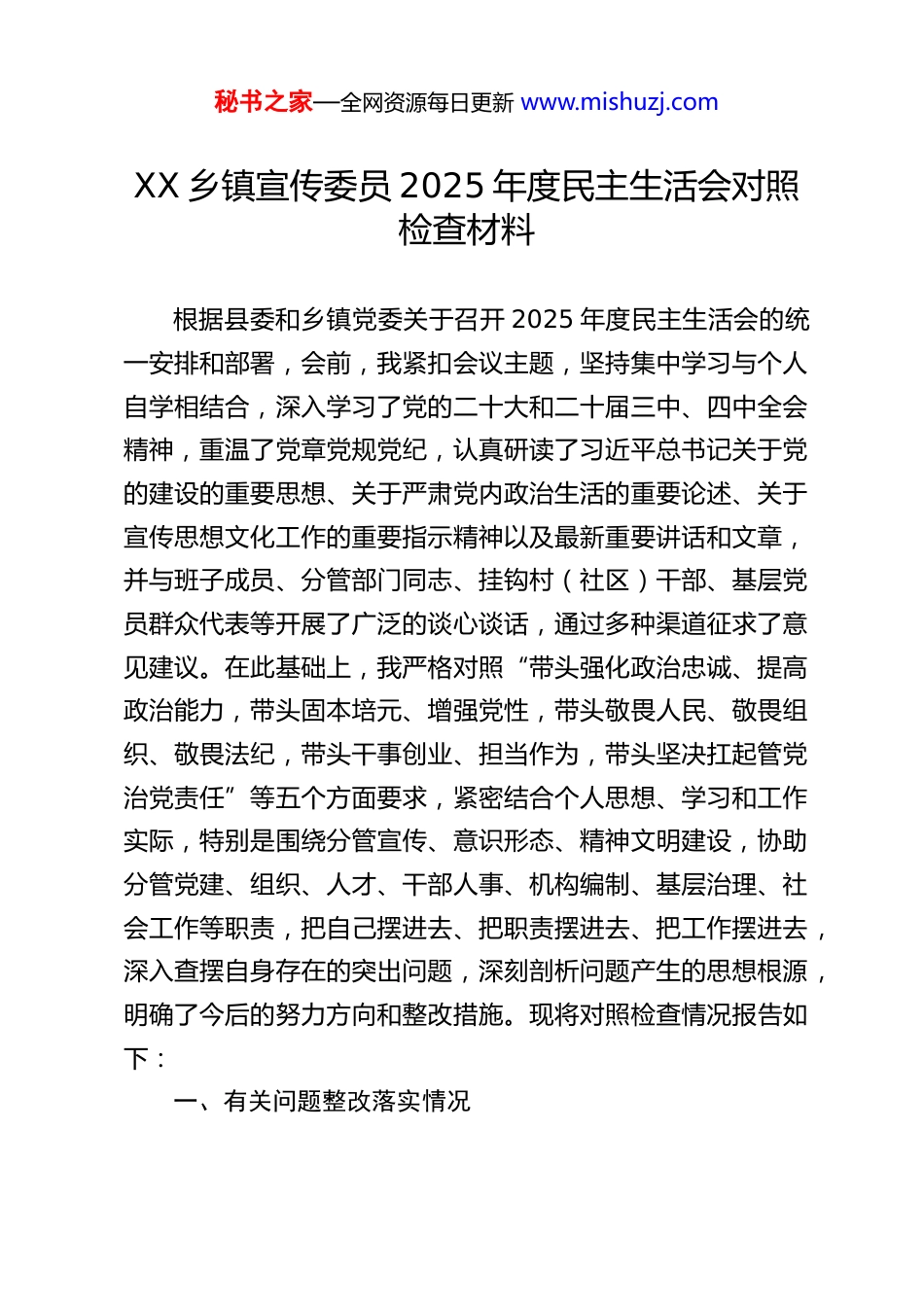 秘书之家—全网资源每日更新 www.mishuzj.comXX 乡镇宣传委员 2025 年度民主生活会对照检查材料根据县委和乡镇党委关于召开 2025 年度民主生活会的统一安排和部署,会前,我紧扣会议主题,坚持集中学习与个人自学相结合,深入学习了党的二十大和二十届三中、四中全会精神,重温了党章党规党纪,认真研读了习近平总书记关于党的建设的重要思想、关于严肃党内政治生活的重要论述、关于宣传思想文化工作的重要指示精神以及最新重要讲话和文章,并与班子成员、分管部门同志、挂钩村(社区)干部、基层党员群众代表等开展了广泛的谈心谈话,通过多种渠道征求了意见建议。在此基础上,我严格对照“带头强化政治忠诚、提高政治能力,带头固本培元、增强党性,带头敬畏人民、敬畏组织、敬畏法纪,带头干事创业、担当作为,带头坚决扛起管党治党责任”等五个方面要求,紧密结合个人思想、学习和工作实际,特别是围绕分管宣传、意识形态、精神文明建设,协助分管党建、组织、人才、干部人事、机构编制、基层治理、社会工作等职责,把自己摆进去、把职责摆进去、把工作摆进去,深入查摆自身存在的突出问题,深刻剖析问题产生的思想根源,明确了今后的努力方向和整改措施。现将对照检查情况报告如下:一、有关问题整改落实情况秘书之家—全网资源每日更新 www.mishuzj.com(一)深入贯彻中央八项规定精神学习教育查摆问题整改情况。在 2025 年开展的深入贯彻中央八项规定精神学习教育中,我对照问题清单,主要查摆并整改了以下问题:一是针对调查研究“蜻蜓点水”、不够深入的问题。我深刻反思了以往调研中存在的时间安排短、听取汇报多、深入田间地头和农户家中少的现象。整改中,我制定了年度调研计划,明确每月至少安排 5 天时间深入基层,围绕乡村振兴、基层治理、乡风文明等主题开展“沉浸式”调研。例如,在推进“文明积分制”工作中,我带队走访了全乡 12 个村(社区),与村干部、党员代表、普通村民面对面交流近百人次,掌握了大量一手情况,为完善制度提供了坚实依据。目前,调研的深度和实效性得到明显增强,“走马观花”式调研基本杜绝。二是针对会议活动存在形式主义、追求场面效应的问题。我对分管领域内召开的会议、举办的活动进行了梳理和规范。严格控制会议规模、时长和频率,能合并召开的坚决合并,能开视频会的绝不要求集中。例如,在部署全乡新时代文明实践站所提质增效工作时,将原本计划分片召开的现场会,改为一次视频调度会加后续个别指导,既提高了效率,也减轻了基层负担。对于宣传活动,更加注重内容而非形式,力求贴近群众、贴近生活。三是针对文稿材料有时过于追求“完美”、存在“八股”秘书之家—全网资源每日更新 www.mishuzj.com倾向的问题。我带头转变文风,要求宣传稿件、汇报材料必须言之有物、语言朴实、数据准确。在审核各类材料时,重点看是否反映了实际情况、是否解决了实际问题,而非一味追求辞藻华丽、对仗工整。同时,加强了对村级宣传员撰写信息稿件的培训指导,帮助他们提升用群众语言讲好身边故事的能力。目前,分管领域的文风有了初步改善,但仍有提升空间。(二)2024 年度民主生活会查摆问题整改情况。在 2024 年度民主生活会上,我主要查摆了理论学习联系实际不紧、意识形态阵地管理存在薄弱环节、抓党建促乡村振兴结合不够紧密等三个方面问题。一年来,我认真制定整改方案,逐项抓好落实:一是针对理论学习联系实际不紧的问题。我坚持把学习习近平新时代中国特色社会主义思想作为首要政治任务,特别是加深对其关于宣传思想文化工作、基层治理等重要论述的理解。制定了个人年度学习计划,除参加党委理论学习中心组学习外,坚持每周至少抽出半天时间自学,并撰写了多篇学习心得和调研报告。努力将学习成果转化为工作思路,例如,在学习“千万工程”经验后,牵头策划了“和美乡村·文明乡风”系列宣传活动,挖掘推广了一批本地先进典型,取得了较好反响。理论指导实践的能力得到一定提升。二是针对意识形态阵地管理存在薄弱环节的问题。我牵头修订完善了乡镇意识形态阵地管理制度,加强对乡镇微信公众秘书之家—全网资源每日...