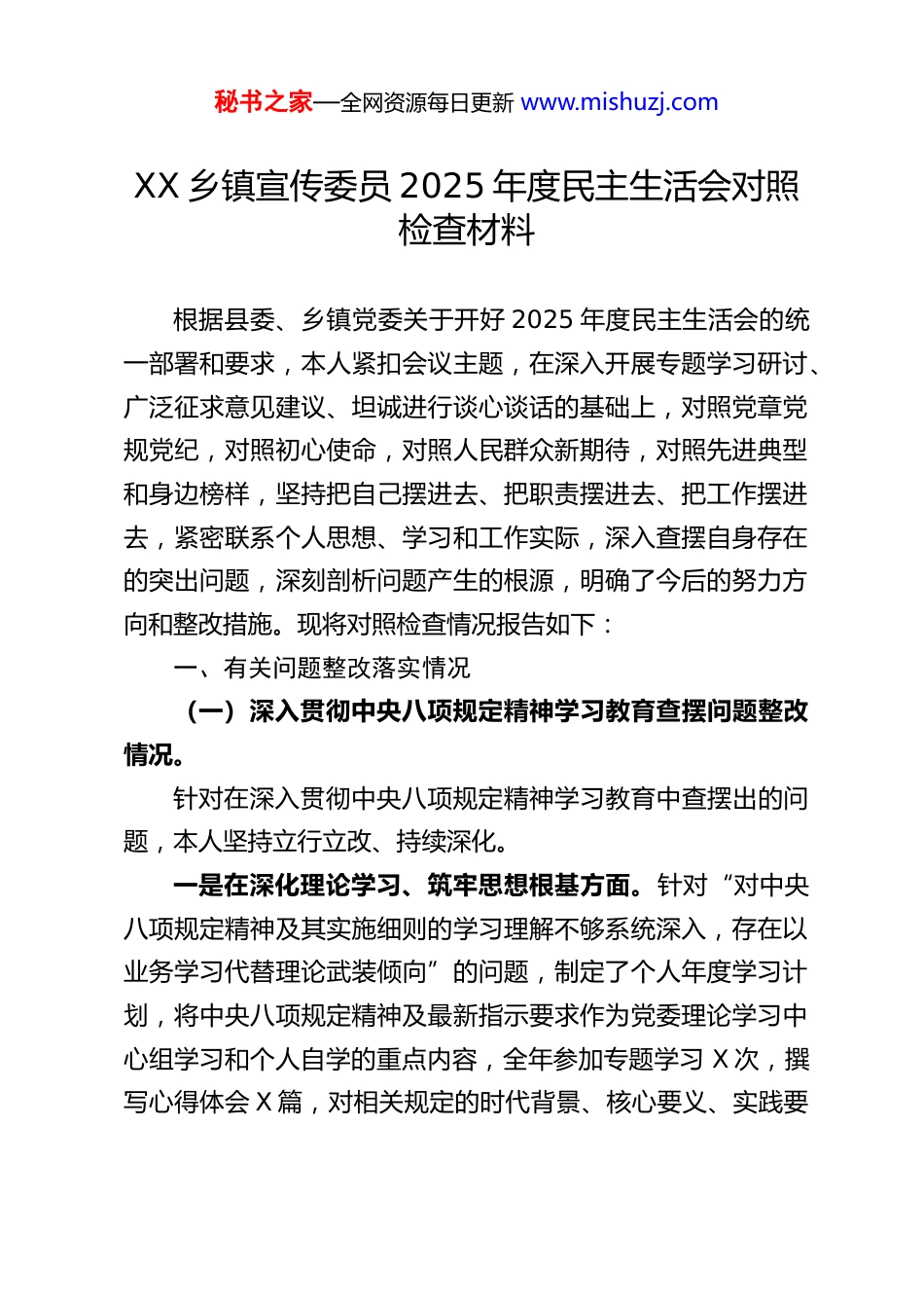 秘书之家—全网资源每日更新 www.mishuzj.comXX 乡镇宣传委员 2025 年度民主生活会对照检查材料根据县委、乡镇党委关于开好 2025 年度民主生活会的统一部署和要求,本人紧扣会议主题,在深入开展专题学习研讨、广泛征求意见建议、坦诚进行谈心谈话的基础上,对照党章党规党纪,对照初心使命,对照人民群众新期待,对照先进典型和身边榜样,坚持把自己摆进去、把职责摆进去、把工作摆进去,紧密联系个人思想、学习和工作实际,深入查摆自身存在的突出问题,深刻剖析问题产生的根源,明确了今后的努力方向和整改措施。现将对照检查情况报告如下:一、有关问题整改落实情况(一)深入贯彻中央八项规定精神学习教育查摆问题整改情况。针对在深入贯彻中央八项规定精神学习教育中查摆出的问题,本人坚持立行立改、持续深化。一是在深化理论学习、筑牢思想根基方面。针对“对中央八项规定精神及其实施细则的学习理解不够系统深入,存在以业务学习代替理论武装倾向”的问题,制定了个人年度学习计划,将中央八项规定精神及最新指示要求作为党委理论学习中心组学习和个人自学的重点内容,全年参加专题学习 X 次,撰写心得体会 X 篇,对相关规定的时代背景、核心要义、实践要秘书之家—全网资源每日更新 www.mishuzj.com求有了更深刻的认识,进一步增强了贯彻落实的思想自觉和行动自觉。二是在改进工作作风、力戒形式主义方面。针对“调查研究有时不够扎实,存在‘走马观花’现象;宣传报道有时过于追求声势,实效性有待提升”的问题,修订完善了乡镇宣传工作调研制度,要求每年至少牵头开展 X 项专题调研,并形成有情况、有分析、有建议的调研报告。在宣传报道中,更加注重面向基层、面向群众,减少了一般性会议和活动的报道篇幅,增加了对民生实事、典型经验、先进人物的深度报道比例,推动宣传内容更接地气、更富实效。三是在严格自我约束、保持清正廉洁方面。针对“对分管领域和身边同志落实八项规定精神的日常提醒监督不够经常”的问题,切实履行“一岗双责”,在分管部门会议、党建联系点调研中,逢会必讲纪律规矩,常态化开展廉政谈话提醒。带头严格执行办公用房、公务接待、公务用车等规定,自觉净化社交圈、生活圈、朋友圈,主动接受组织和群众监督。相关问题已基本整改到位,并将长期坚持。(二)2024 年度民主生活会查摆问题整改情况。对上年度民主生活会查摆出的 X 个方面 X 个具体问题,均已建立整改台账,实行销号管理,截至目前,除需长期坚持推进的事项外,其余问题均已整改完毕。一是关于“理论联系实际不够紧密,运用党的创新理论指秘书之家—全网资源每日更新 www.mishuzj.com导宣传思想工作实践存在差距”的问题。加强了习近平新时代中国特色社会主义思想和党的二十大精神的学习研讨,特别是关于宣传思想文化工作的重要论述,组织开展专题学习 X 场次。坚持学用结合,牵头策划了“党的创新理论进乡村”系列宣讲活动 X 场,用群众语言宣讲政策理论;围绕乡村振兴、基层治理等中心工作,设置宣传议题,增强了宣传工作的针对性和引领力。二是关于“意识形态阵地管理精细化水平有待提高,风险研判预警机制需进一步完善”的问题。修订完善了乡镇意识形态工作责任制实施细则和阵地管理制度,每季度牵头召开意识形态领域分析研判联席会议。加强对镇村宣传栏、微信公众号、各类活动场所的巡查管理,开展了 X 次专项检查。建立了网络舆情监测、研判、处置联动机制,提升了风险防范能力。三是关于“精神文明建设载体创新不足,新时代文明实践所(站)作用发挥有待加强”的问题。深入调研各村(社区)新时代文明实践站运行情况,制定了提质增效方案。策划开展了“文明乡风润万家”、“我们的节日”等系列主题活动 X 项,评选表彰了一批“身边好人”“文明家庭”。探索“点单派单”志愿服务模式,提升了文明实践活动的参与度和满意度。四是关于“协助分管党建工作时,系统谋划、分类指导不够,党建与业务融合促进有待深化”的问题。加强与党委副书记的沟通协作,积极参与党建重点工作谋划。指导各支部结合秘书之家—全网资源每日更新 www.mishuzj.com自...