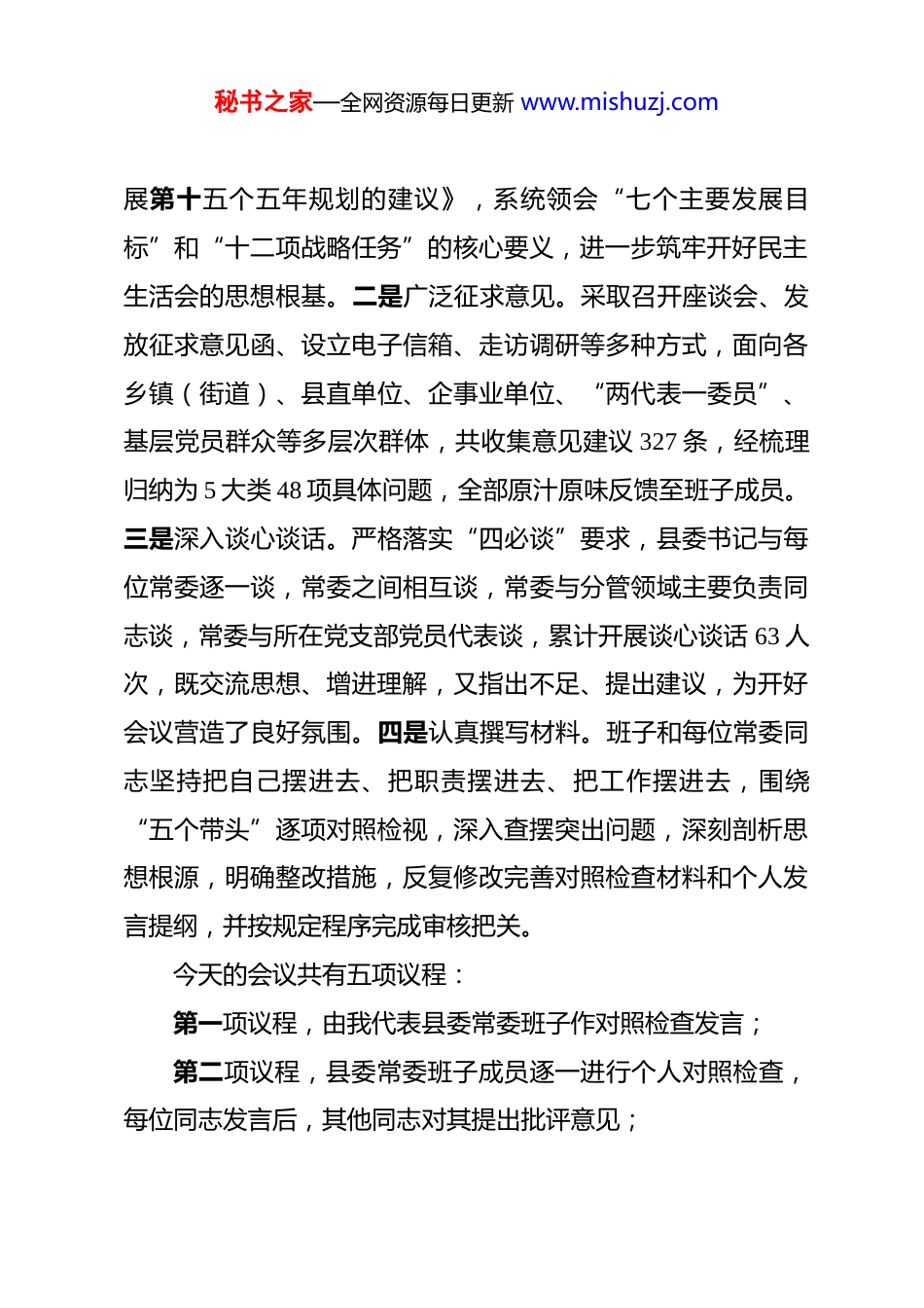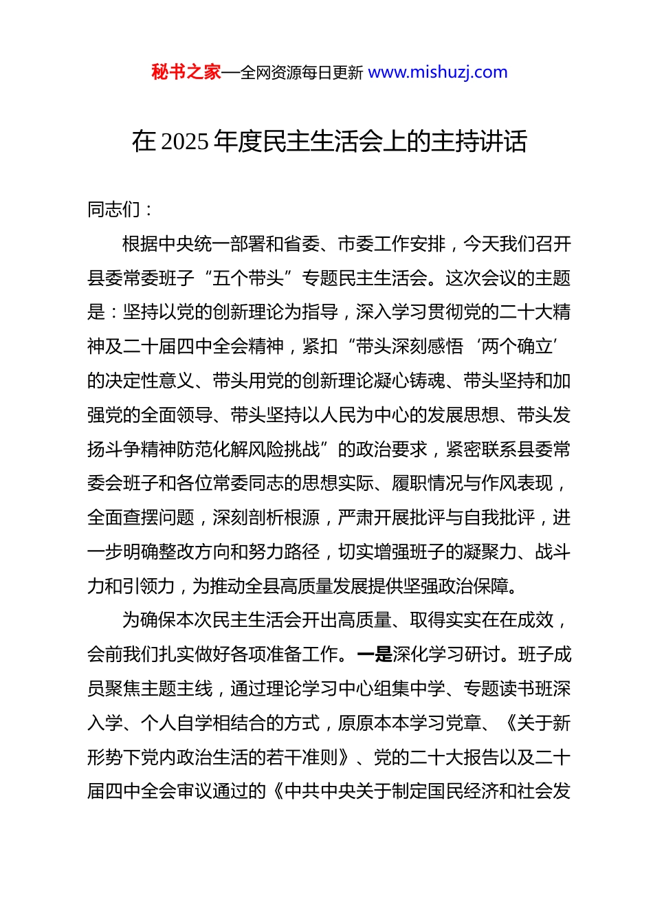 秘书之家—全网资源每日更新 www.mishuzj.com在 2025 年度民主生活会上的主持讲话 同志们:根据中央统一部署和省委、市委工作安排,今天我们召开县委常委班子“五个带头”专题民主生活会。这次会议的主题是:坚持以党的创新理论为指导,深入学习贯彻党的二十大精神及二十届四中全会精神,紧扣“带头深刻感悟‘两个确立’的决定性意义、带头用党的创新理论凝心铸魂、带头坚持和加强党的全面领导、带头坚持以人民为中心的发展思想、带头发扬斗争精神防范化解风险挑战”的政治要求,紧密联系县委常委会班子和各位常委同志的思想实际、履职情况与作风表现,全面查摆问题,深刻剖析根源,严肃开展批评与自我批评,进一步明确整改方向和努力路径,切实增强班子的凝聚力、战斗力和引领力,为推动全县高质量发展提供坚强政治保障。为确保本次民主生活会开出高质量、取得实实在在成效,会前我们扎实做好各项准备工作。一是深化学习研讨。班子成员聚焦主题主线,通过理论学习中心组集中学、专题读书班深入学、个人自学相结合的方式,原原本本学习党章、《关于新形势下党内政治生活的若干准则》、党的二十大报告以及二十届四中全会审议通过的《中共中央关于制定国民经济和社会发秘书之家—全网资源每日更新 www.mishuzj.com展第十五个五年规划的建议》,系统领会“七个主要发展目标”和“十二项战略任务”的核心要义,进一步筑牢开好民主生活会的思想根基。二是广泛征求意见。采取召开座谈会、发放征求意见函、设立电子信箱、走访调研等多种方式,面向各乡镇(街道)、县直单位、企事业单位、“两代表一委员”、基层党员群众等多层次群体,共收集意见建议 327 条,经梳理归纳为 5 大类 48 项具体问题,全部原汁原味反馈至班子成员。三是深入谈心谈话。严格落实“四必谈”要求,县委书记与每位常委逐一谈,常委之间相互谈,常委与分管领域主要负责同志谈,常委与所在党支部党员代表谈,累计开展谈心谈话 63 人次,既交流思想、增进理解,又指出不足、提出建议,为开好会议营造了良好氛围。四是认真撰写材料。班子和每位常委同志坚持把自己摆进去、把职责摆进去、把工作摆进去,围绕“五个带头”逐项对照检视,深入查摆突出问题,深刻剖析思想根源,明确整改措施,反复修改完善对照检查材料和个人发言提纲,并按规定程序完成审核把关。今天的会议共有五项议程:第一项议程,由我代表县委常委班子作对照检查发言;第二项议程,县委常委班子成员逐一进行个人对照检查,每位同志发言后,其他同志对其提出批评意见;秘书之家—全网资源每日更新 www.mishuzj.com第三项议程,针对收到的批评意见,作简要表态回应;第四项议程,请到会指导的上级领导讲话;第五项议程,由我作会议总结,并就抓好整改落实工作提出具体要求。刚才,我代表县委常委班子作了对照检查,各位常委同志依次进行了深刻的个人对照检查,大家开门见山、坦诚相见,相互之间开展了富有“辣味”的批评,既点出了具体问题,也提出了改进建议,体现了对组织忠诚、对事业负责、对同志关心的政治品格。刚才,XX 同志代表上级党委作了重要讲话,充分肯定了我县此次民主生活会准备充分、主题鲜明、查摆深入、批评诚恳,达到了预期效果,并就持续加强班子建设、深化问题整改、推动改革发展提出了殷切期望和明确要求,具有很强的政治性、指导性和实践性,我们要认真学习领会,坚决贯彻落实。总的来看,这次专题民主生活会呈现出四个鲜明特点:一是政治站位高,准备工作实。班子成员自觉对标中央精神,把开好会议作为一项重要政治任务来抓,学习研讨深、征求意见广、谈心谈话透、材料撰写严,为高质量开好会议打下了坚实基础。二是问题导向明,查摆剖析深。无论是班子还是个人,都能紧扣“五个带头”,聚焦主责主业,从思想深处挖根源,秘书之家—全网资源每日更新 www.mishuzj.com从工作短板看担当,不回避矛盾、不遮掩问题,真正做到了见人见事见思想。三是批评氛围浓,民主作风好。相互批评出于公心、实事求是,既有红脸出汗的紧张严肃,又有加油鼓劲的真诚帮助,体现了党内政治生活应有的原则性和战斗性,达到了“团结—批...