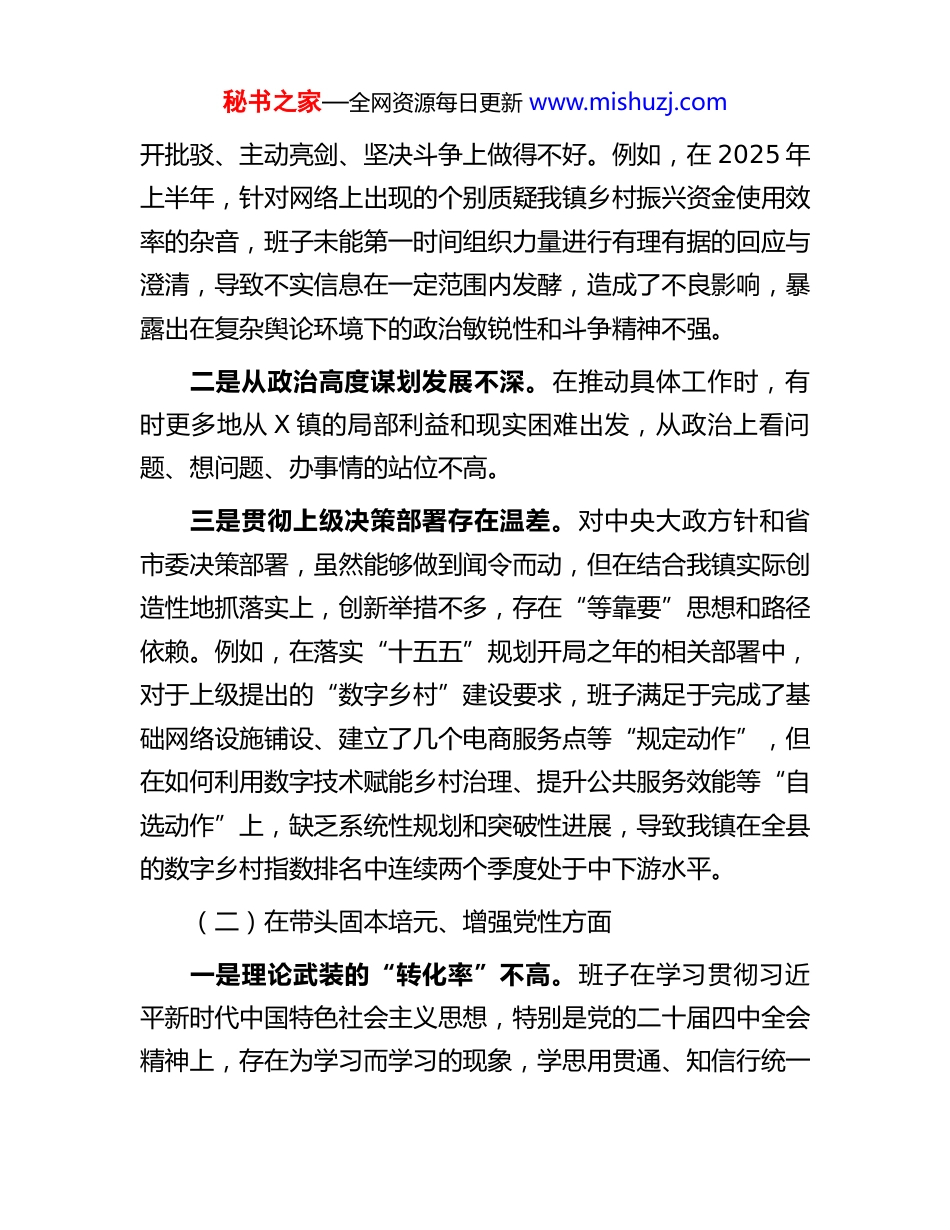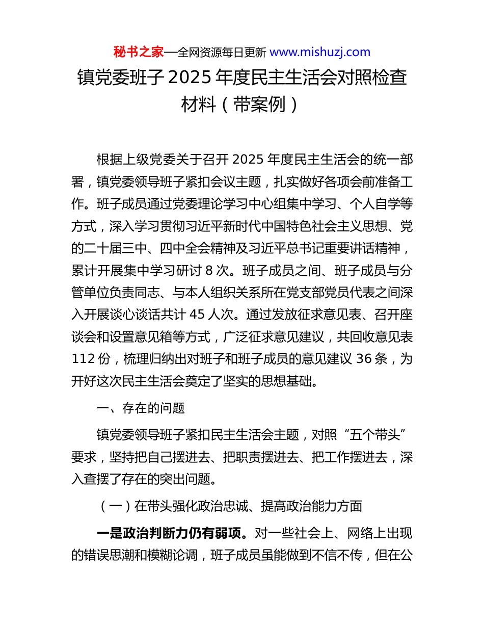 秘书之家—全网资源每日更新 www.mishuzj.com镇党委班子 2025 年度民主生活会对照检查材料(带案例)根据上级党委关于召开 2025 年度民主生活会的统一部署,镇党委领导班子紧扣会议主题,扎实做好各项会前准备工作。班子成员通过党委理论学习中心组集中学习、个人自学等方式,深入学习贯彻习近平新时代中国特色社会主义思想、党的二十届三中、四中全会精神及习近平总书记重要讲话精神,累计开展集中学习研讨 8 次。班子成员之间、班子成员与分管单位负责同志、与本人组织关系所在党支部党员代表之间深入开展谈心谈话共计 45 人次。通过发放征求意见表、召开座谈会和设置意见箱等方式,广泛征求意见建议,共回收意见表112 份,梳理归纳出对班子和班子成员的意见建议 36 条,为开好这次民主生活会奠定了坚实的思想基础。一、存在的问题镇党委领导班子紧扣民主生活会主题,对照“五个带头”要求,坚持把自己摆进去、把职责摆进去、把工作摆进去,深入查摆了存在的突出问题。(一)在带头强化政治忠诚、提高政治能力方面一是政治判断力仍有弱项。对一些社会上、网络上出现的错误思潮和模糊论调,班子成员虽能做到不信不传,但在公秘书之家—全网资源每日更新 www.mishuzj.com开批驳、主动亮剑、坚决斗争上做得不好。例如,在 2025 年上半年,针对网络上出现的个别质疑我镇乡村振兴资金使用效率的杂音,班子未能第一时间组织力量进行有理有据的回应与澄清,导致不实信息在一定范围内发酵,造成了不良影响,暴露出在复杂舆论环境下的政治敏锐性和斗争精神不强。二是从政治高度谋划发展不深。在推动具体工作时,有时更多地从 X 镇的局部利益和现实困难出发,从政治上看问题、想问题、办事情的站位不高。三是贯彻上级决策部署存在温差。对中央大政方针和省市委决策部署,虽然能够做到闻令而动,但在结合我镇实际创造性地抓落实上,创新举措不多,存在“等靠要”思想和路径依赖。例如,在落实“十五五”规划开局之年的相关部署中,对于上级提出的“数字乡村”建设要求,班子满足于完成了基础网络设施铺设、建立了几个电商服务点等“规定动作”,但在如何利用数字技术赋能乡村治理、提升公共服务效能等“自选动作”上,缺乏系统性规划和突破性进展,导致我镇在全县的数字乡村指数排名中连续两个季度处于中下游水平。(二)在带头固本培元、增强党性方面一是理论武装的“转化率”不高。班子在学习贯彻习近平新时代中国特色社会主义思想,特别是党的二十届四中全会精神上,存在为学习而学习的现象,学思用贯通、知信行统一秘书之家—全网资源每日更新 www.mishuzj.com做得不扎实。2025 年全年,镇党委理论学习中心组虽组织了12 次专题学习,但多数停留在读文件、念报告层面,联系我镇高质量发展瓶颈和基层治理难题的深度研讨不够,导致学习成果向工作思路、具体举措转化的效果不彰显。二是党性锤炼的自觉性不强。部分班子成员在严格的党内政治生活中锻炼党性、砥砺品格的意识有所弱化,满足于按时参加“三会一课”、组织生活会,但在用好批评和自我批评武器上存在“爱惜羽毛”的思想。在 2025 年 8 月份的一次班子内部工作碰头会上,对一名班子成员分管的重点项目进度严重滞后问题,其他同志仅作了提醒,未能开展严肃的批评,自我批评也多是谈客观困难,没有深挖主观原因,党内政治生活的“辣味”不足。三是理想信念教育抓得不实。对党员干部的理想信念教育方式单一、内容陈旧,未能很好地适应新时代党员队伍结构和思想动态的变化。镇党校全年举办的 3 期党员培训班,课程设置仍以传统理论灌输为主,缺乏现场教学、案例剖析等沉浸式、体验式教学环节,导致年轻党员参与度不高,部分学员反映教育内容“解渴”效果不好,未能真正触及思想灵魂、坚定精神追求。(三)在带头敬畏人民、敬畏组织、敬畏法纪方面一是深入基层联系群众不密切。虽然班子成员都建立了秘书之家—全网资源每日更新 www.mishuzj.com基层联系点,但“身入”与“心入”未能完全统一,存在走马观花、浮于表面的现象。据统计,2025 年班子成员人均下基层调研天数为 48 天,但真正吃住在村、与群众...