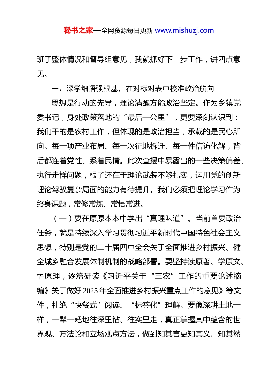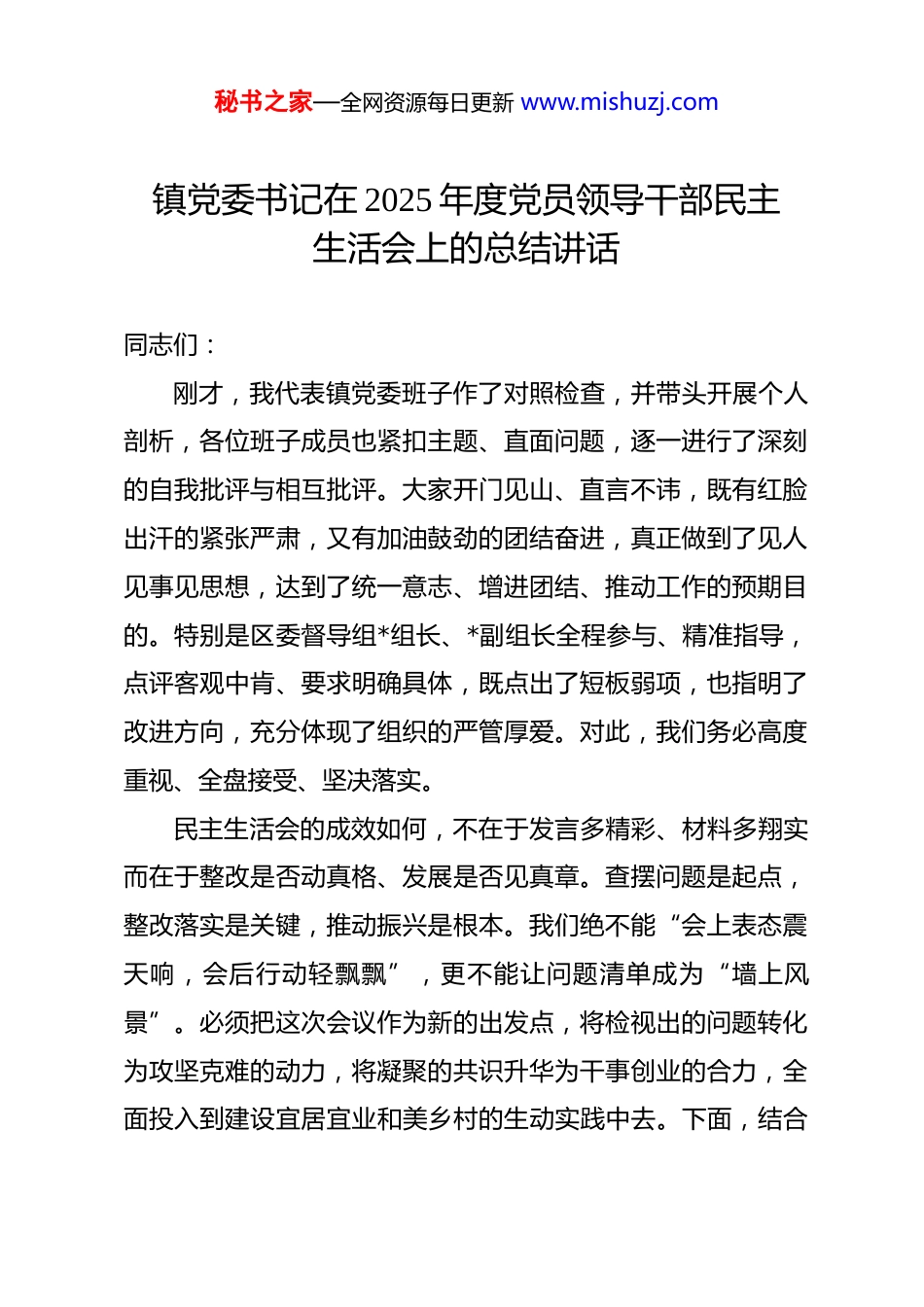 秘书之家—全网资源每日更新 www.mishuzj.com镇党委书记在 2025 年度党员领导干部民主生活会上的总结讲话 同志们:刚才,我代表镇党委班子作了对照检查,并带头开展个人剖析,各位班子成员也紧扣主题、直面问题,逐一进行了深刻的自我批评与相互批评。大家开门见山、直言不讳,既有红脸出汗的紧张严肃,又有加油鼓劲的团结奋进,真正做到了见人见事见思想,达到了统一意志、增进团结、推动工作的预期目的。特别是区委督导组*组长、*副组长全程参与、精准指导,点评客观中肯、要求明确具体,既点出了短板弱项,也指明了改进方向,充分体现了组织的严管厚爱。对此,我们务必高度重视、全盘接受、坚决落实。民主生活会的成效如何,不在于发言多精彩、材料多翔实而在于整改是否动真格、发展是否见真章。查摆问题是起点,整改落实是关键,推动振兴是根本。我们绝不能“会上表态震天响,会后行动轻飘飘”,更不能让问题清单成为“墙上风景”。必须把这次会议作为新的出发点,将检视出的问题转化为攻坚克难的动力,将凝聚的共识升华为干事创业的合力,全面投入到建设宜居宜业和美乡村的生动实践中去。下面,结合秘书之家—全网资源每日更新 www.mishuzj.com班子整体情况和督导组意见,我就抓好下一步工作,讲四点意见。一、深学细悟强根基,在对标对表中校准政治航向思想是行动的先导,理论清醒方能政治坚定。作为乡镇党委书记,身处政策落地的“最后一公里”,更要深刻认识到:我们干的是农村工作,但体现的是政治担当,承载的是民心所向。每一项产业布局、每一次征地拆迁、每一件信访化解,背后都连着党性、系着民情。此次查摆中暴露出的一些决策偏差、执行走样问题,根子还在于理论武装不够扎实,运用党的创新理论驾驭复杂局面的能力有待提升。我们必须把理论学习作为终身课题,常修常炼、常悟常进。(一)要在原原本本中学出“真理味道”。当前首要政治任务,就是持续深入学习贯彻习近平新时代中国特色社会主义思想,特别是党的二十届四中全会关于全面推进乡村振兴、健全城乡融合发展体制机制的战略部署。要坚持读原著、学原文、悟原理,逐篇研读《习近平关于“三农”工作的重要论述摘编》关于做好 2025 年全面推进乡村振兴重点工作的意见》等文件,杜绝“快餐式”阅读、“标签化”理解。要像深耕土地一样,一犁一耙地往深里钻、往实里走,真正掌握其中蕴含的世界观、方法论和立场观点方法,做到知其言更知其义、知其然秘书之家—全网资源每日更新 www.mishuzj.com更知其所以然。(二)要在融会贯通中把握“发展脉络”。理论学习不能“只见树木、不见森林”。要把学习贯彻中央精神与落实省委“千万工程”深化年部署、市委城乡融合示范区建设要求结合起来,把乡村振兴放在中国式现代化的大局中去谋划。思考产业发展,要立足资源禀赋,对接市场需求,避免盲目上马;推进乡村建设,要尊重村庄肌理,留住乡愁记忆,防止千村一面;处理基层矛盾,要站稳群众立场,依法依规办事,防范风险隐患。只有系统把握政策逻辑、历史逻辑和实践逻辑,才能增强工作的前瞻性、系统性和创造性。(三)要在知行合一中实现“转化落地”。学以致用才是真学,解决问题才是实效。党委中心组学习要改变“一人念、众人听”的模式,更多围绕“如何壮大村级集体经济”“怎样破解耕地‘非粮化’整治难题”“农村养老服务体系怎么建”等现实课题开展研讨。班子成员要带头践行“四下基层”制度,每月至少安排 3 天蹲点调研,走进田间地头、坐到农家炕头,听民声、察实情、找症结。要把调研发现的“问题清单”,转化为推动发展的“任务清单”和“成果清单”,让理论之光照亮乡村振兴之路。二、动真碰硬抓整改,在靶向施治中清除发展障碍秘书之家—全网资源每日更新 www.mishuzj.com问题整改是检验民主生活会成色的“试金石”。如果只查不改、议而不决,就会失信于民、贻误发展。本次会议共查摆出涉及班子和个人的各类问题 47 条,涵盖产业发展、基层治理、民生保障、作风建设等多个方面,这些都是制约我镇高质量发展的堵点痛点难点。整改必须发扬钉钉子精神,一锤接着一锤敲,确保件件有着落、事事有回音...