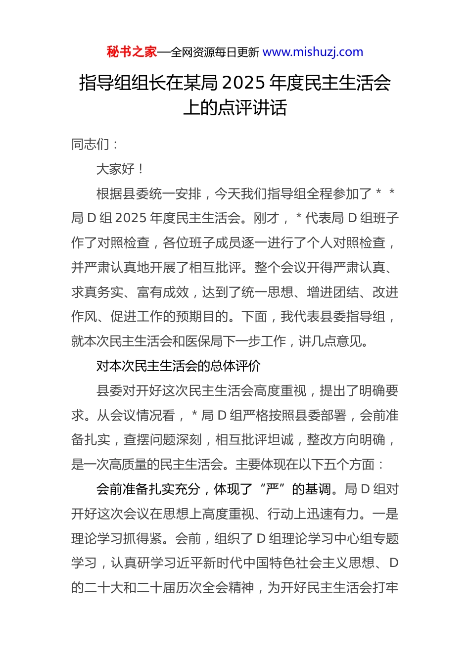 秘书之家—全网资源每日更新 www.mishuzj.com指导组组长在某局 2025 年度民主生活会上的点评讲话同志们:大家好!根据县委统一安排,今天我们指导组全程参加了**局 D 组 2025 年度民主生活会。刚才,*代表局 D 组班子作了对照检查,各位班子成员逐一进行了个人对照检查,并严肃认真地开展了相互批评。整个会议开得严肃认真、求真务实、富有成效,达到了统一思想、增进团结、改进作风、促进工作的预期目的。下面,我代表县委指导组,就本次民主生活会和医保局下一步工作,讲几点意见。对本次民主生活会的总体评价县委对开好这次民主生活会高度重视,提出了明确要求。从会议情况看,*局 D 组严格按照县委部署,会前准备扎实,查摆问题深刻,相互批评坦诚,整改方向明确,是一次高质量的民主生活会。主要体现在以下五个方面:会前准备扎实充分,体现了“严”的基调。局 D 组对开好这次会议在思想上高度重视、行动上迅速有力。一是理论学习抓得紧。会前,组织了 D 组理论学习中心组专题学习,认真研学习近平新时代中国特色社会主义思想、D的二十大和二十届历次全会精神,为开好民主生活会打牢秘书之家—全网资源每日更新 www.mishuzj.com了坚实的思想基础。二是征求意见听得广。通过线上问卷线下座谈、设立意见箱等多种形式,广泛征求了服务对象定点医药机构、乡镇(街道)以及局机关干部职工的意见建议,累计收集到原汁原味的意见建议**条,为精准画像提供了第一手资料。三是谈心谈话谈得深。D 组主要负责同志与班子成员、班子成员之间、班子成员与分管科室负责同志之间都开展了深入的谈心谈话,做到了把问题谈开、把思想谈通、把意见谈实,营造了开好会议的良好氛围。查摆问题深刻具体,体现了“实”的作风。各位同志紧扣主题,把自己摆进去、把职责摆进去、把工作摆进去问题查摆不遮不掩、不避重就轻。一是问题找得准。大家对照“五个带头”的要求,主动认领了班子存在的问题,也精准查摆了个人存在的问题,既有工作上的短板,也有思想上的差距,还有作风上的不足。比如,班子对照检查中提到“医保精细化管理水平与群众期盼还有差距”,个人发言中有的同志谈到“面对支付方式改革的深层次矛盾存在畏难情绪”,这些问题都抓住了要害、点到了痛处。二是画像画得像。大家的发言没有穿靴戴帽,没有空洞理论,而是用具体事例说话。有的同志谈到在处理异地就医直接结算堵点问题时,亲自跟踪不够,导致问题解决周期秘书之家—全网资源每日更新 www.mishuzj.com较长;有的同志反思在推动药品集中采购政策落地时,对医疗机构的宣讲和培训深度不够。这些问题有血有肉,见人见事,个人形象立体鲜活。根源剖析触及灵魂,体现了“深”的自觉。大家在剖析问题根源时,没有停留在表面现象,而是从世界观、人生观、价值观的深层次上找原因,从政 ZHI 站位、D 性修养、宗旨意识上挖根源。比如,对服务群众“最后一公里”问题,大家没有简单归结为人员少、任务重,而是深刻反思了以人民为中心的发展思想树得牢不牢,与群众的血肉联系保持得紧不紧。对工作中存在的“路径依赖”,大家深刻剖析了是否存在安于现状、不思进取的思想惰性是否缺乏“敢为天下先”的改革锐气。这种刀刃向内的自我革命精神,难能可贵。相互批评坦诚相见,体现了“真”的辣味。这次会议的相互批评环节,是真点问题、点真问题,有“辣味”、有“火药味”,真正起到了“红脸出汗、排毒 ZHI 病”的效果。大家本着对组织、对同志、对事业高度负责的态度开诚布公、直截了当。主要负责同志带头向班子成员提出批评意见,班子成员之间也开展了严肃的相互批评。批评意见既有工作业务上的提醒,比如“在基金监管上,运用大数据等现代化手段还不够,传统的人工核查占比仍然偏秘书之家—全网资源每日更新 www.mishuzj.com高”;也有思想作风上的警醒,比如“下基层调研时,到条件好的地方多,到情况复杂、矛盾突出的地方少,有‘盆景式’调研的倾向”。这些批评意见,是真正的关心和爱护,是同志式的帮助和提醒,大家都能虚心接受,并当场表态认领整改。整改方向清晰明确,体现了“改”的决心。针对查摆出的问...