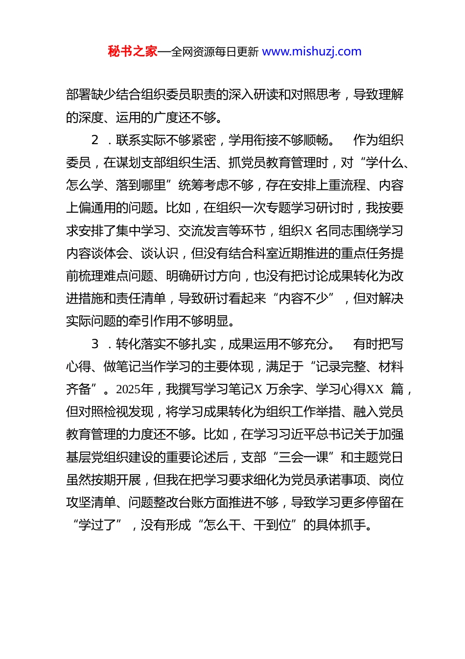 秘书之家—全网资源每日更新 www.mishuzj.com2025 年 度 组 织 生 活 会 个 人 对 照检 查 材 料( 通 用 稿 )根据本次组织生活会有关安排,我紧扣会议主题,认真学习习近平新时代中国特色社会主义思想,深入学习党的二十大和二十届四中全会精神,重温党章党规党纪,并结合今年开展的深入贯彻中央⑧项规定精神学习教育,联系组织委员岗位职责和工作实际,采取谈心谈话、征求意见、对照检视等方式,对照“五个方面”逐项查摆差距不足,剖析原因,明确整改措施。现将个人对照检查情况报告如下。一、存在的主要问题(一)在学习贯彻党的创新理论方面1 .学习统筹不够有力,理解把握不够深入。 平时能够按要求参加集中学习,也能够坚持开展日常自学,但学习安排上偏向任务推进、应急补课,缺少系统规划和持续钻研,对党的创新理论的体系结构、核心要义和内在逻辑把握还不够透。特别是对党的二十届四中全会精神,学习更多停留在会议公报、新闻报道和上级传达材料层面,对“十五五”规划建议等重大秘书之家—全网资源每日更新 www.mishuzj.com部署缺少结合组织委员职责的深入研读和对照思考,导致理解的深度、运用的广度还不够。2 .联系实际不够紧密,学用衔接不够顺畅。 作为组织委员,在谋划支部组织生活、抓党员教育管理时,对“学什么、怎么学、落到哪里”统筹考虑不够,存在安排上重流程、内容上偏通用的问题。比如,在组织一次专题学习研讨时,我按要求安排了集中学习、交流发言等环节,组织X 名同志围绕学习内容谈体会、谈认识,但没有结合科室近期推进的重点任务提前梳理难点问题、明确研讨方向,也没有把讨论成果转化为改进措施和责任清单,导致研讨看起来“内容不少”,但对解决实际问题的牵引作用不够明显。3 .转化落实不够扎实,成果运用不够充分。 有时把写心得、做笔记当作学习的主要体现,满足于“记录完整、材料齐备”。2025年,我撰写学习笔记X 万余字、学习心得XX 篇,但对照检视发现,将学习成果转化为组织工作举措、融入党员教育管理的力度还不够。比如,在学习习近平总书记关于加强基层党组织建设的重要论述后,支部“三会一课”和主题党日虽然按期开展,但我在把学习要求细化为党员承诺事项、岗位攻坚清单、问题整改台账方面推进不够,导致学习更多停留在“学过了”,没有形成“怎么干、干到位”的具体抓手。秘书之家—全网资源每日更新 www.mishuzj.com(二)在加强党性锤炼方面1 .政治素养提升不够持续,思想掌握不够细致。 工作中存在一定事务性倾向,认为把发展党员、党费收缴情况、党员档案管理等工作按程序办妥就算到位,习惯从“流程是否合规、材料是否齐全”的角度抓落实,对党员思想动态、政治表现的日常掌握不够深入。2025年,我与支部XX 名党员普遍谈心谈话仅XX 次,谈话内容多围绕工作提醒、任务安排,真正触及思想、触及问题的深度谈话不足XX 人,对个别党员出现的思想波动、情绪变化未能及时捕捉并跟进引导,政治敏锐性仍需加强。2 .纪律规矩意识不够严格,细节把关不够到位。 能够自觉遵守各项纪律要求,但在一些具体场景中,纪律要求的严肃性认识还不够深,存在“认为问题不大”的思想松动。比如,在支部讨论党员发展、民主评议等事项时,虽然能够按程序组织会议,但对会议记录、表决情况、相关材料的整理归档有时不够及时规范,个别环节存在先推动、后完善的情况,说明我在细节管理和纪律执行上还没有完全做到严谨周密。3 .斗争担当意识不够主动,正面引导不够有力。面对网络上一些歪曲党史、质疑政策的错误言论,缺少及时亮明立场、主动开展引导的行动自觉。比如,在日常组织学习和党员交流中,对个别党员出现的模糊认识、片面说法,更多停留在“事秘书之家—全网资源每日更新 www.mishuzj.com后提醒、点到为止”,没有及时围绕政策依据、纪律要求讲清讲透,导致教育引导的针对性不够强、纠偏力度不够到位。(三)在联系服务职工群众方面1 .下沉一线不够经常,了解情况不够全面。 平时更多通过电话、微信群了解情况、安排工作,与职工群众面对面交流偏少,下基层多带着检查任务、工作要求,真...