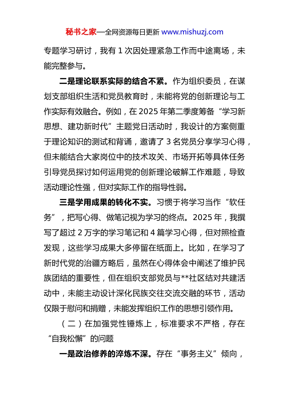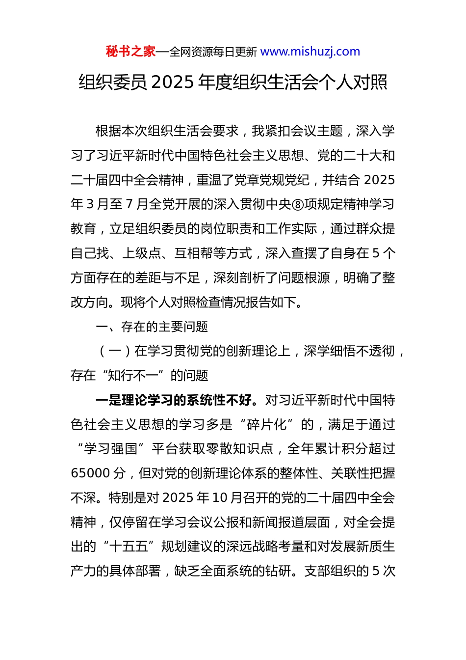 秘书之家—全网资源每日更新 www.mishuzj.com组织委员 2025 年度组织生活会个人对照根据本次组织生活会要求,我紧扣会议主题,深入学习了习近平新时代中国特色社会主义思想、党的二十大和二十届四中全会精神,重温了党章党规党纪,并结合 2025年 3 月至 7 月全党开展的深入贯彻中央⑧项规定精神学习教育,立足组织委员的岗位职责和工作实际,通过群众提自己找、上级点、互相帮等方式,深入查摆了自身在 5 个方面存在的差距与不足,深刻剖析了问题根源,明确了整改方向。现将个人对照检查情况报告如下。一、存在的主要问题(一)在学习贯彻党的创新理论上,深学细悟不透彻,存在“知行不一”的问题一是理论学习的系统性不好。对习近平新时代中国特色社会主义思想的学习多是“碎片化”的,满足于通过“学习强国”平台获取零散知识点,全年累计积分超过65000 分,但对党的创新理论体系的整体性、关联性把握不深。特别是对 2025 年 10 月召开的党的二十届四中全会精神,仅停留在学习会议公报和新闻报道层面,对全会提出的“十五五”规划建议的深远战略考量和对发展新质生产力的具体部署,缺乏全面系统的钻研。支部组织的 5 次秘书之家—全网资源每日更新 www.mishuzj.com专题学习研讨,我有 1 次因处理紧急工作而中途离场,未能完整参与。二是理论联系实际的结合不紧。作为组织委员,在谋划支部组织生活和党员教育时,未能将党的创新理论与工作实际有效融合。例如,在 2025 年第二季度筹备“学习新思想、建功新时代”主题党日活动时,我设计的方案侧重于理论知识的测试和背诵,邀请了 3 名党员分享学习心得,但未能结合大家岗位中的技术攻关、市场开拓等具体任务引导党员探讨如何运用党的创新理论破解工作难题,导致活动理论性强,但对实际工作的指导性弱。三是学用成果的转化不实。习惯于将学习当作“软任务”,把写心得、做笔记视为学习的终点。2025 年,我撰写了超过 2 万字的学习笔记和 4 篇学习心得,但对照检查发现,这些学习成果大多停留在纸面上。比如,在学习了新时代党的治疆方略后,虽然在心得体会中阐述了维护民族团结的重要性,但在组织支部党员与**社区结对共建活动中,未能主动设计深化民族交往交流交融的环节,活动仅限于慰问和捐赠,未能发挥组织工作的思想引领作用。(二)在加强党性锤炼上,标准要求不严格,存在“自我松懈”的问题一是政治修养的淬炼不深。存在“事务主义”倾向,秘书之家—全网资源每日更新 www.mishuzj.com认为作为组织委员,把发展党员、收缴党费、管理党员档案等具体工作做好就是讲政治。在日常工作中,过多地关注程序是否合规、材料是否齐全,而对党员的思想动态、政治表现的考察不够细致。2025 年,我与支部 32 名党员普遍谈心谈话仅 1 次,深度谈话不足 10 人,对个别党员出现的思想波动和情绪变化,未能第一时间察觉并予以引导政治敏锐性和政治鉴别力不强。二是纪律规矩的敬畏不强。对党的纪律规矩,特别是政治纪律和政治规矩,存在“与己无关”的麻痹思想,认为自己作为基层党员干部,只要不贪不腐,就不会触碰红线。在实际工作中,有时会将工作纪律等同于政治纪律。去年 11 月,在一次讨论预备党员转正的支委会上,会议已明确要求保密,但我会后在与一位老党员闲聊时,无意中透露了讨论的细节和结果,虽然未造成严重后果,但反映出我严守纪律的弦绷得不紧。三是斗争精神的磨砺不坚。面对意识形态领域的复杂斗争,缺乏主动亮剑的勇气。作为组织委员,有责任引导党员坚定立场,但在面对网络上一些抹黑党的历史、质疑党的政策的错误言论时,我多数时候选择“一划而过”或“不看不听”,而不是理直气壮地予以批驳和澄清。2025年全年,我仅在工作群中转发过 3 次正面宣传链接,主动秘书之家—全网资源每日更新 www.mishuzj.com撰写评论、引导舆论的次数为零,在维护党的形象和威信上,先锋模范作用发挥不彻底。(三)在联系服务职工群众上,宗旨意识不牢固,存在“高高在上”的问题一是深入基层的脚步不勤。习惯于坐在办公室通过电话、微信群了解情况、安排工作,与职工群众面对面交流少。2025 ...