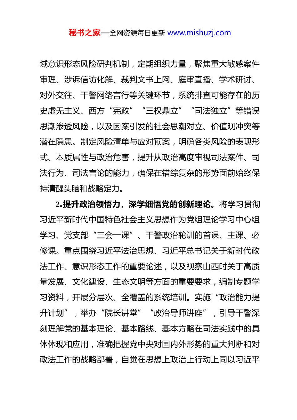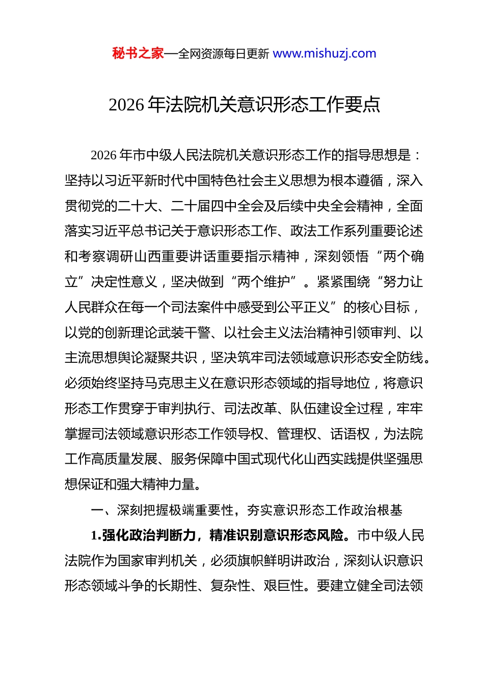 秘书之家—全网资源每日更新 www.mishuzj.com2026 年法院机关意识形态工作要点 2026 年市中级人民法院机关意识形态工作的指导思想是:坚持以习近平新时代中国特色社会主义思想为根本遵循,深入贯彻党的二十大、二十届四中全会及后续中央全会精神,全面落实习近平总书记关于意识形态工作、政法工作系列重要论述和考察调研山西重要讲话重要指示精神,深刻领悟“两个确立”决定性意义,坚决做到“两个维护”。紧紧围绕“努力让人民群众在每一个司法案件中感受到公平正义”的核心目标,以党的创新理论武装干警、以社会主义法治精神引领审判、以主流思想舆论凝聚共识,坚决筑牢司法领域意识形态安全防线。必须始终坚持马克思主义在意识形态领域的指导地位,将意识形态工作贯穿于审判执行、司法改革、队伍建设全过程,牢牢掌握司法领域意识形态工作领导权、管理权、话语权,为法院工作高质量发展、服务保障中国式现代化山西实践提供坚强思想保证和强大精神力量。一、深刻把握极端重要性,夯实意识形态工作政治根基1.强化政治判断力,精准识别意识形态风险。市中级人民法院作为国家审判机关,必须旗帜鲜明讲政治,深刻认识意识形态领域斗争的长期性、复杂性、艰巨性。要建立健全司法领秘书之家—全网资源每日更新 www.mishuzj.com域意识形态风险研判机制,定期组织力量,聚焦重大敏感案件审理、涉诉信访化解、裁判文书上网、庭审直播、学术研讨、对外交往、干警网络言行等关键环节,系统排查可能存在的历史虚无主义、西方“宪政”“三权鼎立”“司法独立”等错误思潮渗透风险,以及因案引发的社会思潮对立、价值观冲突等潜在隐患。制定风险清单与应对预案,明确各类风险的表现形式、本质属性与政治危害,提升从政治高度审视司法案件、司法行为、司法言论的能力,确保在错综复杂的形势面前始终保持清醒头脑和战略定力。2.提升政治领悟力,深学细悟党的创新理论。将学习贯彻习近平新时代中国特色社会主义思想作为党组理论学习中心组学习、党支部“三会一课”、干警政治轮训的首课、主课、必修课。重点围绕习近平法治思想、习近平总书记关于新时代政法工作、意识形态工作的重要论述,以及视察山西时关于高质量发展、文化建设、生态文明等方面的重要要求,编制专题学习资料,开展分层次、全覆盖的系统培训。实施“政治能力提升计划”,举办“院长讲堂”“政治导师讲座”,引导干警深刻理解党的基本理论、基本路线、基本方略在司法实践中的具体体现和应用,准确把握党中央对国内外形势的重大判断和对政法工作的战略部署,自觉在思想上政治上行动上同以习近平秘书之家—全网资源每日更新 www.mishuzj.com同志为核心的党中央保持高度一致,确保司法工作的正确政治方向。3.压实政治执行力,确保决策部署落地生根。坚持党对意识形态工作的绝对领导,严格落实意识形态工作责任制。修订完善本院《意识形态工作责任制实施细则》,明确党组主体责任、党组书记第一责任、分管领导直接责任、班子成员“一岗双责”以及各部门、各党支部的具体责任,形成横向到边、纵向到底的责任链条。将意识形态工作情况纳入党组重要议事日程,每年至少开展两次专题研究部署和综合分析研判。将意识形态工作责任制落实情况作为党建工作述职评议、领导班子和领导干部年度考核、干部选拔任用的核心指标,对履行责任不力、导致意识形态领域出现问题的严肃追责问责,以刚性制度保障党中央、省委、市委关于意识形态工作的各项决策部署在全市法院得到不折不扣贯彻执行。4.筑牢政治忠诚度,锻造过硬法院队伍。将意识形态要求融入干警队伍建设的血脉,作为衡量干警政治素质的首要标准。在干警招录、遴选、晋升、评优中,强化政治考察,建立政治素质档案,对政治上不合格的实行“一票否决”。开展“筑牢政治忠诚、践行法治信仰”主题教育实践活动,通过重温入党誓词、宪法宣誓、参观红色法治教育基地、学习先进典型事迹秘书之家—全网资源每日更新 www.mishuzj.com等多种形式,持续淬炼干警忠诚干净担当的政治品格。加强对青年干警的政治引领和思想淬炼,实施“青蓝相继”政治传承工程,由党员领导干部、优秀资深法官与青年干...