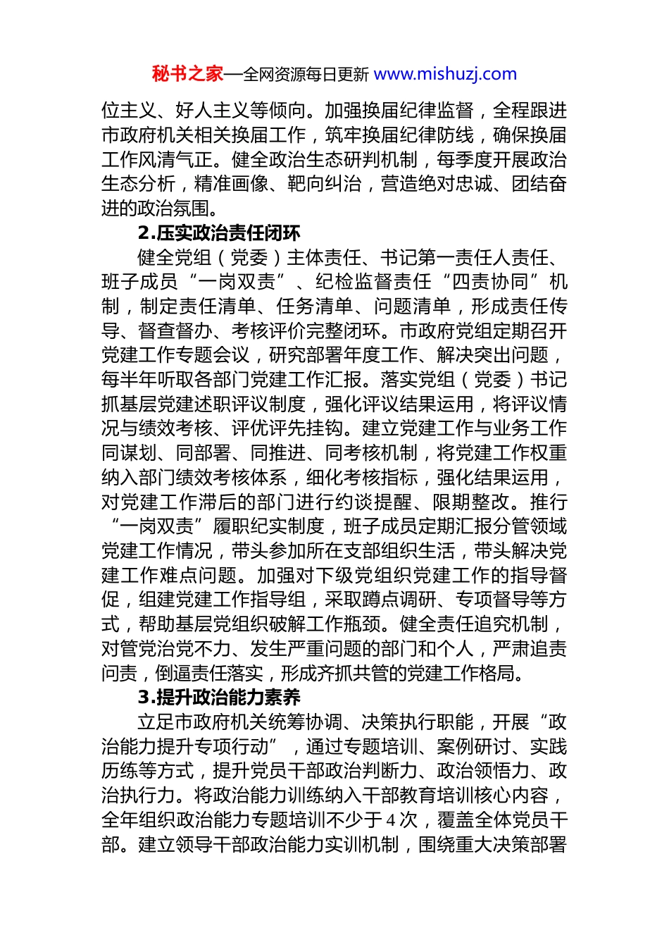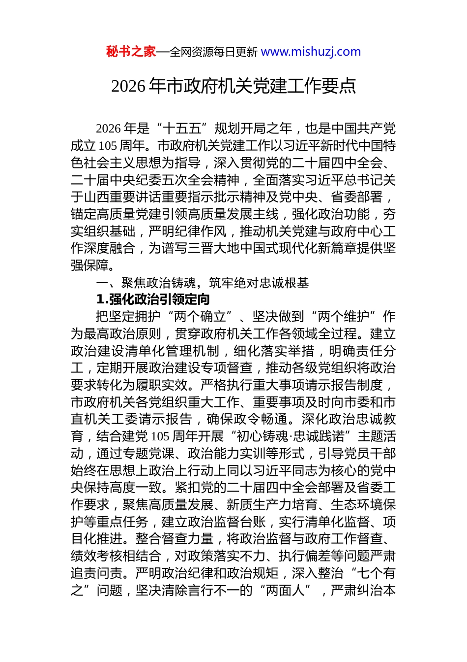 秘书之家—全网资源每日更新 www.mishuzj.com2026 年市政府机关党建工作要点2026 年是“十五五”规划开局之年,也是中国共产党成立 105 周年。市政府机关党建工作以习近平新时代中国特色社会主义思想为指导,深入贯彻党的二十届四中全会、二十届中央纪委五次全会精神,全面落实习近平总书记关于山西重要讲话重要指示批示精神及党中央、省委部署,锚定高质量党建引领高质量发展主线,强化政治功能,夯实组织基础,严明纪律作风,推动机关党建与政府中心工作深度融合,为谱写三晋大地中国式现代化新篇章提供坚强保障。一、聚焦政治铸魂,筑牢绝对忠诚根基1.强化政治引领定向把坚定拥护“两个确立”、坚决做到“两个维护”作为最高政治原则,贯穿政府机关工作各领域全过程。建立政治建设清单化管理机制,细化落实举措,明确责任分工,定期开展政治建设专项督查,推动各级党组织将政治要求转化为履职实效。严格执行重大事项请示报告制度,市政府机关各党组织重大工作、重要事项及时向市委和市直机关工委请示报告,确保政令畅通。深化政治忠诚教育,结合建党 105 周年开展“初心铸魂·忠诚践诺”主题活动,通过专题党课、政治能力实训等形式,引导党员干部始终在思想上政治上行动上同以习近平同志为核心的党中央保持高度一致。紧扣党的二十届四中全会部署及省委工作要求,聚焦高质量发展、新质生产力培育、生态环境保护等重点任务,建立政治监督台账,实行清单化监督、项目化推进。整合督查力量,将政治监督与政府工作督查、绩效考核相结合,对政策落实不力、执行偏差等问题严肃追责问责。严明政治纪律和政治规矩,深入整治“七个有之”问题,坚决清除言行不一的“两面人”,严肃纠治本秘书之家—全网资源每日更新 www.mishuzj.com位主义、好人主义等倾向。加强换届纪律监督,全程跟进市政府机关相关换届工作,筑牢换届纪律防线,确保换届工作风清气正。健全政治生态研判机制,每季度开展政治生态分析,精准画像、靶向纠治,营造绝对忠诚、团结奋进的政治氛围。2.压实政治责任闭环健全党组(党委)主体责任、书记第一责任人责任、班子成员“一岗双责”、纪检监督责任“四责协同”机制,制定责任清单、任务清单、问题清单,形成责任传导、督查督办、考核评价完整闭环。市政府党组定期召开党建工作专题会议,研究部署年度工作、解决突出问题,每半年听取各部门党建工作汇报。落实党组(党委)书记抓基层党建述职评议制度,强化评议结果运用,将评议情况与绩效考核、评优评先挂钩。建立党建工作与业务工作同谋划、同部署、同推进、同考核机制,将党建工作权重纳入部门绩效考核体系,细化考核指标,强化结果运用,对党建工作滞后的部门进行约谈提醒、限期整改。推行“一岗双责”履职纪实制度,班子成员定期汇报分管领域党建工作情况,带头参加所在支部组织生活,带头解决党建工作难点问题。加强对下级党组织党建工作的指导督促,组建党建工作指导组,采取蹲点调研、专项督导等方式,帮助基层党组织破解工作瓶颈。健全责任追究机制,对管党治党不力、发生严重问题的部门和个人,严肃追责问责,倒逼责任落实,形成齐抓共管的党建工作格局。3.提升政治能力素养立足市政府机关统筹协调、决策执行职能,开展“政治能力提升专项行动”,通过专题培训、案例研讨、实践历练等方式,提升党员干部政治判断力、政治领悟力、政治执行力。将政治能力训练纳入干部教育培训核心内容,全年组织政治能力专题培训不少于 4 次,覆盖全体党员干部。建立领导干部政治能力实训机制,围绕重大决策部署秘书之家—全网资源每日更新 www.mishuzj.com落实、复杂问题处置等开展模拟演练,增强干部应对复杂局面的政治能力。推行干部一线历练制度,选派党员干部到重大项目、重点工程、基层治理一线挂职锻炼,在实践中提升政治能力。建立政治能力评价机制,结合日常表现、工作实绩、关键时刻表现,对党员干部政治能力进行精准评价,作为干部选拔任用、评优评先的重要依据。加强意识形态工作,严格落实意识形态工作责任制,定期分析研判意识形态领域形势,加强对政府网站、政务新媒体等阵地管理,坚决防范化解意识...