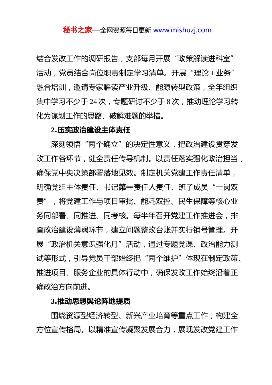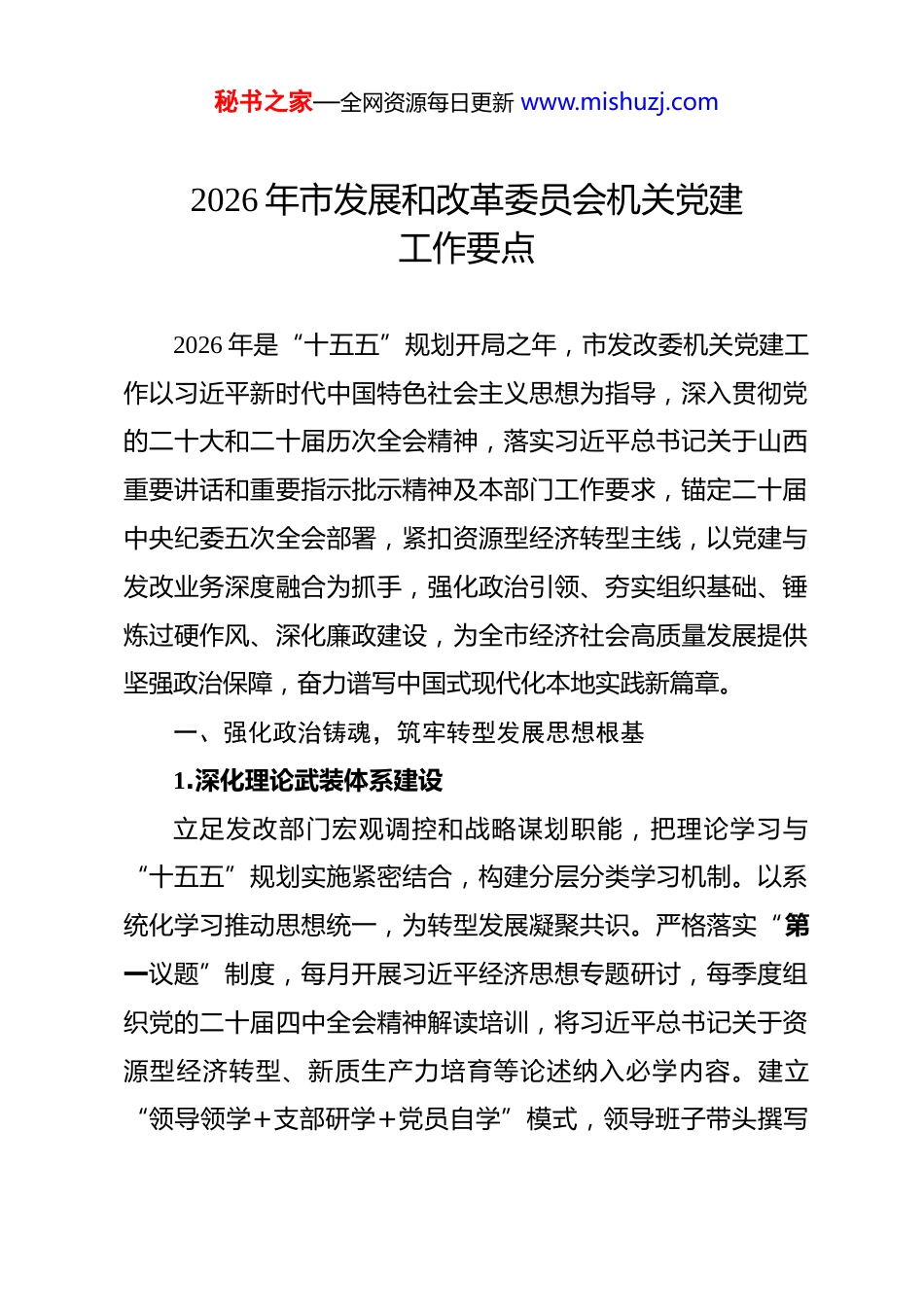 秘书之家—全网资源每日更新 www.mishuzj.com2026 年市发展和改革委员会机关党建工作要点 2026 年是“十五五”规划开局之年,市发改委机关党建工作以习近平新时代中国特色社会主义思想为指导,深入贯彻党的二十大和二十届历次全会精神,落实习近平总书记关于山西重要讲话和重要指示批示精神及本部门工作要求,锚定二十届中央纪委五次全会部署,紧扣资源型经济转型主线,以党建与发改业务深度融合为抓手,强化政治引领、夯实组织基础、锤炼过硬作风、深化廉政建设,为全市经济社会高质量发展提供坚强政治保障,奋力谱写中国式现代化本地实践新篇章。一、强化政治铸魂,筑牢转型发展思想根基1.深化理论武装体系建设立足发改部门宏观调控和战略谋划职能,把理论学习与“十五五”规划实施紧密结合,构建分层分类学习机制。以系统化学习推动思想统一,为转型发展凝聚共识。严格落实“第一议题”制度,每月开展习近平经济思想专题研讨,每季度组织党的二十届四中全会精神解读培训,将习近平总书记关于资源型经济转型、新质生产力培育等论述纳入必学内容。建立“领导领学+支部研学+党员自学”模式,领导班子带头撰写秘书之家—全网资源每日更新 www.mishuzj.com结合发改工作的调研报告,支部每月开展“政策解读进科室”活动,党员结合岗位职责制定学习清单。开展“理论+业务”融合培训,邀请专家解读产业升级、能源转型政策,全年组织集中学习不少于 24 次,专题研讨不少于 8 次,推动理论学习转化为谋划工作的思路、破解难题的举措。2.压实政治建设主体责任深刻领悟“两个确立”的决定性意义,把政治建设贯穿发改工作各环节,健全责任传导机制。以责任落实强化政治担当,确保党中央决策部署落地见效。制定机关党建工作责任清单,明确党组主体责任、书记第一责任人责任、班子成员“一岗双责”,将党建工作与项目审批、能耗双控、民生保障等核心业务同部署、同推进、同考核。每半年召开党建工作推进会,排查政治建设薄弱环节,建立问题整改台账并实行销号管理。开展“政治机关意识强化月”活动,通过专题党课、政治能力测试等形式,引导党员干部始终把“两个维护”体现在制定政策、推进项目、服务企业的具体行动中,确保发改工作始终沿着正确政治方向前进。3.推动思想舆论阵地提质围绕资源型经济转型、新兴产业培育等重点工作,构建全方位宣传格局。以精准宣传凝聚发展合力,展现发改党建工作秘书之家—全网资源每日更新 www.mishuzj.com成效。打造“转型发改之声”宣传品牌,利用机关官网、微信公众号开设党建专栏,每周推送政策解读、工作动态,每月发布党建与业务融合典型案例。结合百团大战精神传承,开展“红色基因赋能转型”主题活动,组织党员走进革命教育基地,拍摄转型发展宣传短片。加强舆情研判与应对,建立发改政策解读专班,及时回应社会关切,全年组织新闻发布会、政策吹风会不少于 4 次,营造支持转型发展的良好舆论氛围。4.深化主题教育成果转化巩固拓展主题教育成效,建立长效机制,推动成果转化与发改中心工作深度融合。以成果转化破解发展难题,提升服务高质量发展能力。开展“整改提升回头看”活动,对主题教育中发现的政策落实不到位、服务企业不精准等问题逐项核查,完善长效机制。组织“我为转型献良策”实践活动,聚焦产业升级、项目建设、民生保障等领域,征集党员干部意见建议并形成工作举措。建立“调研-决策-落实”闭环机制,领导班子牵头围绕新型能源体系建设、区域协调发展等课题开展专项调研,形成一批可落地的政策建议,推动主题教育成果转化为推动高质量发展的实际成效。二、聚焦强基固本,构建融合发展组织体系5.推进支部标准化规范化建设秘书之家—全网资源每日更新 www.mishuzj.com紧扣发改业务特点,以支部建设为抓手,打造政治功能强支部班子强、党员队伍强、作用发挥强的“四强”党支部。以标准化建设夯实组织基础,筑牢党建工作战斗堡垒。优化支部设置,根据业务科室职能调整支部划分,实现党建与业务同频共振。严格落实“三会一课”、组织生活会、民主评议党员等制度,推行支部工作清单化管理,每月开展支部工作督查,每季度组织交...