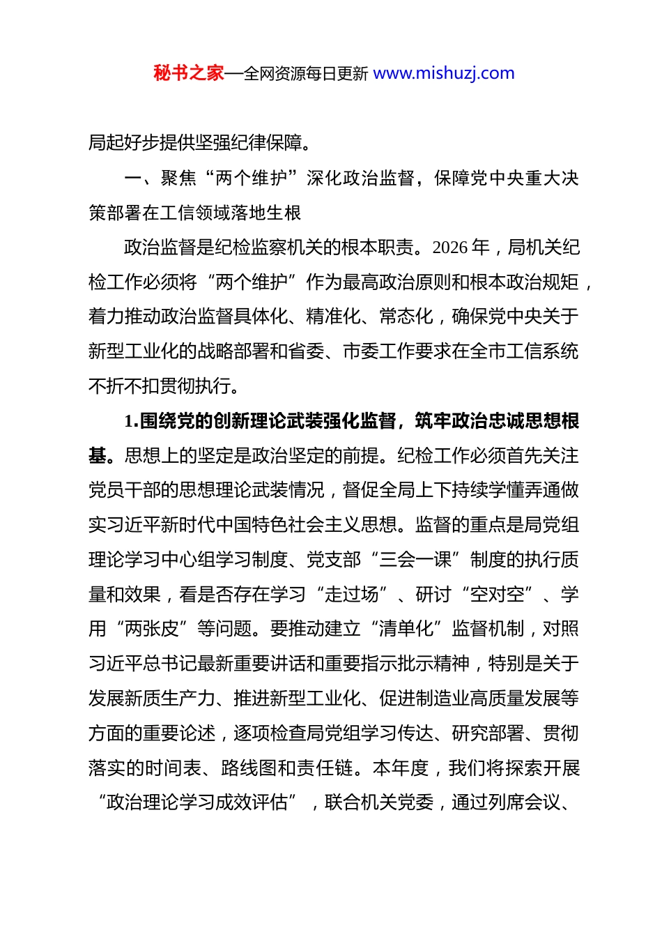 秘书之家—全网资源每日更新 www.mishuzj.com2026 年市工业和信息化局机关纪检工作要点 2026 年是实施“十五五”规划的开局之年,也是我们党成立 105 周年。做好本年度的机关纪检工作,责任重大、使命光荣。全年工作的指导思想是:坚持以习近平新时代中国特色社会主义思想为指导,全面贯彻党的二十大和二十届历次全会精神,深入学习贯彻习近平总书记关于党的建设的重要思想、关于党的自我革命的重要思想,坚决落实二十届中央纪委五次全会及省委、市委纪委全会部署要求。要深刻领悟“两个确立”的决定性意义,增强“四个意识”、坚定“四个自信”、做到“两个维护”,自觉将纪检工作置于全市工业和信息化发展大局中谋划推进。必须坚持全面从严治党战略方针,以党的政治建设为统领,聚焦主责主业,强化政治监督,深化正风肃纪反腐,持续提升纪检监察工作规范化、法治化、正规化水平。要紧紧围绕推进新型工业化、建设制造强市的中心任务,将严的主基调贯穿于产业政策制定、重大项目审批、专项资金分配、企业服务督导等权力运行全过程,着力防范化解在推进信息化与工业化深度融合、发展新质生产力过程中的廉政风险。通过标本兼治、系统施治,不断巩固发展风清气正的政治生态,为推动全市工业和信息化事业高质量发展、确保“十五五”开好秘书之家—全网资源每日更新 www.mishuzj.com局起好步提供坚强纪律保障。一、聚焦“两个维护”深化政治监督,保障党中央重大决策部署在工信领域落地生根政治监督是纪检监察机关的根本职责。2026 年,局机关纪检工作必须将“两个维护”作为最高政治原则和根本政治规矩,着力推动政治监督具体化、精准化、常态化,确保党中央关于新型工业化的战略部署和省委、市委工作要求在全市工信系统不折不扣贯彻执行。1.围绕党的创新理论武装强化监督,筑牢政治忠诚思想根基。思想上的坚定是政治坚定的前提。纪检工作必须首先关注党员干部的思想理论武装情况,督促全局上下持续学懂弄通做实习近平新时代中国特色社会主义思想。监督的重点是局党组理论学习中心组学习制度、党支部“三会一课”制度的执行质量和效果,看是否存在学习“走过场”、研讨“空对空”、学用“两张皮”等问题。要推动建立“清单化”监督机制,对照习近平总书记最新重要讲话和重要指示批示精神,特别是关于发展新质生产力、推进新型工业化、促进制造业高质量发展等方面的重要论述,逐项检查局党组学习传达、研究部署、贯彻落实的时间表、路线图和责任链。本年度,我们将探索开展“政治理论学习成效评估”,联合机关党委,通过列席会议、秘书之家—全网资源每日更新 www.mishuzj.com抽查笔记、组织应知应会知识测试、开展谈心谈话等方式,评估党员干部特别是领导干部运用党的创新理论指导实践、破解工业和信息化发展难题的实际能力。要坚决纠治学习中的形式主义,对心得体会照搬照抄、研讨发言脱离实际等现象进行通报批评,督促全局上下真正把学习成果转化为坚定理想信念、锤炼党性修养、推动事业发展的内生动力,确保在思想上政治上行动上始终同以习近平同志为核心的党中央保持高度一致。2.聚焦“国之大者”和核心职能跟进监督,护航新型工业化战略实施。政治监督必须有具体的着力点和落脚点。局机关纪检机构要紧紧围绕党中央因时因势作出的重大决策部署,紧密结合我市工业和信息化发展实际,开展嵌入式、跟踪式监督。监督的焦点要落在确保“十五五”工业和信息化领域开好局上,具体紧盯以下几个关键方面:一是监督推动制造业重点产业链高质量发展行动的实施,看是否存在地方保护、选择性支持或资金分配不公等问题,保障产业链供应链韧性和安全水平提升。二是监督促进产业科技创新政策落实,关注国家、省、市各级制造业创新中心建设、重大技术装备攻关、产业基础再造等工程中的项目遴选、资金使用和成果转化环节,防范廉政风险。三是监督数字经济与实体经济深度融合进程,对工业互联网创新发展、制造业数字化转型、中小企业数字化赋能等专项行动秘书之家—全网资源每日更新 www.mishuzj.com的推进情况开展监督,确保政策红利直达企业。四是监督绿色低碳发展要求贯彻执行,对淘汰落...