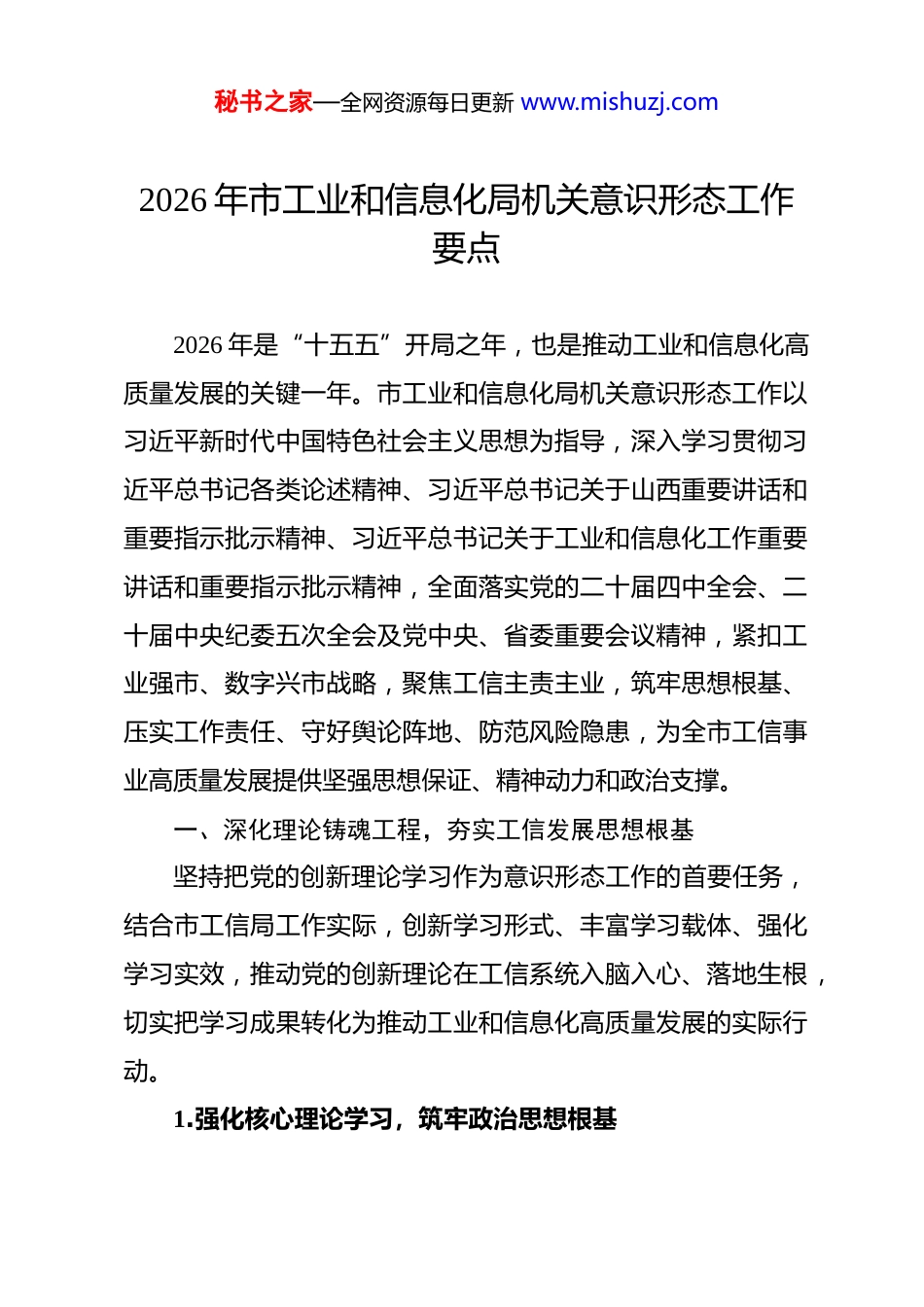 秘书之家—全网资源每日更新 www.mishuzj.com2026 年市工业和信息化局机关意识形态工作要点 2026 年是“十五五”开局之年,也是推动工业和信息化高质量发展的关键一年。市工业和信息化局机关意识形态工作以习近平新时代中国特色社会主义思想为指导,深入学习贯彻习近平总书记各类论述精神、习近平总书记关于山西重要讲话和重要指示批示精神、习近平总书记关于工业和信息化工作重要讲话和重要指示批示精神,全面落实党的二十届四中全会、二十届中央纪委五次全会及党中央、省委重要会议精神,紧扣工业强市、数字兴市战略,聚焦工信主责主业,筑牢思想根基、压实工作责任、守好舆论阵地、防范风险隐患,为全市工信事业高质量发展提供坚强思想保证、精神动力和政治支撑。一、深化理论铸魂工程,夯实工信发展思想根基坚持把党的创新理论学习作为意识形态工作的首要任务,结合市工信局工作实际,创新学习形式、丰富学习载体、强化学习实效,推动党的创新理论在工信系统入脑入心、落地生根,切实把学习成果转化为推动工业和信息化高质量发展的实际行动。1.强化核心理论学习,筑牢政治思想根基秘书之家—全网资源每日更新 www.mishuzj.com坚持把学习贯彻习近平新时代中国特色社会主义思想作为首要政治任务,严格落实“第一议题”制度,将习近平总书记各类论述精神、习近平总书记关于山西重要讲话和重要指示批示精神、习近平总书记关于工业和信息化工作重要讲话和重要指示批示精神纳入局党组理论学习中心组、机关党支部“三会一课”、主题党日核心学习内容,做到学习跟进、认识跟进、行动跟进。结合工信工作职能,制定详细年度学习计划,明确学习重点、细化学习安排、严格学习要求,每月开展 1 次党组理论学习中心组集中学习研讨,每季度开展 1 次专题学习交流,机关党支部每月开展 1 次集中学习、每季度开展 1 次专题研讨,推动理论学习常态化、制度化、规范化。建立领导领学导学机制,局党组书记带头领学宣讲,班子成员结合分管领域工作带头开展专题研讨、带头撰写学习心得,带动全体党员干部深学细悟、融会贯通。开展“理论学习提升年”特色活动,通过专题讲座、集中研学、线上学习、知识竞赛等多种形式,深化对党的创新理论的理解和把握,切实把学习成果转化为谋划工信工作的思路、推动工信工作的举措、解决实际问题的能力,不断提高全体党员干部的政治判断力、政治领悟力、政治执行力。2.聚焦会议精神落实,凝聚发展奋进力量紧扣党的二十届四中全会、二十届中央纪委五次全会及党秘书之家—全网资源每日更新 www.mishuzj.com中央、省委重要会议精神,结合市工信局工作实际,制定专项学习贯彻方案,细化落实举措,层层传达学习、层层部署落实,确保各项会议精神在工信系统落地见效。围绕党的二十届四中全会关于推进国家治理体系和治理能力现代化的部署要求,聚焦工业和信息化领域治理能力提升,组织开展专题学习研讨,找准工作切入点和着力点,推动全会精神与工信工作深度融合。深入学习贯彻二十届中央纪委五次全会公报精神,强化纪律意识、规矩意识,将全面从严治党要求贯穿意识形态工作全过程、各环节,切实筑牢拒腐防变的思想防线。建立会议精神落实台账,明确责任分工、落实时限、工作标准,定期开展督查检查,及时发现问题、补齐短板,确保各项部署要求落地生根。开展“学精神、谈体会、促发展”主题实践活动,组织全体党员干部结合岗位职责,谈学习体会、谋工作思路、定落实举措,凝聚起推动全市工信事业高质量发展的强大合力,切实把思想和行动统一到党中央和省委、市委的决策部署上来。3.创新学习载体形式,提升学习实际成效打破传统学习模式局限,结合工信工作特点和党员干部学习需求,创新学习载体、丰富学习形式,增强理论学习的针对性、实效性和吸引力。打造“工信讲堂”学习品牌,每月邀请专家学者、业务骨干开展专题讲座,围绕工业转型升级、数字秘书之家—全网资源每日更新 www.mishuzj.com经济发展、产业集群培育等重点领域,解读政策法规、分享工作经验、破解发展难题。推行“线上+线下”融合学习模式,线下依托党员活动室、新时代文明实践站开展集中学...