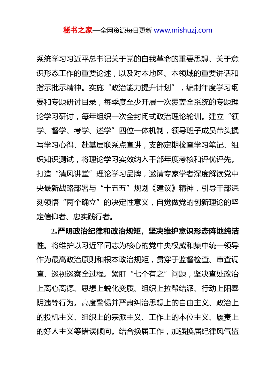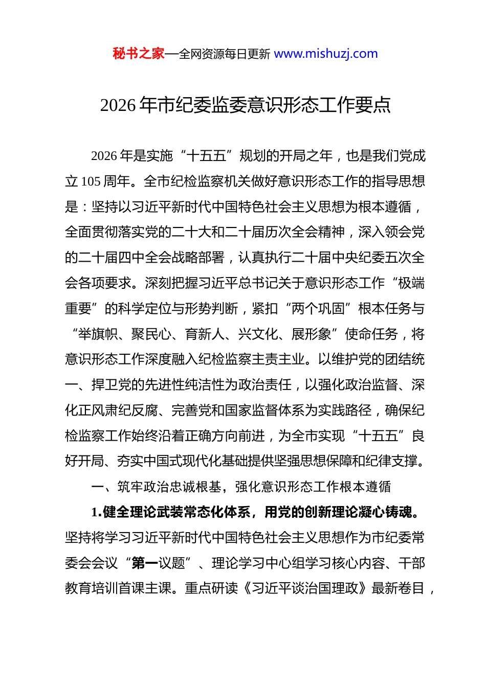 秘书之家—全网资源每日更新 www.mishuzj.com2026 年市纪委监委意识形态工作要点 2026 年是实施“十五五”规划的开局之年,也是我们党成立 105 周年。全市纪检监察机关做好意识形态工作的指导思想是:坚持以习近平新时代中国特色社会主义思想为根本遵循,全面贯彻落实党的二十大和二十届历次全会精神,深入领会党的二十届四中全会战略部署,认真执行二十届中央纪委五次全会各项要求。深刻把握习近平总书记关于意识形态工作“极端重要”的科学定位与形势判断,紧扣“两个巩固”根本任务与“举旗帜、聚民心、育新人、兴文化、展形象”使命任务,将意识形态工作深度融入纪检监察主责主业。以维护党的团结统一、捍卫党的先进性纯洁性为政治责任,以强化政治监督、深化正风肃纪反腐、完善党和国家监督体系为实践路径,确保纪检监察工作始终沿着正确方向前进,为全市实现“十五五”良好开局、夯实中国式现代化基础提供坚强思想保障和纪律支撑。一、筑牢政治忠诚根基,强化意识形态工作根本遵循1.健全理论武装常态化体系,用党的创新理论凝心铸魂。坚持将学习习近平新时代中国特色社会主义思想作为市纪委常委会会议“第一议题”、理论学习中心组学习核心内容、干部教育培训首课主课。重点研读《习近平谈治国理政》最新卷目,秘书之家—全网资源每日更新 www.mishuzj.com系统学习习近平总书记关于党的自我革命的重要思想、关于意识形态工作的重要论述,以及对本地区、本领域的重要讲话和指示批示精神。实施“政治能力提升计划”,编制年度学习纲要和专题研讨目录,每季度至少开展一次覆盖全系统的专题理论学习研讨,每年组织一次全封闭式政治理论轮训。建立“领学、督学、考学、述学”四位一体机制,领导班子成员带头撰写学习心得、赴基层联系点宣讲,支部定期检查学习笔记、组织知识测试,将理论学习实效纳入干部年度考核和评优评先。打造“清风讲堂”理论学习品牌,邀请专家学者深度解读党中央最新战略部署与“十五五”规划《建议》精神,引导干部深刻领悟“两个确立”的决定性意义,自觉做党的创新理论的坚定信仰者、忠实践行者。2.严明政治纪律和政治规矩,坚决维护意识形态阵地纯洁性。将维护以习近平同志为核心的党中央权威和集中统一领导作为最高政治原则和根本政治规矩,贯穿于监督检查、审查调查、巡视巡察全过程。紧盯“七个有之”问题,坚决查处政治上离心离德、思想上蜕化变质、组织上拉帮结派、行动上阳奉阴违等行为。高度警惕并严肃纠治思想上的自由主义、政治上的投机主义、组织上的宗派主义、工作上的本位主义、履责上的好人主义等错误倾向。结合换届工作,加强换届纪律风气监秘书之家—全网资源每日更新 www.mishuzj.com督,对拉票贿选、说情打招呼、破坏选举等行为“零容忍”。开展“政治纪律专项督查”行动,重点排查党员干部在公开场合、社交媒体、课堂讲坛、出版物中发表、传播同党中央精神相违背的言论,妄议中央大政方针,破坏党的集中统一等行为,及时清除“两面人”“伪忠诚”,确保意识形态阵地寸土不失。3.聚焦“国之大者”深化政治监督,保障党中央重大决策部署落地生根。紧紧围绕党的二十大战略部署和“十五五”规划《建议》确定的重大战略任务开展监督。聚焦完整准确全面贯彻新发展理念、构建新发展格局、推动高质量发展等关键环节。将意识形态工作要求融入对建设现代化产业体系、发展新质生产力、深化改革开放、促进共同富裕、防范化解重大风险、维护国家“五大安全”等中心工作的监督检查中。制定“年度政治监督重点事项清单”,实施“清单化管理、项目化推进、动态化跟踪”。建立与发改、财政、农业农村、生态环境等职能部门的常态化会商机制,及时掌握重大政策、项目、资金落实中的思想动向和风险点。对在落实党中央决策部署中打折扣、搞变通、做选择,以及空喊口号、行动少落实差等形式主义、官僚主义问题,精准执纪问责,以严明纪律确保政令畅通、思想统一。4.构建政治生态研判预警机制,营造风清气正干事创业环秘书之家—全网资源每日更新 www.mishuzj.com境。意识形态安全与政治生态状况息息相关。建立覆盖市、县(区)、重点部门的政治生...
