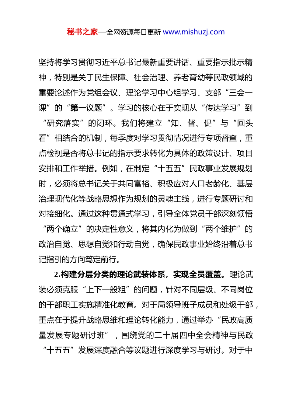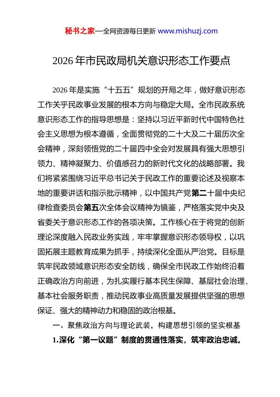 秘书之家—全网资源每日更新 www.mishuzj.com2026 年市民政局机关意识形态工作要点 2026 年是实施“十五五”规划的开局之年,做好意识形态工作关乎民政事业发展的根本方向与稳定大局。全市民政系统意识形态工作的指导思想是:坚持以习近平新时代中国特色社会主义思想为根本遵循,全面贯彻党的二十大及二十届历次全会精神,深刻领悟党的二十届四中全会对发展具有强大思想引领力、精神凝聚力、价值感召力的新时代文化的战略部署。我们将紧紧围绕习近平总书记关于民政工作的重要论述及视察本地的重要讲话和指示批示精神,以中国共产党第二十届中央纪律检查委员会第五次全体会议精神为镜鉴,严格落实党中央及省委关于意识形态工作的各项决策。工作核心在于将党的创新理论深度融入民政业务实践,牢牢掌握意识形态领导权,以巩固拓展主题教育成果为抓手,持续深化全面从严治党。目标是筑牢民政领域意识形态安全防线,确保全市民政工作始终沿着正确政治方向前进,为扎实履行基本民生保障、基层社会治理、基本社会服务职责,推动民政事业高质量发展提供坚强的思想保证、强大的精神动力和稳固的政治根基。一、聚焦政治方向与理论武装,构建思想引领的坚实根基1.深化“第一议题”制度的贯通性落实,筑牢政治忠诚。秘书之家—全网资源每日更新 www.mishuzj.com坚持将学习贯彻习近平总书记最新重要讲话、重要指示批示精神,特别是关于民生保障、社会治理、养老育幼等民政领域的重要论述作为党组会议、理论学习中心组学习、支部“三会一课”的“第一议题”。学习的核心在于实现从“传达学习”到“研究落实”的闭环。我们将建立“知、督、促”与“回头看”相结合的机制,每季度对学习贯彻情况进行专项督查,重点检视是否将总书记的指示要求转化为具体的政策设计、项目安排和工作举措。例如,在制定“十五五”民政事业发展规划时,必须将总书记关于共同富裕、积极应对人口老龄化、基层治理现代化等战略思想作为规划的灵魂主线,进行专题研讨和对接细化。通过这种贯通式学习,引导全体党员干部深刻领悟“两个确立”的决定性意义,将其内化为做到“两个维护”的政治自觉、思想自觉和行动自觉,确保民政事业始终沿着总书记指引的方向笃定前行。2.构建分层分类的理论武装体系,实现全员覆盖。理论武装必须克服“上下一般粗”的问题,针对不同层级、不同岗位的干部职工实施精准化教育。对于局领导班子成员和处级干部,重点在于提升战略思维和理论转化能力,通过举办“民政高质量发展专题研讨班”,围绕党的二十届四中全会精神与民政“十五五”发展深度融合等议题进行深度学习与研讨。对于中秘书之家—全网资源每日更新 www.mishuzj.com层业务骨干,侧重政策解读与执行力培养,开展“政策前沿与实务创新”系列讲座,将党的创新理论分解落实到社会救助、养老服务、儿童福利等具体业务的政策完善中。对于一线窗口和基层服务人员,则强化服务宗旨和职业道德教育,编制《民政为民服务言行指引》,将“人民至上”的价值理念转化为热情、规范、高效的服务行为。同时,利用线上学习平台,打造“民政云课堂”,推送微党课、政策动漫解读等学习产品,确保理论学习的时效性与覆盖面,让党的声音穿透层级、抵达末梢。3.开展民政领域专项课题研究,推动学用转化。理论学习的生命力在于实践应用。2026 年,我们将设立“民政工作思想政治引领”专项研究课题,鼓励并组织力量,围绕“意识形态工作如何嵌入养老服务综合监管”、“社会救助中的思想政治引导方法”、“殡葬改革移风易俗的文化认同路径”等现实命题进行深入调研。研究成果不仅要形成理论文章,更要转化为可操作的工作指南、培训教材或政策建议。例如,针对养老机构,可研究制定《机构内老年人思想政治引导与服务融合工作规范》;针对社区治理,可总结提炼“党建引领下社区社会组织参与意识形态建设的实践模式”。通过以研促学、以学促干,切实解决理论学习与业务工作“两张皮”的问题,将思想引领秘书之家—全网资源每日更新 www.mishuzj.com力有效转化为推动民政事业改革发展的实践动力。4.强化政治机关属性教育,塑造鲜明政治品格。民政机关首先是...