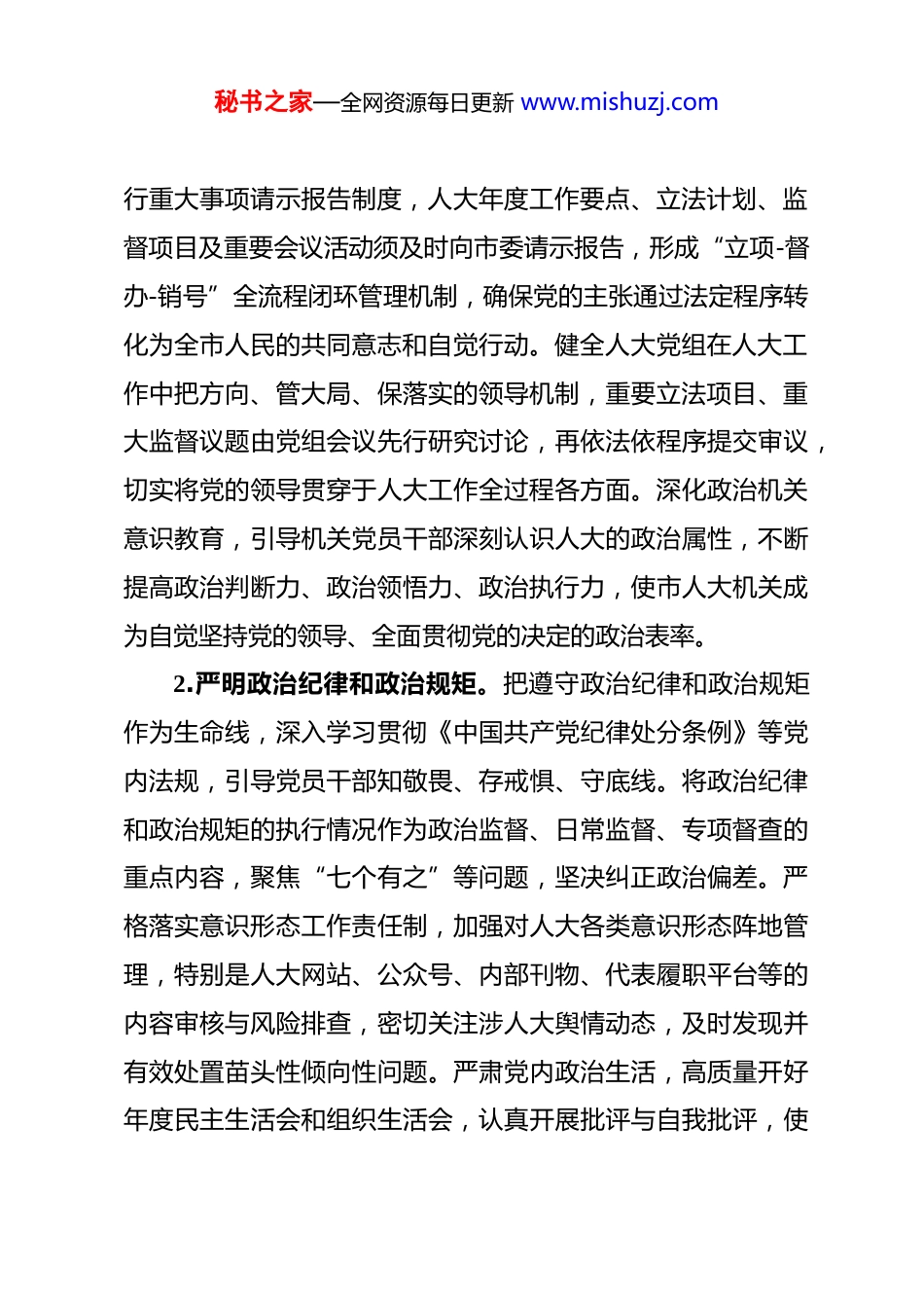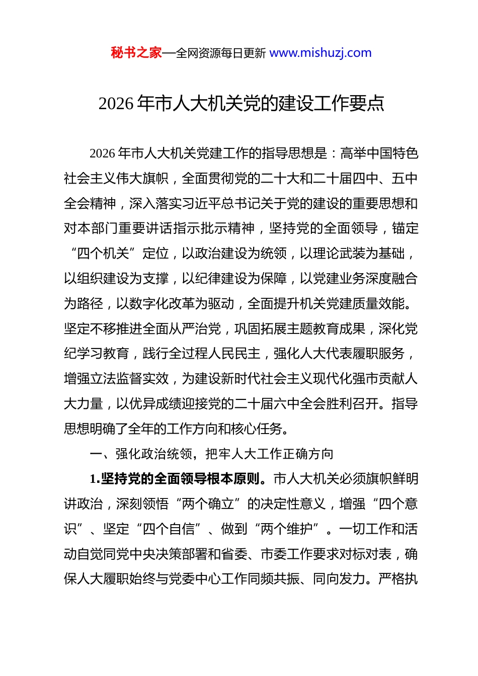 秘书之家—全网资源每日更新 www.mishuzj.com2026 年市人大机关党的建设工作要点 2026 年市人大机关党建工作的指导思想是:高举中国特色社会主义伟大旗帜,全面贯彻党的二十大和二十届四中、五中全会精神,深入落实习近平总书记关于党的建设的重要思想和对本部门重要讲话指示批示精神,坚持党的全面领导,锚定“四个机关”定位,以政治建设为统领,以理论武装为基础,以组织建设为支撑,以纪律建设为保障,以党建业务深度融合为路径,以数字化改革为驱动,全面提升机关党建质量效能。坚定不移推进全面从严治党,巩固拓展主题教育成果,深化党纪学习教育,践行全过程人民民主,强化人大代表履职服务,增强立法监督实效,为建设新时代社会主义现代化强市贡献人大力量,以优异成绩迎接党的二十届六中全会胜利召开。指导思想明确了全年的工作方向和核心任务。一、强化政治统领,把牢人大工作正确方向1.坚持党的全面领导根本原则。市人大机关必须旗帜鲜明讲政治,深刻领悟“两个确立”的决定性意义,增强“四个意识”、坚定“四个自信”、做到“两个维护”。一切工作和活动自觉同党中央决策部署和省委、市委工作要求对标对表,确保人大履职始终与党委中心工作同频共振、同向发力。严格执秘书之家—全网资源每日更新 www.mishuzj.com行重大事项请示报告制度,人大年度工作要点、立法计划、监督项目及重要会议活动须及时向市委请示报告,形成“立项-督办-销号”全流程闭环管理机制,确保党的主张通过法定程序转化为全市人民的共同意志和自觉行动。健全人大党组在人大工作中把方向、管大局、保落实的领导机制,重要立法项目、重大监督议题由党组会议先行研究讨论,再依法依程序提交审议,切实将党的领导贯穿于人大工作全过程各方面。深化政治机关意识教育,引导机关党员干部深刻认识人大的政治属性,不断提高政治判断力、政治领悟力、政治执行力,使市人大机关成为自觉坚持党的领导、全面贯彻党的决定的政治表率。2.严明政治纪律和政治规矩。把遵守政治纪律和政治规矩作为生命线,深入学习贯彻《中国共产党纪律处分条例》等党内法规,引导党员干部知敬畏、存戒惧、守底线。将政治纪律和政治规矩的执行情况作为政治监督、日常监督、专项督查的重点内容,聚焦“七个有之”等问题,坚决纠正政治偏差。严格落实意识形态工作责任制,加强对人大各类意识形态阵地管理,特别是人大网站、公众号、内部刊物、代表履职平台等的内容审核与风险排查,密切关注涉人大舆情动态,及时发现并有效处置苗头性倾向性问题。严肃党内政治生活,高质量开好年度民主生活会和组织生活会,认真开展批评与自我批评,使秘书之家—全网资源每日更新 www.mishuzj.com红脸出汗成为常态,增强党内政治生活的政治性、时代性、原则性、战斗性。强化党员干部在立法、监督、决定、任免等各项履职中的政治纪律约束,确保人大工作始终在法治轨道上和政治规矩内运行。3.提升政治能力担当本领。着力提升机关党员干部特别是领导干部的政治能力,围绕大局思考、着眼大局行动的能力。加强战略思维训练,组织党员干部深入学习领会党中央对国家发展大政方针和战略部署的深刻内涵,提高在人大工作中服务国家战略和区域发展的前瞻性、系统性。增强斗争精神,提高斗争本领,面对立法中的难点、监督中的堵点、代表关切的热点,敢于担当、善于作为,依法依规推动问题解决。开展政治能力专题培训,将政治能力培养融入干部选育管用全过程,注重在重大立法项目、复杂监督议题、急难险重任务中锤炼干部的政治素养。建立健全党员干部政治表现考察评价机制,在年度考核、评先评优、干部选拔中突出政治标准,引导干部自觉加强政治能力训练和政治实践历练。4.筑牢政治忠诚思想根基。持续加强理想信念教育和对党忠诚教育,引导党员干部深刻理解党的百年奋斗重大成就和历史经验,传承红色基因,赓续红色血脉。充分利用本地红色教育资源,如革命遗址、纪念场馆、党史教育基地等,开展“沉秘书之家—全网资源每日更新 www.mishuzj.com浸式”现场教学,强化历史认知和政治认同。常态化开展“循迹溯源”活动,沿着习近平总书记考察视察的足迹,感悟思...