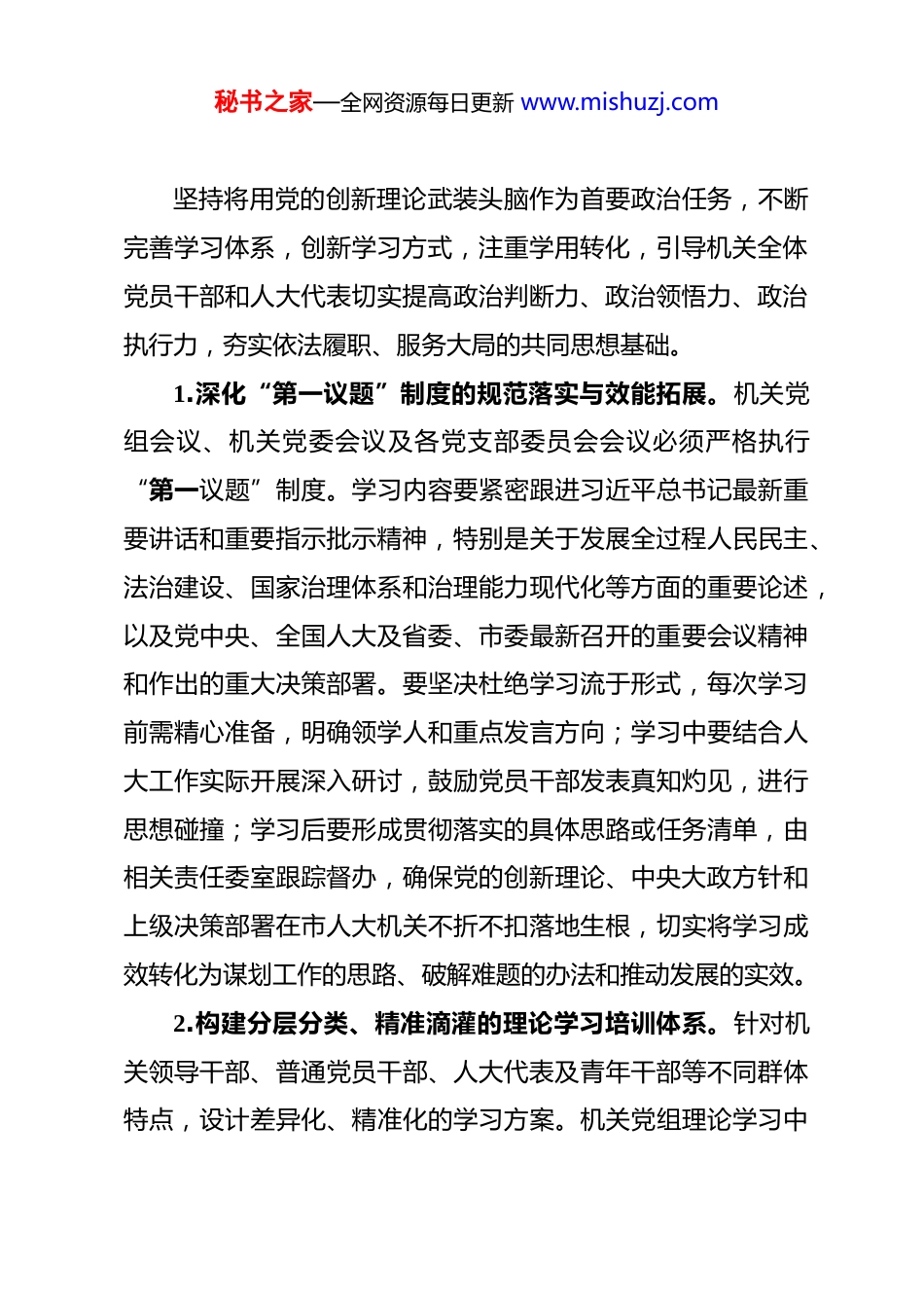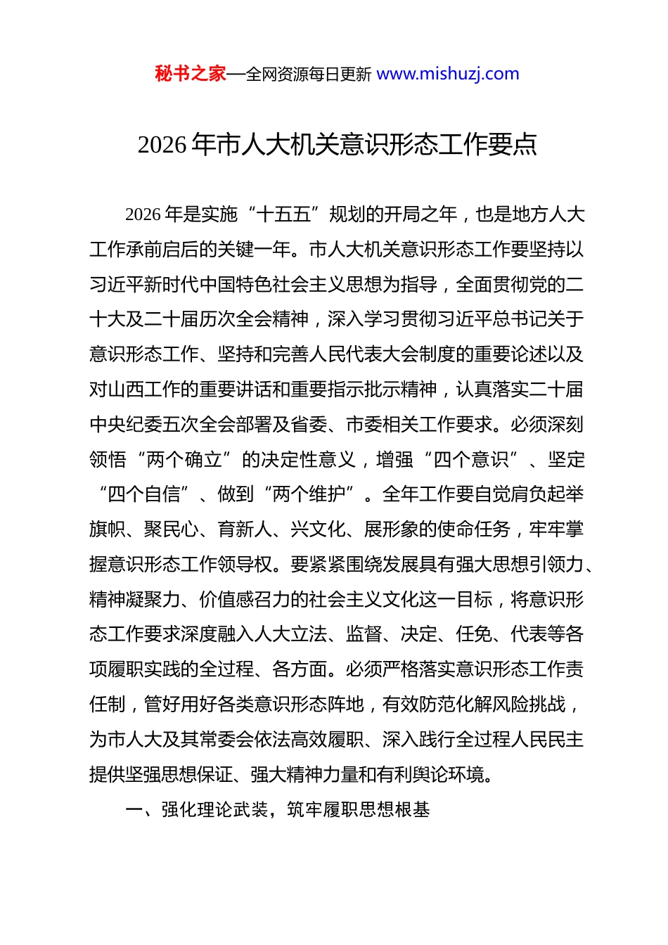 秘书之家—全网资源每日更新 www.mishuzj.com2026 年市人大机关意识形态工作要点 2026 年是实施“十五五”规划的开局之年,也是地方人大工作承前启后的关键一年。市人大机关意识形态工作要坚持以习近平新时代中国特色社会主义思想为指导,全面贯彻党的二十大及二十届历次全会精神,深入学习贯彻习近平总书记关于意识形态工作、坚持和完善人民代表大会制度的重要论述以及对山西工作的重要讲话和重要指示批示精神,认真落实二十届中央纪委五次全会部署及省委、市委相关工作要求。必须深刻领悟“两个确立”的决定性意义,增强“四个意识”、坚定“四个自信”、做到“两个维护”。全年工作要自觉肩负起举旗帜、聚民心、育新人、兴文化、展形象的使命任务,牢牢掌握意识形态工作领导权。要紧紧围绕发展具有强大思想引领力、精神凝聚力、价值感召力的社会主义文化这一目标,将意识形态工作要求深度融入人大立法、监督、决定、任免、代表等各项履职实践的全过程、各方面。必须严格落实意识形态工作责任制,管好用好各类意识形态阵地,有效防范化解风险挑战,为市人大及其常委会依法高效履职、深入践行全过程人民民主提供坚强思想保证、强大精神力量和有利舆论环境。一、强化理论武装,筑牢履职思想根基秘书之家—全网资源每日更新 www.mishuzj.com坚持将用党的创新理论武装头脑作为首要政治任务,不断完善学习体系,创新学习方式,注重学用转化,引导机关全体党员干部和人大代表切实提高政治判断力、政治领悟力、政治执行力,夯实依法履职、服务大局的共同思想基础。1.深化“第一议题”制度的规范落实与效能拓展。机关党组会议、机关党委会议及各党支部委员会会议必须严格执行“第一议题”制度。学习内容要紧密跟进习近平总书记最新重要讲话和重要指示批示精神,特别是关于发展全过程人民民主、法治建设、国家治理体系和治理能力现代化等方面的重要论述,以及党中央、全国人大及省委、市委最新召开的重要会议精神和作出的重大决策部署。要坚决杜绝学习流于形式,每次学习前需精心准备,明确领学人和重点发言方向;学习中要结合人大工作实际开展深入研讨,鼓励党员干部发表真知灼见,进行思想碰撞;学习后要形成贯彻落实的具体思路或任务清单,由相关责任委室跟踪督办,确保党的创新理论、中央大政方针和上级决策部署在市人大机关不折不扣落地生根,切实将学习成效转化为谋划工作的思路、破解难题的办法和推动发展的实效。2.构建分层分类、精准滴灌的理论学习培训体系。针对机关领导干部、普通党员干部、人大代表及青年干部等不同群体特点,设计差异化、精准化的学习方案。机关党组理论学习中秘书之家—全网资源每日更新 www.mishuzj.com心组要发挥示范引领作用,全年围绕“中国式现代化与人大作为”、“新质生产力发展的法治保障”、“总体国家安全观下的风险防范”、“中华优秀传统法律文化的传承与发展”等重大主题开展专题学习研讨不少于 6 次,中心组成员需结合分管工作撰写高质量调研报告或理论文章。依托市委党校、干部网络学院等平台,举办市人大代表履职能力提升班和机关干部专题培训班,将意识形态工作作为必修课程。各党支部要利用“三会一课”、主题党日,采取“理论+业务”、“理论+案例”、“理论+实践”等模式,开展对象化、分众化的学习活动。建立青年理论学习小组,开展“读原著、学原文、悟原理”读书沙龙和“人大青年说”主题论坛,激发青年干部理论学习的主动性和创造性,培养理论宣传骨干后备力量。3.创新理论宣传宣讲的载体形式与话语体系。组建由常委会领导、专委会负责同志、理论功底扎实的代表和机关干部组成的“人大理论宣讲团”。宣讲活动要改变单向灌输模式,积极探索“互动式、研讨式、场景式”宣讲。利用代表联络站、基层立法联系点等阵地,结合立法调研、执法检查、代表视察等活动,将理论宣讲融入履职场景,用群众听得懂的语言、身边看得见的事例,宣讲国家根本政治制度的优越性和全过程人民民主的生动实践。精心制作一批契合网络传播规律、展现人秘书之家—全网资源每日更新 www.mishuzj.com大工作特色的短视频、动漫图解、H5 等新媒体产品,在...