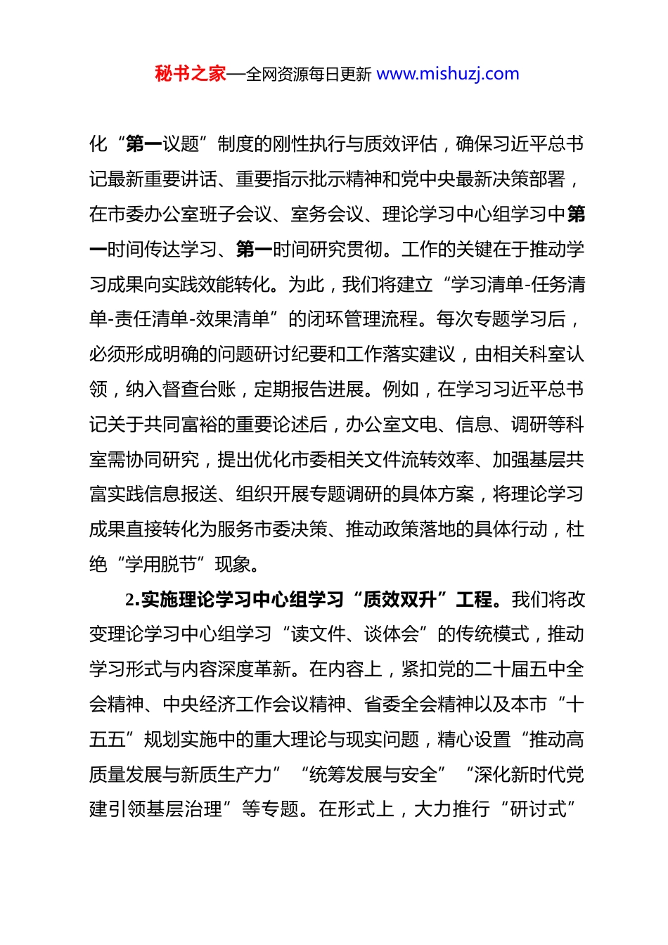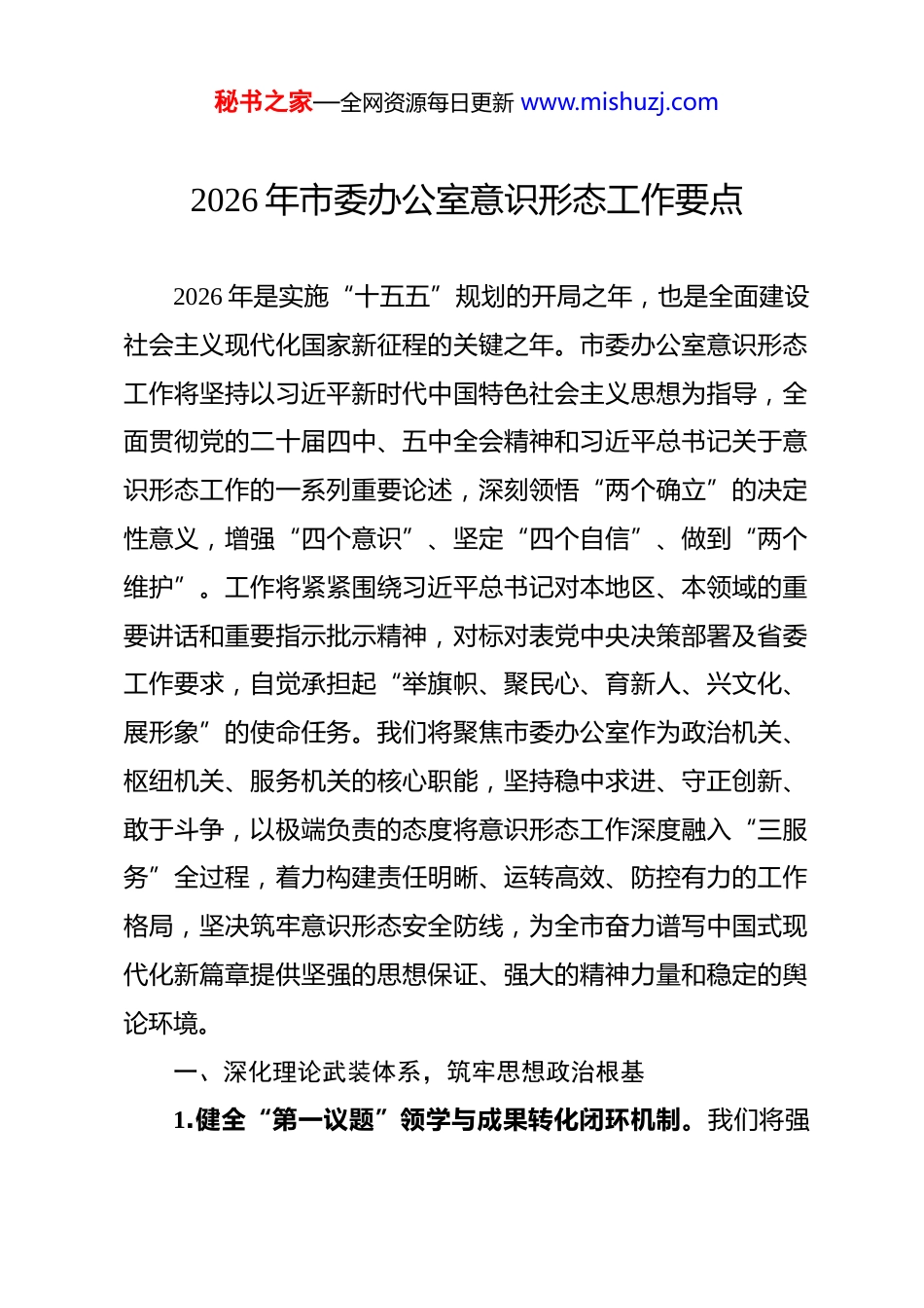 秘书之家—全网资源每日更新 www.mishuzj.com2026 年市委办公室意识形态工作要点 2026 年是实施“十五五”规划的开局之年,也是全面建设社会主义现代化国家新征程的关键之年。市委办公室意识形态工作将坚持以习近平新时代中国特色社会主义思想为指导,全面贯彻党的二十届四中、五中全会精神和习近平总书记关于意识形态工作的一系列重要论述,深刻领悟“两个确立”的决定性意义,增强“四个意识”、坚定“四个自信”、做到“两个维护”。工作将紧紧围绕习近平总书记对本地区、本领域的重要讲话和重要指示批示精神,对标对表党中央决策部署及省委工作要求,自觉承担起“举旗帜、聚民心、育新人、兴文化、展形象”的使命任务。我们将聚焦市委办公室作为政治机关、枢纽机关、服务机关的核心职能,坚持稳中求进、守正创新、敢于斗争,以极端负责的态度将意识形态工作深度融入“三服务”全过程,着力构建责任明晰、运转高效、防控有力的工作格局,坚决筑牢意识形态安全防线,为全市奋力谱写中国式现代化新篇章提供坚强的思想保证、强大的精神力量和稳定的舆论环境。一、深化理论武装体系,筑牢思想政治根基1.健全“第一议题”领学与成果转化闭环机制。我们将强秘书之家—全网资源每日更新 www.mishuzj.com化“第一议题”制度的刚性执行与质效评估,确保习近平总书记最新重要讲话、重要指示批示精神和党中央最新决策部署,在市委办公室班子会议、室务会议、理论学习中心组学习中第一时间传达学习、第一时间研究贯彻。工作的关键在于推动学习成果向实践效能转化。为此,我们将建立“学习清单-任务清单-责任清单-效果清单”的闭环管理流程。每次专题学习后,必须形成明确的问题研讨纪要和工作落实建议,由相关科室认领,纳入督查台账,定期报告进展。例如,在学习习近平总书记关于共同富裕的重要论述后,办公室文电、信息、调研等科室需协同研究,提出优化市委相关文件流转效率、加强基层共富实践信息报送、组织开展专题调研的具体方案,将理论学习成果直接转化为服务市委决策、推动政策落地的具体行动,杜绝“学用脱节”现象。2.实施理论学习中心组学习“质效双升”工程。我们将改变理论学习中心组学习“读文件、谈体会”的传统模式,推动学习形式与内容深度革新。在内容上,紧扣党的二十届五中全会精神、中央经济工作会议精神、省委全会精神以及本市“十五五”规划实施中的重大理论与现实问题,精心设置“推动高质量发展与新质生产力”“统筹发展与安全”“深化新时代党建引领基层治理”等专题。在形式上,大力推行“研讨式”秘书之家—全网资源每日更新 www.mishuzj.com“调研式”“联动式”学习。每次学习前,中心组成员需围绕主题开展基层调研或案头研究;学习时,安排重点发言与自由辩论,鼓励观点交锋;学习后,形成高质量的决策咨询报告或政策建议,报送市委主要领导参阅。同时,探索与市直部门、县(市、区)委办公室、高校智库开展联学联建,邀请专家学者、业务骨干进行专题辅导,将中心组打造成思想碰撞、谋划工作、解决难题的高端平台。3.构建青年干部理论淬炼“青蓝相继”计划。针对办公室青年干部思维活跃但理论积淀有待加强的特点,实施系统性的青年理论提升计划。核心是打造“青春研习社”品牌,将其建设为青年干部理论学习交流的主阵地。计划定期举办“青年理论沙龙”,围绕马克思主义经典著作、习近平文化思想、《习近平著作选读》等设定主题,鼓励青年干部畅谈学习心得。开展“微党课”竞赛,要求青年党员结合自身岗位,用生动语言和案例阐释党的创新理论。组织“知行合一”实践调研,鼓励青年干部组成课题组,深入基层一线,围绕市委中心工作和群众关切开展调研,撰写调研报告,在实践中学深悟透。建立“导师帮带”制度,安排经验丰富的党员领导干部与青年干部结对,在理论学习和文稿起草、调查研究等业务实践中进行全程指导,促进青年干部政治素养与业务能力同步提升,确保党秘书之家—全网资源每日更新 www.mishuzj.com的事业薪火相传。4.创新党的创新理论“精准滴灌”宣传阐释模式。市委办公室不仅自身要学深悟透,还需在推动党的创新理论“飞入寻常百姓家”...