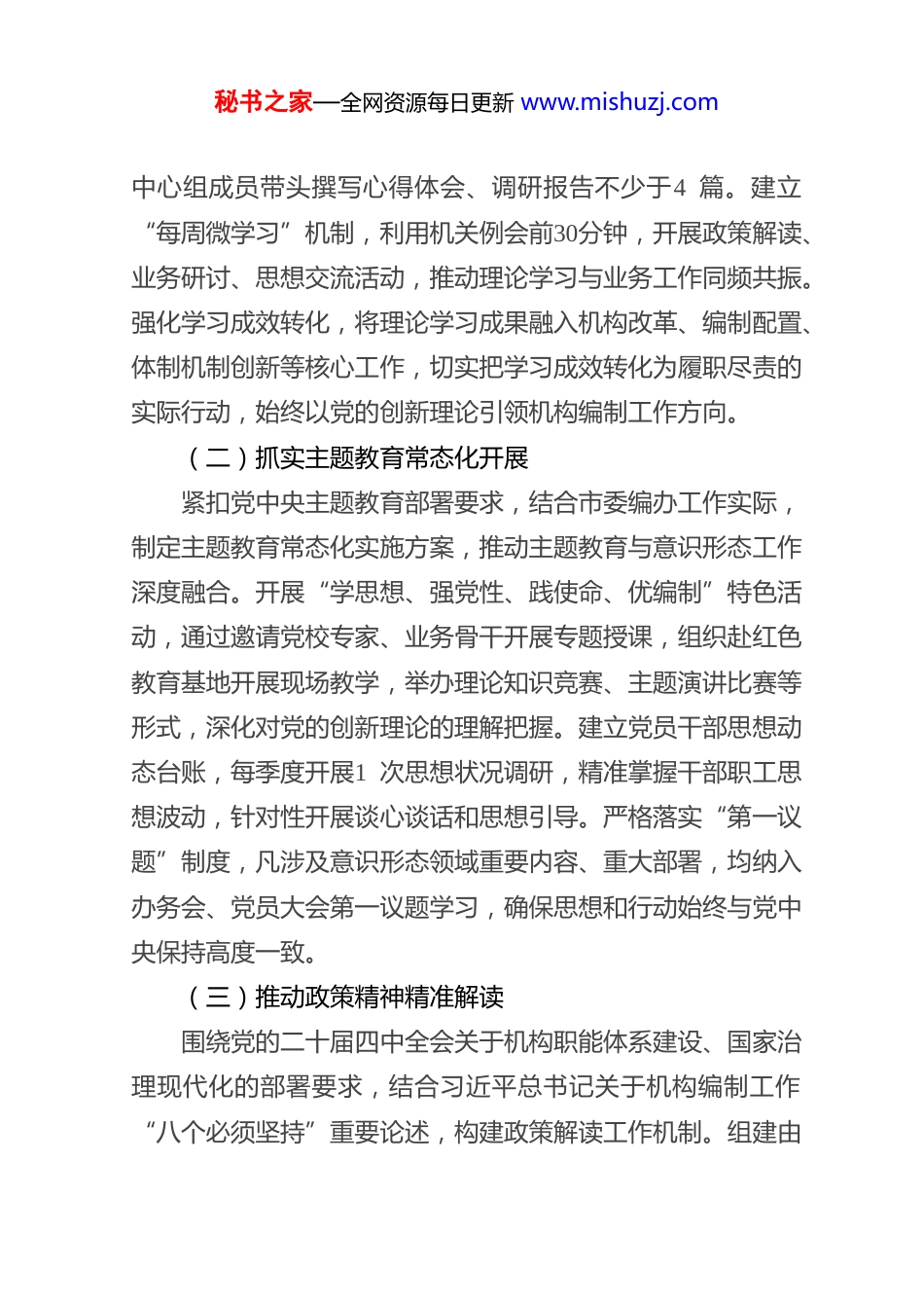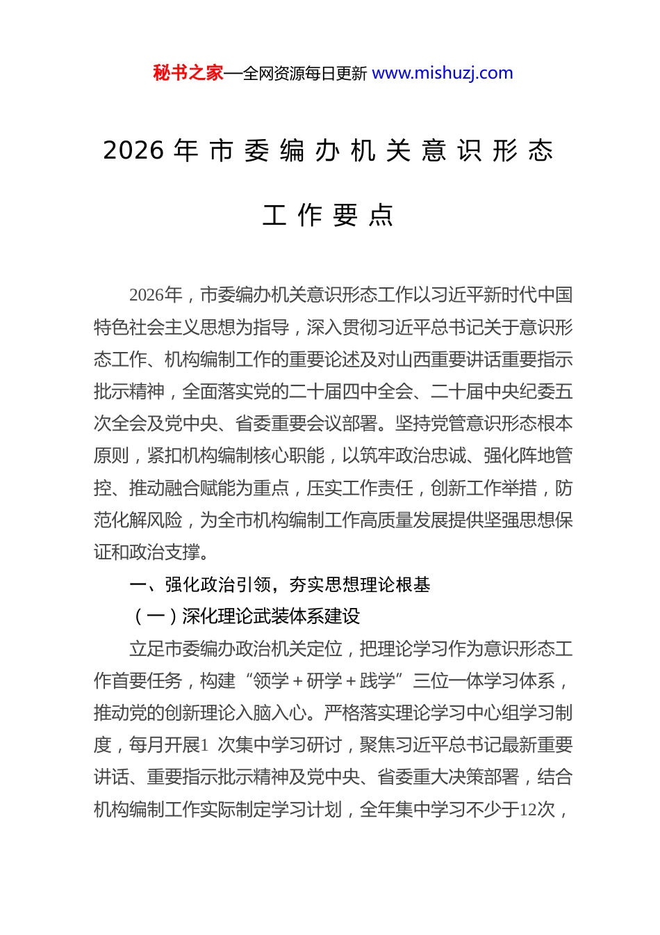 秘书之家—全网资源每日更新 www.mishuzj.com2026 年 市 委 编 办 机 关 意 识 形 态工 作 要 点2026年,市委编办机关意识形态工作以习近平新时代中国特色社会主义思想为指导,深入贯彻习近平总书记关于意识形态工作、机构编制工作的重要论述及对山西重要讲话重要指示批示精神,全面落实党的二十届四中全会、二十届中央纪委五次全会及党中央、省委重要会议部署。坚持党管意识形态根本原则,紧扣机构编制核心职能,以筑牢政治忠诚、强化阵地管控、推动融合赋能为重点,压实工作责任,创新工作举措,防范化解风险,为全市机构编制工作高质量发展提供坚强思想保证和政治支撑。一、强化政治引领,夯实思想理论根基(一)深化理论武装体系建设立足市委编办政治机关定位,把理论学习作为意识形态工作首要任务,构建“领学+研学+践学”三位一体学习体系,推动党的创新理论入脑入心。严格落实理论学习中心组学习制度,每月开展1 次集中学习研讨,聚焦习近平总书记最新重要讲话、重要指示批示精神及党中央、省委重大决策部署,结合机构编制工作实际制定学习计划,全年集中学习不少于12次,秘书之家—全网资源每日更新 www.mishuzj.com中心组成员带头撰写心得体会、调研报告不少于4 篇。建立“每周微学习”机制,利用机关例会前30分钟,开展政策解读、业务研讨、思想交流活动,推动理论学习与业务工作同频共振。强化学习成效转化,将理论学习成果融入机构改革、编制配置、体制机制创新等核心工作,切实把学习成效转化为履职尽责的实际行动,始终以党的创新理论引领机构编制工作方向。(二)抓实主题教育常态化开展紧扣党中央主题教育部署要求,结合市委编办工作实际,制定主题教育常态化实施方案,推动主题教育与意识形态工作深度融合。开展“学思想、强党性、践使命、优编制”特色活动,通过邀请党校专家、业务骨干开展专题授课,组织赴红色教育基地开展现场教学,举办理论知识竞赛、主题演讲比赛等形式,深化对党的创新理论的理解把握。建立党员干部思想动态台账,每季度开展1 次思想状况调研,精准掌握干部职工思想波动,针对性开展谈心谈话和思想引导。严格落实“第一议题”制度,凡涉及意识形态领域重要内容、重大部署,均纳入办务会、党员大会第一议题学习,确保思想和行动始终与党中央保持高度一致。(三)推动政策精神精准解读围绕党的二十届四中全会关于机构职能体系建设、国家治理现代化的部署要求,结合习近平总书记关于机构编制工作“八个必须坚持”重要论述,构建政策解读工作机制。组建由秘书之家—全网资源每日更新 www.mishuzj.com办领导牵头、业务骨干参与的政策解读专班,梳理机构改革、编制管理、法定化建设等重点政策,编制政策解读手册,面向全市机关单位开展精准解读服务。开展“政策宣讲进基层”活动,深入县区编办、市直部门,通过专题讲座、座谈交流等方式,解读机构编制政策法规及意识形态工作要求,全年开展宣讲活动不少于6 场。创新解读方式,利用机关公众号、工作简报等平台,推送政策解读文章、动漫短视频等内容,提升政策解读的可读性和覆盖面,凝聚全社会对机构编制工作的认知共识。(四)强化政治忠诚教育实践深刻领悟“两个确立”的决定性意义,把“两个维护”作为意识形态工作的根本要求,融入机构编制工作全过程各方面。开展“政治忠诚教育月”活动,通过专题党课、警示教育、廉政谈话等形式,强化干部职工政治意识、大局意识、核心意识、看齐意识。严格执行重大事项请示报告制度,凡涉及机构改革重大举措、编制资源调整、意识形态领域重要问题,均按程序向市委、市委编委请示报告,坚决服从党中央集中统一领导。建立政治素质考察机制,将意识形态工作表现纳入干部年度考核、评优评先、选拔任用的重要内容,对政治上不合格的干部实行“一票否决”,打造政治强、作风硬的机构编制干部队伍。秘书之家—全网资源每日更新 www.mishuzj.com二、严守阵地防线,强化宣传管控效能(五)筑牢网络意识形态阵地聚焦网络意识形态安全,建立“源头管控、日常巡查、应急处置”工作体系,守好网络宣传主阵地。规范机关官方公众号、工作群、门户...