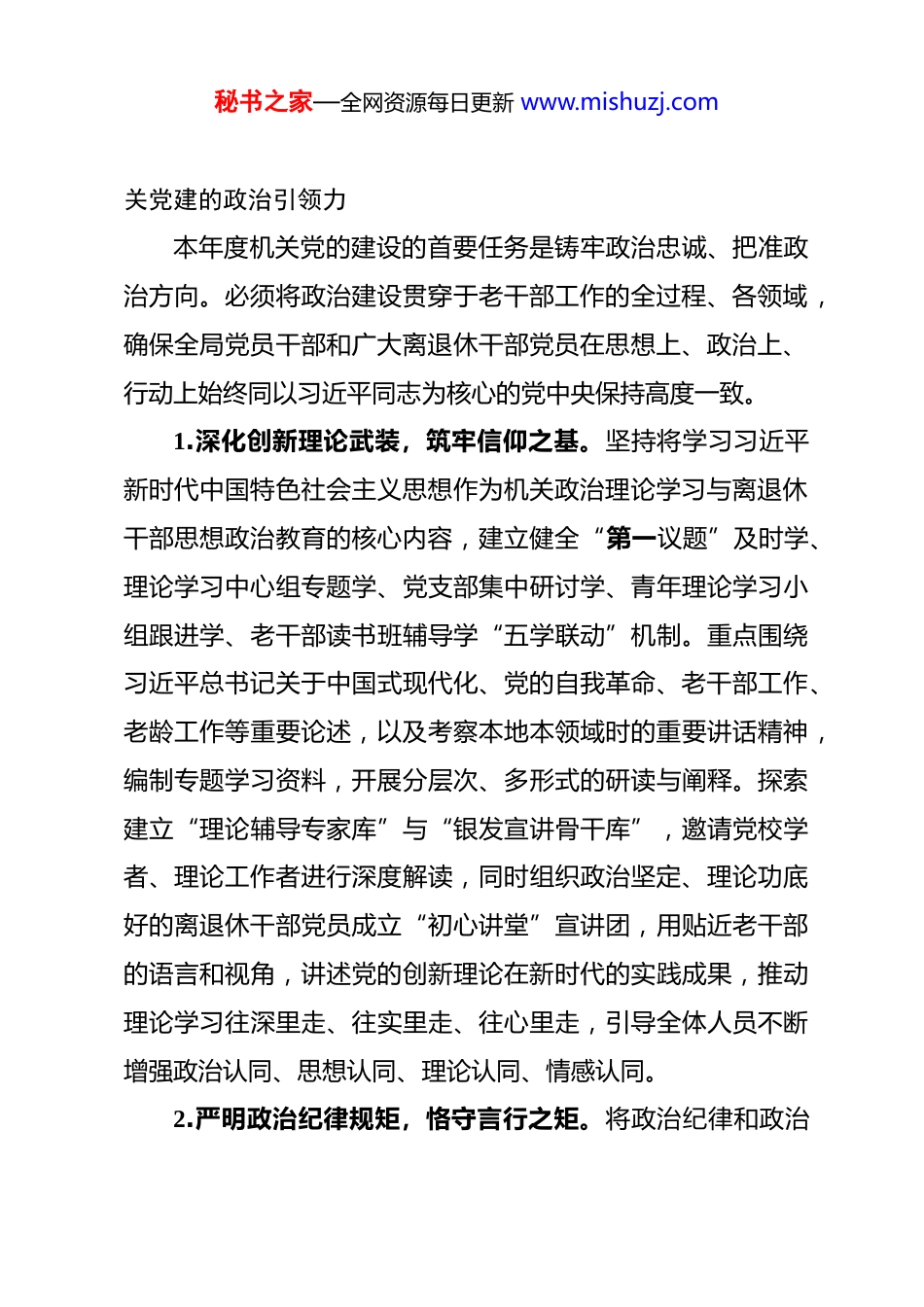 秘书之家—全网资源每日更新 www.mishuzj.com2026 年市委老干部局机关党建工作要点 2026 年是中华人民共和国成立“十五五”规划的开局奠基之年,也是我们党成立 105 周年的光辉纪念之年。做好本年度的机关党建工作,意义尤为深远,责任特别重大。市委老干部局机关党建工作必须坚持以习近平新时代中国特色社会主义思想为根本遵循与行动指南,深入贯彻党的二十大、二十届历次全会及四中全会的核心精神,全面落实习近平总书记关于党的建设的重要思想、党的自我革命的重要思想,特别是关于老干部工作的一系列重要论述和指示批示精神。要深刻领悟“两个确立”的决定性意义,自觉增强“四个意识”、坚定“四个自信”、做到“两个维护”。必须将机关党建工作置于全市发展大局与积极应对人口老龄化的国家战略中审视谋划,以政治建设为统领,以让党放心、让老干部满意为根本目标,持续深化模范机关与“四强”党支部建设,着力提升党建工作的规范化、精细化水平与围绕中心、服务大局的贡献度,锻造政治过硬、业务过硬、作风过硬的干部队伍,为引领新时代老干部工作高质量发展、助力“十五五”顺利开局起步提供坚强有力的政治和组织保障。一、聚焦绝对忠诚,实施“政治领航”工程,全面强化机秘书之家—全网资源每日更新 www.mishuzj.com关党建的政治引领力本年度机关党的建设的首要任务是铸牢政治忠诚、把准政治方向。必须将政治建设贯穿于老干部工作的全过程、各领域,确保全局党员干部和广大离退休干部党员在思想上、政治上、行动上始终同以习近平同志为核心的党中央保持高度一致。1.深化创新理论武装,筑牢信仰之基。坚持将学习习近平新时代中国特色社会主义思想作为机关政治理论学习与离退休干部思想政治教育的核心内容,建立健全“第一议题”及时学、理论学习中心组专题学、党支部集中研讨学、青年理论学习小组跟进学、老干部读书班辅导学“五学联动”机制。重点围绕习近平总书记关于中国式现代化、党的自我革命、老干部工作、老龄工作等重要论述,以及考察本地本领域时的重要讲话精神,编制专题学习资料,开展分层次、多形式的研读与阐释。探索建立“理论辅导专家库”与“银发宣讲骨干库”,邀请党校学者、理论工作者进行深度解读,同时组织政治坚定、理论功底好的离退休干部党员成立“初心讲堂”宣讲团,用贴近老干部的语言和视角,讲述党的创新理论在新时代的实践成果,推动理论学习往深里走、往实里走、往心里走,引导全体人员不断增强政治认同、思想认同、理论认同、情感认同。2.严明政治纪律规矩,恪守言行之矩。将政治纪律和政治秘书之家—全网资源每日更新 www.mishuzj.com规矩教育作为党员日常教育管理的必修课,深入学习贯彻二十届中央纪委五次全会精神,严肃纠治思想上的自由主义、政治上的投机主义等突出问题。在机关内部和离退休干部党组织中,深入开展政治纪律专题学习教育活动,组织学习《中国共产党纪律处分条例》等党内法规,通过典型案例剖析、观看警示教育片、参观廉政教育基地等形式,教育引导党员干部深刻认识“七个有之”的危害,自觉做政治上的“明白人”“老实人”。加强对机关党员干部和离退休干部党员在网络言行、社交媒体、讲座论坛等场合的政治言行规范管理,制定并落实负面言行清单提醒制度。建立健全政治素质考察机制,在干部选拔任用、评先评优、老干部各类先进评选表彰中,将遵守政治纪律和政治规矩情况作为首要审核关口,坚决防止“两面人”,确保队伍纯洁可靠。3.提升政治执行能力,保障落实之效。紧紧围绕党中央关于“十五五”时期经济社会发展的战略部署,以及省委、市委确定的年度重点任务,找准老干部工作服务大局的切入点和着力点。建立“政治要件”落实闭环管理机制,对习近平总书记重要指示批示、党中央及上级党委关于老干部工作的重大决策部署,实行台账管理、专人盯办、定期督查、销号落实,确保不折不扣执行到位。在机关内部开展“提升政治执行力”专项秘书之家—全网资源每日更新 www.mishuzj.com行动,教育引导党员干部胸怀“国之大者”,自觉将本职工作置于全市发展全局中思考谋划,坚决反对工作上的本位主义、履责上的好人主...