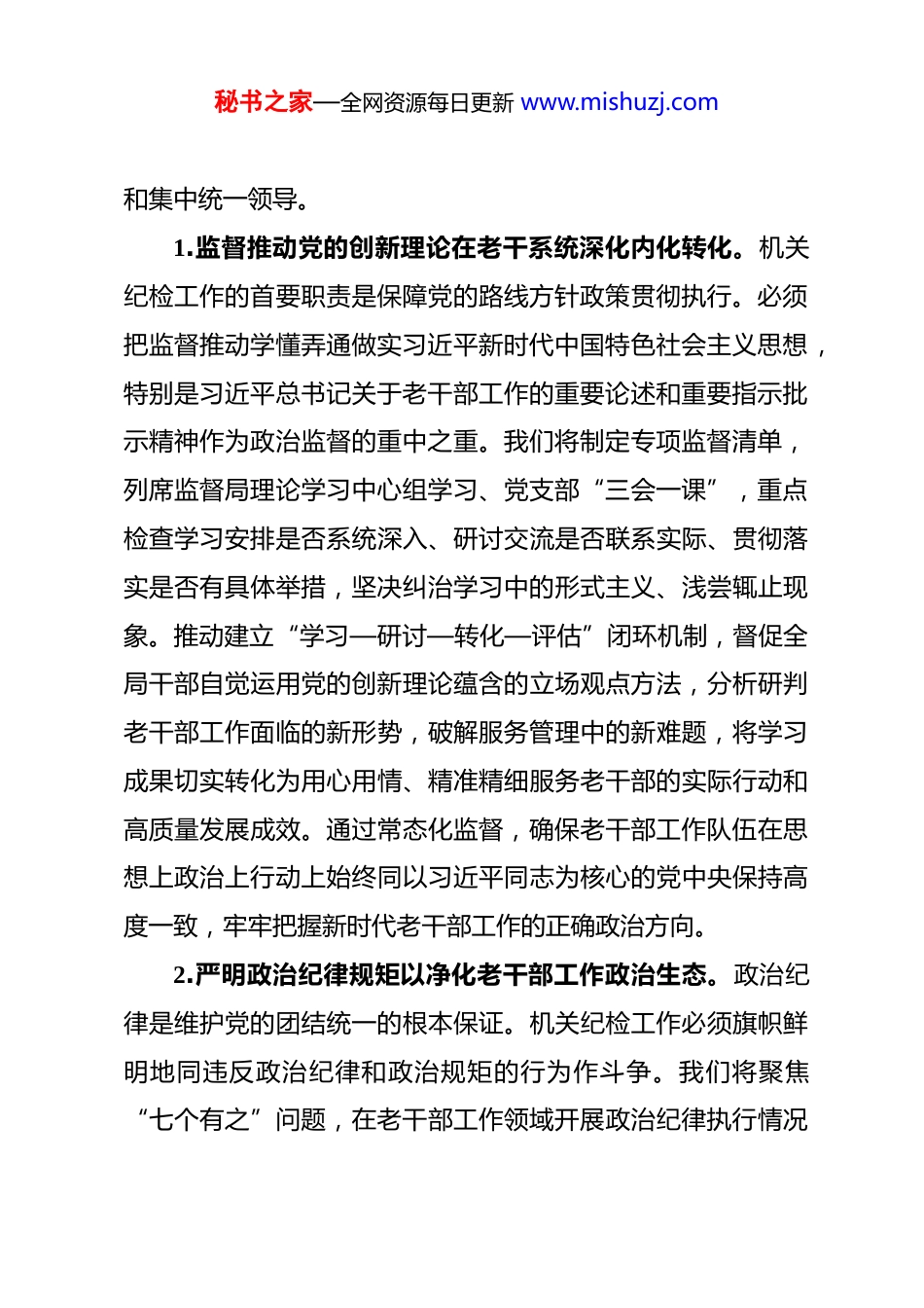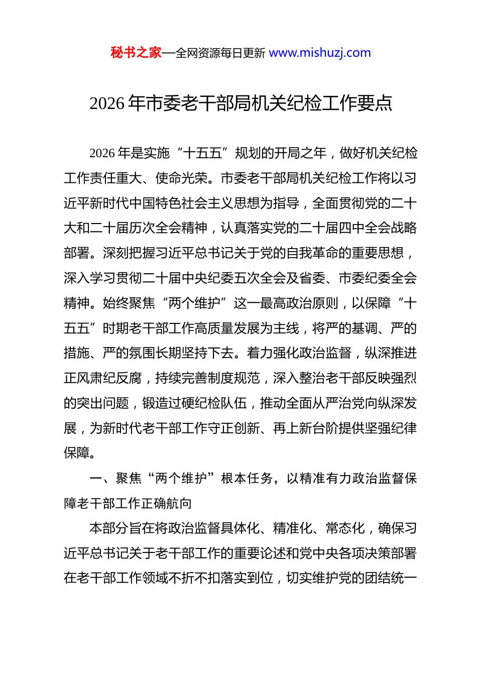 秘书之家—全网资源每日更新 www.mishuzj.com2026 年市委老干部局机关纪检工作要点 2026 年是实施“十五五”规划的开局之年,做好机关纪检工作责任重大、使命光荣。市委老干部局机关纪检工作将以习近平新时代中国特色社会主义思想为指导,全面贯彻党的二十大和二十届历次全会精神,认真落实党的二十届四中全会战略部署。深刻把握习近平总书记关于党的自我革命的重要思想,深入学习贯彻二十届中央纪委五次全会及省委、市委纪委全会精神。始终聚焦“两个维护”这一最高政治原则,以保障“十五五”时期老干部工作高质量发展为主线,将严的基调、严的措施、严的氛围长期坚持下去。着力强化政治监督,纵深推进正风肃纪反腐,持续完善制度规范,深入整治老干部反映强烈的突出问题,锻造过硬纪检队伍,推动全面从严治党向纵深发展,为新时代老干部工作守正创新、再上新台阶提供坚强纪律保障。一、聚焦“两个维护”根本任务,以精准有力政治监督保障老干部工作正确航向本部分旨在将政治监督具体化、精准化、常态化,确保习近平总书记关于老干部工作的重要论述和党中央各项决策部署在老干部工作领域不折不扣落实到位,切实维护党的团结统一秘书之家—全网资源每日更新 www.mishuzj.com和集中统一领导。1.监督推动党的创新理论在老干系统深化内化转化。机关纪检工作的首要职责是保障党的路线方针政策贯彻执行。必须把监督推动学懂弄通做实习近平新时代中国特色社会主义思想,特别是习近平总书记关于老干部工作的重要论述和重要指示批示精神作为政治监督的重中之重。我们将制定专项监督清单,列席监督局理论学习中心组学习、党支部“三会一课”,重点检查学习安排是否系统深入、研讨交流是否联系实际、贯彻落实是否有具体举措,坚决纠治学习中的形式主义、浅尝辄止现象。推动建立“学习—研讨—转化—评估”闭环机制,督促全局干部自觉运用党的创新理论蕴含的立场观点方法,分析研判老干部工作面临的新形势,破解服务管理中的新难题,将学习成果切实转化为用心用情、精准精细服务老干部的实际行动和高质量发展成效。通过常态化监督,确保老干部工作队伍在思想上政治上行动上始终同以习近平同志为核心的党中央保持高度一致,牢牢把握新时代老干部工作的正确政治方向。2.严明政治纪律规矩以净化老干部工作政治生态。政治纪律是维护党的团结统一的根本保证。机关纪检工作必须旗帜鲜明地同违反政治纪律和政治规矩的行为作斗争。我们将聚焦“七个有之”问题,在老干部工作领域开展政治纪律执行情况秘书之家—全网资源每日更新 www.mishuzj.com专项检查,深入排查是否存在对党中央关于老干部工作的决策部署阳奉阴违、搞变通、打折扣,是否存在传播政治谣言、损害党中央权威等言行。加强对离退休干部党组织政治生活的监督指导,督促严格执行民主集中制、重大事项请示报告等制度,引导老同志深刻领悟“两个确立”的决定性意义,坚决做到“两个维护”。严肃查处老干部工作中的“两面人”“两面派”,对在落实老干部政治待遇、生活待遇等政策中搞本位主义、好人主义,甚至欺上瞒下、弄虚作假的行为,发现一起、查处一起,以严明的纪律维护老干部工作部门的公信力和老干部队伍的纯洁性,不断涵养风清气正的政治生态。3.紧扣“十五五”开局强化对老干部工作服务大局的跟进监督。政治监督必须围绕中心、服务大局。2026 年是“十五五”规划起步之年,机关纪检工作要紧扣市委中心任务,监督保障老干部工作主动融入全市发展大局。我们将重点监督推动《关于进一步加强和改进离退休干部工作的意见》等中央、省委、市委文件精神在“十五五”新阶段的具体落实举措。聚焦“积极应对人口老龄化”国家战略在老干部工作领域的实践,监督相关部门是否有效搭建平台、创造条件,引导老干部在传承红色基因、关心下一代、基层治理、弘扬优良家风等方面发挥优势作用。加强对老干部工作年度重点任务、重大活动、重秘书之家—全网资源每日更新 www.mishuzj.com要经费项目落实情况的跟踪问效,建立“立项监督—过程跟踪—问题反馈—整改销号”的监督链条,及时纠正落实中的温差、偏差、落差,确保老干部工作始终与市委中...