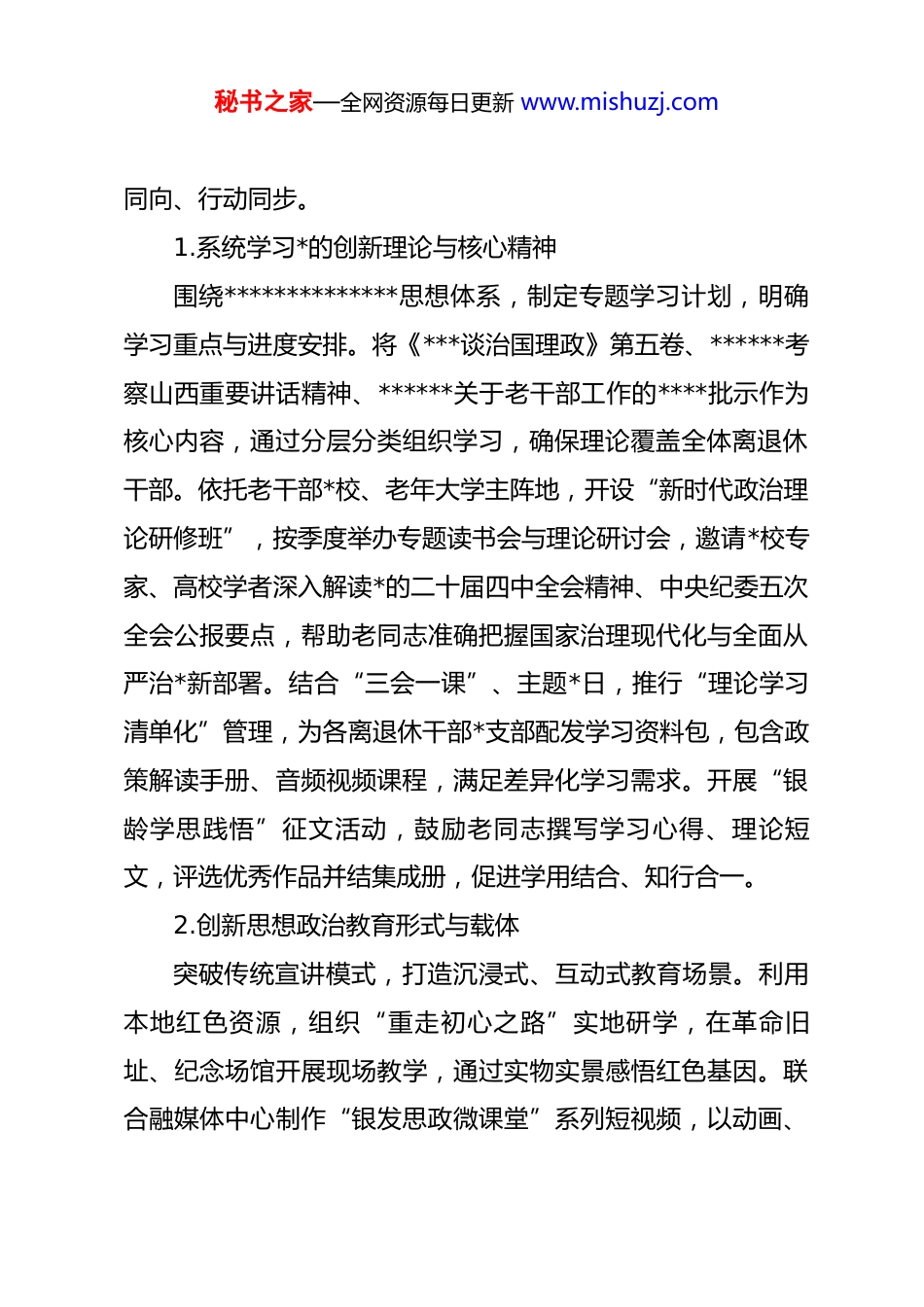 秘书之家—全网资源每日更新 www.mishuzj.com2026 年市委老干部局机关意识形态工作要点2026 年是实施“十五五”规划的开局之年,做好意识形态工作意义重大。市委老干部局将坚持以**************思想为指导,全面贯彻*的二十大和二十届历次全会精神,深入学习领会******关于意识形态工作、老干部工作的重要论述及考察山西重要讲话精神,严格落实*的二十届四中全会部署和二十届中央纪委五次全会要求,牢牢把握意识形态工作领导权、管理权、话语权。聚焦新时代老干部工作职责使命,以“举旗帜、聚民心、育新人、兴文化、展形象”为目标,以筑牢离退休干部思想根基为主线,以防范化解意识形态风险为重点,强化政治引领、深化理论武装、巩固阵地建设、创新工作载体,持续提升意识形态工作的针对性、实效性,引导广大离退休干部坚定拥护“两个确立”、坚决做到“两个维护”,为全市高质量发展凝聚银发力量、营造稳定和谐的思想舆论环境。一、深化理论武装,筑牢离退休干部思想政治根基坚持把理论学习作为意识形态工作的首要任务,推动*的创新理论入脑入心,引导离退休干部始终与*中央思想同心、目标秘书之家—全网资源每日更新 www.mishuzj.com同向、行动同步。1.系统学习*的创新理论与核心精神围绕**************思想体系,制定专题学习计划,明确学习重点与进度安排。将《***谈治国理政》第五卷、******考察山西重要讲话精神、******关于老干部工作的****批示作为核心内容,通过分层分类组织学习,确保理论覆盖全体离退休干部。依托老干部*校、老年大学主阵地,开设“新时代政治理论研修班”,按季度举办专题读书会与理论研讨会,邀请*校专家、高校学者深入解读*的二十届四中全会精神、中央纪委五次全会公报要点,帮助老同志准确把握国家治理现代化与全面从严治*新部署。结合“三会一课”、主题*日,推行“理论学习清单化”管理,为各离退休干部*支部配发学习资料包,包含政策解读手册、音频视频课程,满足差异化学习需求。开展“银龄学思践悟”征文活动,鼓励老同志撰写学习心得、理论短文,评选优秀作品并结集成册,促进学用结合、知行合一。2.创新思想政治教育形式与载体突破传统宣讲模式,打造沉浸式、互动式教育场景。利用本地红色资源,组织“重走初心之路”实地研学,在革命旧址、纪念场馆开展现场教学,通过实物实景感悟红色基因。联合融媒体中心制作“银发思政微课堂”系列短视频,以动画、秘书之家—全网资源每日更新 www.mishuzj.com访谈、情景剧等形式阐释理论难点,通过微信公众号、老年教育平台定向推送,每月更新两期,增强学习的吸引力与时效性。试点“家庭学习小组”模式,鼓励居住邻近的老干部组建小型学习共同体,由支部委员或理论骨干担任辅导员,定期上门送学、结对帮学,解决高龄*员参与不便的问题。举办“理论闯关”线上知识竞赛,设置积分奖励与荣誉榜单,激发老同志持续学习热情。3.强化意识形态风险辨析与引导建立常态化意识形态风险研判机制,每季度召开专题分析会,聚焦历史虚无主义、网络谣言等可能影响离退休干部群体的错误思潮,制定针对性辨析指引。组织“明辨是非”系列讲座,邀请意识形态领域专家剖析典型案例,提升老同志的政治敏锐性与鉴别力。编写《离退休干部意识形态风险防范手册》,梳理常见风险点与应对策略,发放至各支部学习参考。在老干部活动场所设立“清风话语角”,由局机关干部轮值接待,及时回应老同志思想困惑,做好解疑释惑、情绪疏导工作。4.巩固拓展 zt 教育成果长效机制总结*内 zt 教育经验,将其有效做法转化为日常思想政治教育制度。制定《离退休干部常态化思想政治教育实施细秘书之家—全网资源每日更新 www.mishuzj.com则》,明确学习频次、内容标准与考核要求。开展“银发初心”典型选树活动,挖掘一批坚守信仰、奉献余热的先进老干部个人与集体,通过事迹报告会、宣传专栏广泛传播,用身边榜样教育身边人。将意识形态表现纳入离退休干部*员民主评议指标,对思想认识存在偏差的*员及时开展谈心谈话,帮助其校正方向。二、加强*组织建设,提升离退休干部 dj 意识形态凝聚力以提升政治功能和组织功能为重点,将...