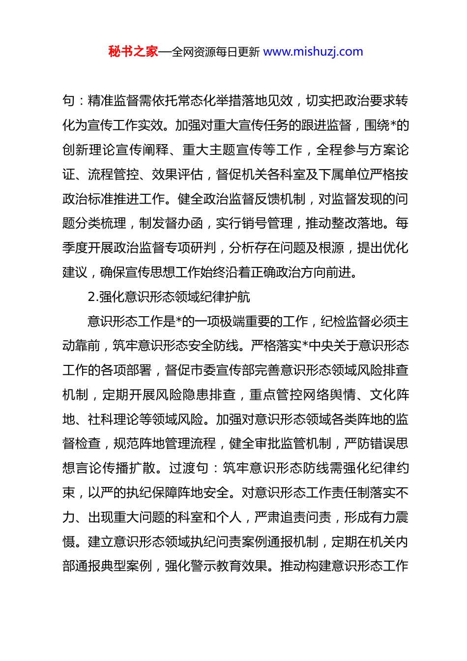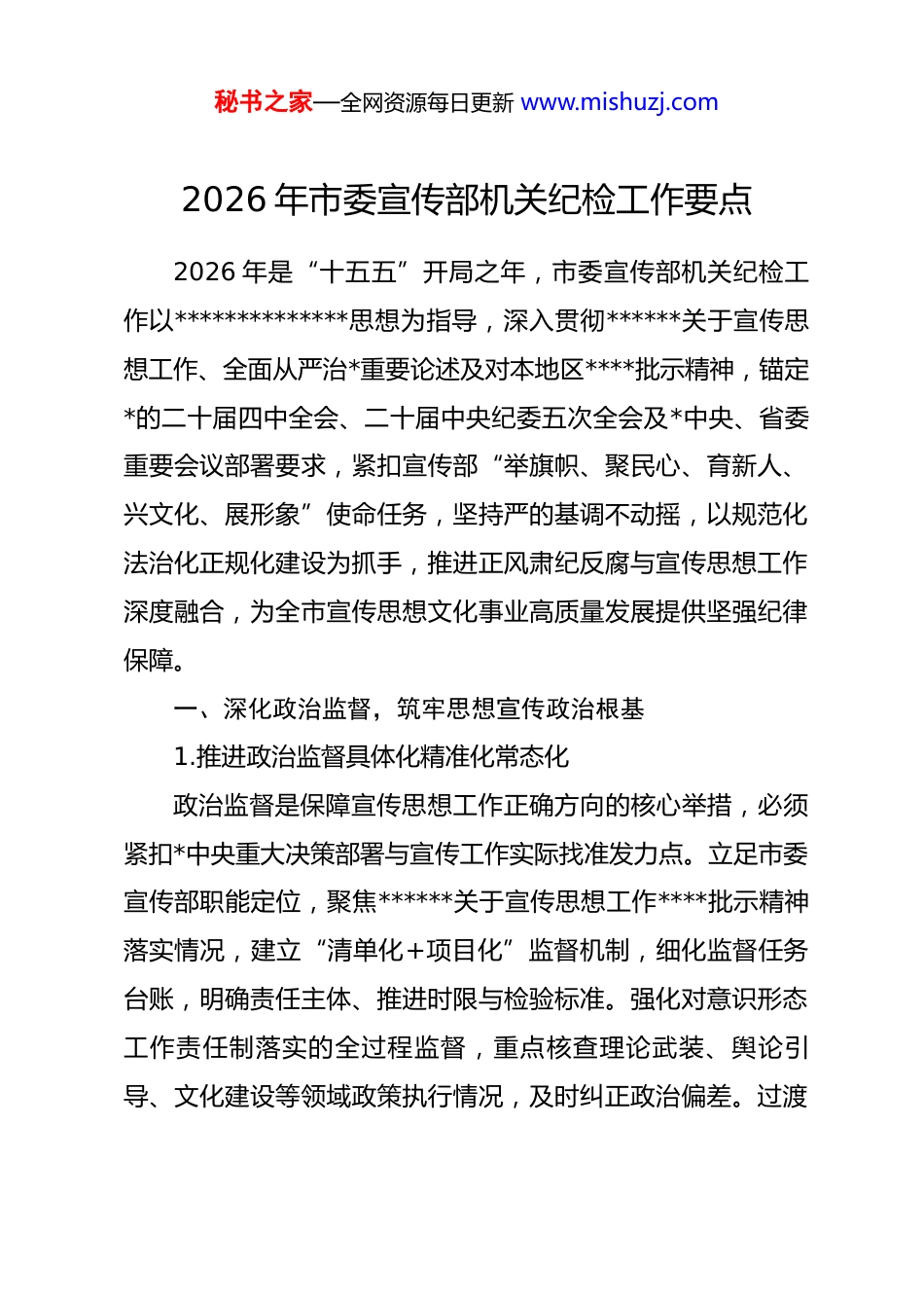 秘书之家—全网资源每日更新 www.mishuzj.com2026 年市委宣传部机关纪检工作要点2026 年是“十五五”开局之年,市委宣传部机关纪检工作以**************思想为指导,深入贯彻******关于宣传思想工作、全面从严治*重要论述及对本地区****批示精神,锚定*的二十届四中全会、二十届中央纪委五次全会及*中央、省委重要会议部署要求,紧扣宣传部“举旗帜、聚民心、育新人、兴文化、展形象”使命任务,坚持严的基调不动摇,以规范化法治化正规化建设为抓手,推进正风肃纪反腐与宣传思想工作深度融合,为全市宣传思想文化事业高质量发展提供坚强纪律保障。一、深化政治监督,筑牢思想宣传政治根基1.推进政治监督具体化精准化常态化政治监督是保障宣传思想工作正确方向的核心举措,必须紧扣*中央重大决策部署与宣传工作实际找准发力点。立足市委宣传部职能定位,聚焦******关于宣传思想工作****批示精神落实情况,建立“清单化+项目化”监督机制,细化监督任务台账,明确责任主体、推进时限与检验标准。强化对意识形态工作责任制落实的全过程监督,重点核查理论武装、舆论引导、文化建设等领域政策执行情况,及时纠正政治偏差。过渡秘书之家—全网资源每日更新 www.mishuzj.com句:精准监督需依托常态化举措落地见效,切实把政治要求转化为宣传工作实效。加强对重大宣传任务的跟进监督,围绕*的创新理论宣传阐释、重大主题宣传等工作,全程参与方案论证、流程管控、效果评估,督促机关各科室及下属单位严格按政治标准推进工作。健全政治监督反馈机制,对监督发现的问题分类梳理,制发督办函,实行销号管理,推动整改落地。每季度开展政治监督专项研判,分析存在问题及根源,提出优化建议,确保宣传思想工作始终沿着正确政治方向前进。2.强化意识形态领域纪律护航意识形态工作是*的一项极端重要的工作,纪检监督必须主动靠前,筑牢意识形态安全防线。严格落实*中央关于意识形态工作的各项部署,督促市委宣传部完善意识形态领域风险排查机制,定期开展风险隐患排查,重点管控网络舆情、文化阵地、社科理论等领域风险。加强对意识形态领域各类阵地的监督检查,规范阵地管理流程,健全审批监管机制,严防错误思想言论传播扩散。过渡句:筑牢意识形态防线需强化纪律约束,以严的执纪保障阵地安全。对意识形态工作责任制落实不力、出现重大问题的科室和个人,严肃追责问责,形成有力震慑。建立意识形态领域执纪问责案例通报机制,定期在机关内部通报典型案例,强化警示教育效果。推动构建意识形态工作秘书之家—全网资源每日更新 www.mishuzj.com协同监督格局,加强与网信、文旅等部门的沟通协作,形成监督合力,守牢全市意识形态阵地。3.严把宣传工作政治关口宣传工作具有鲜明政治属性,必须把政治把关贯穿工作各环节,确保宣传内容符合政治要求。督促市委宣传部健全宣传内容审核机制,细化审核流程,明确审核责任,对各类宣传作品、宣传活动、发布信息实行全流程政治审核,坚决杜绝政治错误。加强对宣传队伍政治素养的监督引导,督促开展政治理论培训,提升宣传干部政治判断力、政治领悟力、政治执行力。过渡句:政治把关的实效需靠制度执行与日常监督来保障,切实守住政治底线。定期对宣传内容审核制度执行情况开展专项检查,重点核查审核记录、整改落实等情况,对审核流于形式、把关不严的行为严肃纠正。建立宣传工作政治把关容错纠错机制,明确容错边界,鼓励宣传干部在严守政治纪律前提下积极创新,同时强化对恶意突破政治底线行为的惩戒力度,确保宣传工作既守正又创新。4.压实政治建设主体责任落实全面从严治*主体责任是推进机关政治建设的关键,纪检部门需强化监督问责,推动责任层层传导。督促市委宣传部领导班子切实履行主体责任,定期研究部署机关政治建设工秘书之家—全网资源每日更新 www.mishuzj.com作,将政治建设与宣传业务工作同谋划、同部署、同推进、同考核。加强对“一把手”和领导班子的监督,重点核查履行政治建设第一责任人职责、“一岗双责”情况,督促带头严守政治纪律和政治规矩。过渡句:责任落实需靠常态化监督倒逼,确保政治建设各项任务落地。健全主体责任...