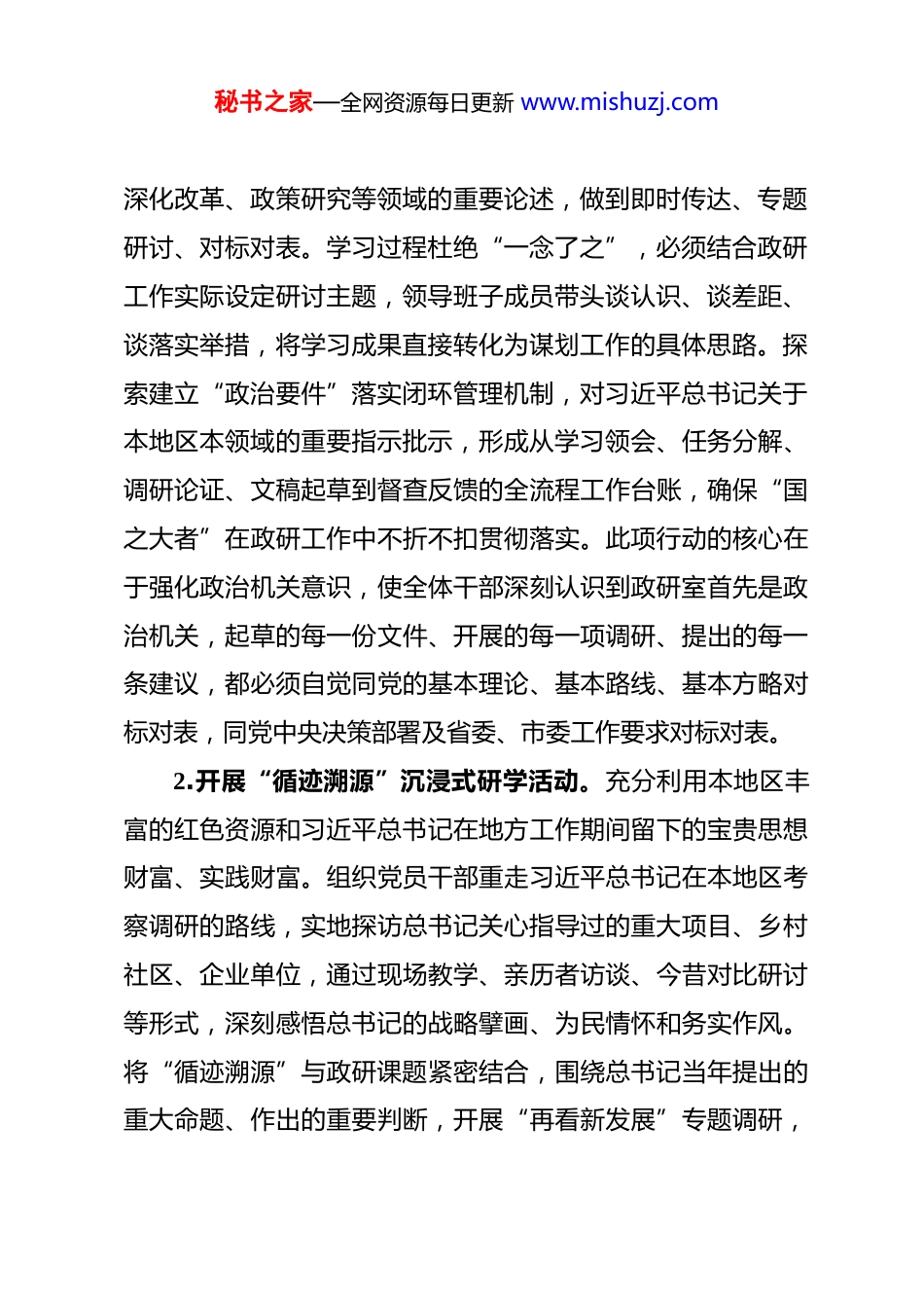 秘书之家—全网资源每日更新 www.mishuzj.com2026 年市委政研室机关党的建设工作要点 2026 年是“十五五”实施的开局之年。市委政研室机关党建工作将始终坚持以习近平新时代中国特色社会主义思想为指导,全面贯彻党的二十大及二十届历次全会精神,深入落实习近平总书记关于党的建设的重要思想和关于本地区本部门工作的重要讲话、重要指示批示精神,深刻领悟“两个确立”的决定性意义,坚决做到“两个维护”。以党的政治建设为统领,紧紧围绕二十届中央纪委五次全会部署及省委、市委重要会议要求,坚持机关党建“围绕中心、建设队伍、服务群众”的核心定位,聚焦政研室“以文辅政、改革攻坚、参谋服务”的主责主业,着力深化政治机关、模范机关建设,推动党建与调查研究、文稿服务、深化改革等业务工作深度融合、双优同创,全面提升机关党建质量,为奋力谱写中国式现代化地方实践新篇章贡献坚实的政研智慧和力量。一、突出思想铸魂,筑牢政治忠诚的根基1.实施“第一议题”制度深化拓展行动。坚持将学习习近平总书记最新重要讲话、重要文章、重要指示批示精神作为室务会、理论学习中心组、支部“三会一课”的首学内容。建立健全“第一时间”学习机制,对总书记涉及本地区发展、全面秘书之家—全网资源每日更新 www.mishuzj.com深化改革、政策研究等领域的重要论述,做到即时传达、专题研讨、对标对表。学习过程杜绝“一念了之”,必须结合政研工作实际设定研讨主题,领导班子成员带头谈认识、谈差距、谈落实举措,将学习成果直接转化为谋划工作的具体思路。探索建立“政治要件”落实闭环管理机制,对习近平总书记关于本地区本领域的重要指示批示,形成从学习领会、任务分解、调研论证、文稿起草到督查反馈的全流程工作台账,确保“国之大者”在政研工作中不折不扣贯彻落实。此项行动的核心在于强化政治机关意识,使全体干部深刻认识到政研室首先是政治机关,起草的每一份文件、开展的每一项调研、提出的每一条建议,都必须自觉同党的基本理论、基本路线、基本方略对标对表,同党中央决策部署及省委、市委工作要求对标对表。2.开展“循迹溯源”沉浸式研学活动。充分利用本地区丰富的红色资源和习近平总书记在地方工作期间留下的宝贵思想财富、实践财富。组织党员干部重走习近平总书记在本地区考察调研的路线,实地探访总书记关心指导过的重大项目、乡村社区、企业单位,通过现场教学、亲历者访谈、今昔对比研讨等形式,深刻感悟总书记的战略擘画、为民情怀和务实作风。将“循迹溯源”与政研课题紧密结合,围绕总书记当年提出的重大命题、作出的重要判断,开展“再看新发展”专题调研,秘书之家—全网资源每日更新 www.mishuzj.com形成一批展现总书记思想实践伟力的深度调研报告或理论文章。在青年干部中开展“总书记足迹上的微党课”竞赛,鼓励青年干部深入挖掘点位背后的故事与时代价值,变被动听讲为主动宣讲,深化对习近平新时代中国特色社会主义思想理论逻辑、历史逻辑、实践逻辑的理解。这项活动旨在推动理论学习从“纸面”走向“地面”,从“抽象”走向“具体”,在身临其境中增强政治认同、思想认同、理论认同、情感认同,夯实绝对忠诚的思想根基。3.构建“五学联动”体系化理论武装格局。系统化运用室务会引领学、理论学习中心组研讨学、支部集中学、青年理论学习小组交流学、党员干部自主学的“五学联动”机制。室务会侧重学习战略部署与方向把握;理论学习中心组聚焦重大理论与现实问题开展深入研讨,每年至少组织 4 次以上专题学习;各党支部依托“三会一课”、主题党日,结合业务开展“微学习”“微研讨”;青年理论学习小组突出创新与活力,举办读书沙龙、辩论赛、跨部门联学;党员个人利用“学习强国”等平台常态化自学。关键在“联动”,定期召开学习协调会,统筹各层级学习主题,避免重复与碎片化。建立“学思践悟”成果分享平台,每季度举办一次学习成果交流会,选取优秀的学习心得、调研报告或政策建议进行展示,推动理论学习成果在秘书之家—全网资源每日更新 www.mishuzj.com政研实践中“深化、内化、转化”。目标是形成上下贯通、左右协同、全员覆盖的...