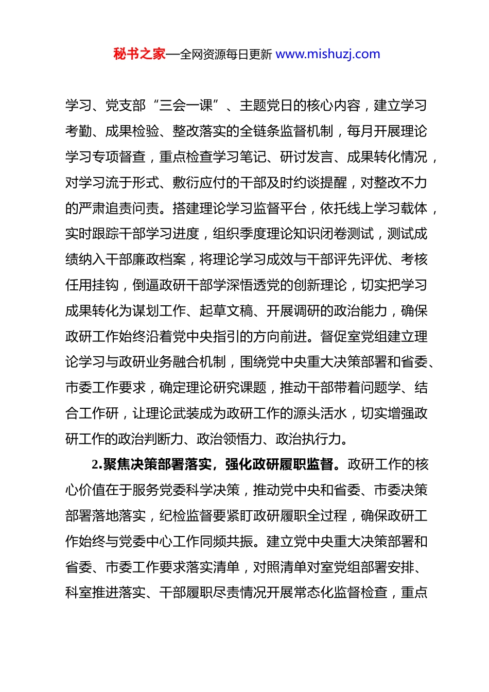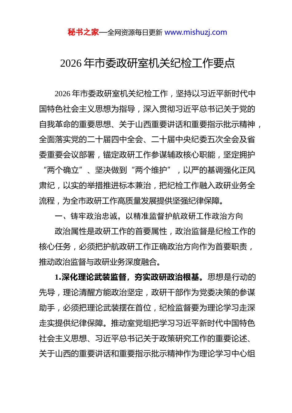 秘书之家—全网资源每日更新 www.mishuzj.com2026 年市委政研室机关纪检工作要点 2026 年市委政研室机关纪检工作,坚持以习近平新时代中国特色社会主义思想为指导,深入贯彻习近平总书记关于党的自我革命的重要思想、关于山西重要讲话和重要指示批示精神,全面落实党的二十届四中全会、二十届中央纪委五次全会及省委重要会议部署,锚定政研工作参谋辅政核心职能,坚定拥护“两个确立”、坚决做到“两个维护”,以严的基调强化正风肃纪,以实的举措推进标本兼治,把纪检工作融入政研业务全流程,为全市政研工作高质量发展提供坚强纪律保障。一、铸牢政治忠诚,以精准监督护航政研工作政治方向政治属性是政研工作的首要属性,政治监督是纪检工作的核心任务,必须把护航政研工作正确政治方向作为首要职责,推动政治监督与政研业务深度融合。1.深化理论武装监督,夯实政研政治根基。思想是行动的先导,理论清醒方能政治坚定,政研干部作为党委决策的参谋助手,必须把理论武装摆在首位,纪检监督要为理论学习走深走实提供纪律保障。推动室党组把学习习近平新时代中国特色社会主义思想、习近平总书记关于政策研究工作的重要论述、关于山西的重要讲话和重要指示批示精神作为理论学习中心组秘书之家—全网资源每日更新 www.mishuzj.com学习、党支部“三会一课”、主题党日的核心内容,建立学习考勤、成果检验、整改落实的全链条监督机制,每月开展理论学习专项督查,重点检查学习笔记、研讨发言、成果转化情况,对学习流于形式、敷衍应付的干部及时约谈提醒,对整改不力的严肃追责问责。搭建理论学习监督平台,依托线上学习载体,实时跟踪干部学习进度,组织季度理论知识闭卷测试,测试成绩纳入干部廉政档案,将理论学习成效与干部评先评优、考核任用挂钩,倒逼政研干部学深悟透党的创新理论,切实把学习成果转化为谋划工作、起草文稿、开展调研的政治能力,确保政研工作始终沿着党中央指引的方向前进。督促室党组建立理论学习与政研业务融合机制,围绕党中央重大决策部署和省委、市委工作要求,确定理论研究课题,推动干部带着问题学、结合工作研,让理论武装成为政研工作的源头活水,切实增强政研工作的政治判断力、政治领悟力、政治执行力。2.聚焦决策部署落实,强化政研履职监督。政研工作的核心价值在于服务党委科学决策,推动党中央和省委、市委决策部署落地落实,纪检监督要紧盯政研履职全过程,确保政研工作始终与党委中心工作同频共振。建立党中央重大决策部署和省委、市委工作要求落实清单,对照清单对室党组部署安排、科室推进落实、干部履职尽责情况开展常态化监督检查,重点秘书之家—全网资源每日更新 www.mishuzj.com监督重大调研课题立项、调研过程推进、调研成果报送、决策建议转化等关键环节,及时发现并纠正贯彻落实中的偏差。针对政研工作中存在的本位主义、敷衍塞责、落实不力等问题,建立问题台账,实行销号管理,明确整改时限、责任人员,定期开展“回头看”,确保各项决策部署在政研工作中落地生根。围绕全市发展大局和中心工作,聚焦建设现代化产业体系、发展新质生产力、推进共同富裕等重点任务,对政研室承担的调研任务、文稿起草、政策解读等工作开展专项监督,督促政研干部深入基层、深入实际开展调查研究,坚决杜绝闭门造车、照搬照抄,确保形成的调研报告、政策建议符合党中央精神、契合山西实际、贴合全市发展需求,切实发挥政研工作参谋辅政、决策咨询的重要作用。3.严明政治纪律规矩,筑牢政研纪律防线。政治纪律和政治规矩是党员干部的行为准则,政研干部身处党委核心工作圈层,必须始终把政治纪律和政治规矩挺在前面,纪检监督要以严明的纪律确保政研干部守规矩、知敬畏。组织开展政治纪律和政治规矩专题学习教育活动,每月开展一次纪律教育,重点学习《中国共产党纪律处分条例》中关于政治纪律的规定,通报违反政治纪律的典型案例,用身边事教育身边人,引导政研干部深刻认识“七个有之”的危害,坚决做到“五个必须”秘书之家—全网资源每日更新 www.mishuzj.com“五个决不允许”。建立政治纪律执行情况常态化排查机制,每季度开展一次政治纪...