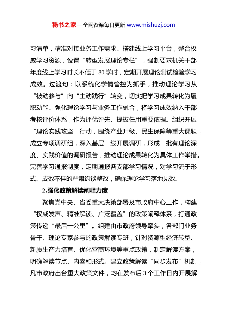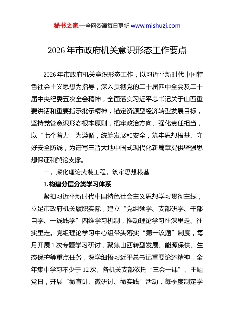 秘书之家—全网资源每日更新 www.mishuzj.com2026 年市政府机关意识形态工作要点 2026 年市政府机关意识形态工作,以习近平新时代中国特色社会主义思想为指导,深入贯彻党的二十届四中全会及二十届中央纪委五次全会精神,全面落实习近平总书记关于山西重要讲话和重要指示批示精神,锚定资源型经济转型发展目标,坚持党管意识形态根本原则,把牢政治方向、强化责任担当,以“七个着力”为遵循,统筹发展和安全,筑牢思想根基、守好安全防线,为谱写三晋大地中国式现代化新篇章提供坚强思想保证和舆论支撑。一、深化理论武装工程,筑牢思想根基1.构建分层分类学习体系紧扣习近平新时代中国特色社会主义思想学习贯彻主线,立足市政府机关履职实际,建立“党组领学、支部研学、干部自学、一线践学”四维学习机制,推动理论学习往深里走、往实里走。党组理论学习中心组带头落实“第一议题”制度,每月开展 1 次专题学习研讨,聚焦山西转型发展、能源保供、生态保护等重点任务,深学细悟习近平总书记重要论述精神,全年集中学习不少于 12 次。各机关支部依托“三会一课”、主题党日,开展“微宣讲、微研讨、微实践”活动,每季度制定学秘书之家—全网资源每日更新 www.mishuzj.com习清单,精准对接业务工作需求。搭建线上学习平台,整合权威学习资源,设置“转型发展理论专栏”,强制要求机关干部年度线上学习时长不低于 80 学时,定期开展理论测试检验学习成效。过渡句:以系统化学情管控为抓手,推动理论学习从“被动参与”向“主动践行”转变,切实把学习成果转化为履职动能。强化理论学习与业务工作融合,将学习成效纳入干部考核评价体系,作为评优评先、提拔任用重要依据。组织开展“理论实践攻坚”行动,围绕产业升级、民生保障等重大课题,成立专项调研组,深入基层一线开展调研,形成一批有理论深度、实践价值的调研报告,推动理论成果转化为具体工作举措。完善学习通报制度,定期通报各支部学习情况,对学习流于形式、成效不佳的严肃约谈整改,确保理论学习落地见效。2.强化政策解读阐释力度聚焦党中央、省委重大决策部署及市政府中心工作,构建“权威发声、精准解读、广泛覆盖”的政策阐释体系,打通政策传递“最后一公里”。组建由市政府领导牵头,各部门业务骨干、理论专家参与的政策解读专班,针对资源型经济转型、新质生产力培育、优化营商环境等重点政策,制定解读方案,明确解读节点、内容和形式。建立政策解读“同步发布”机制,凡市政府出台重大政策文件,均在发布后 3 个工作日内开展解秘书之家—全网资源每日更新 www.mishuzj.com读,通过新闻发布会、政策吹风会等形式,用通俗语言解读政策内涵、实施路径和预期成效,全年举办政策解读活动不少于20 场。打造“政策进基层”宣讲品牌,组织专班深入企业、社区、乡村开展靶向宣讲,结合群众关心的就业、教育、医疗等民生问题,现场答疑解惑,发放解读手册。过渡句:以多元化传播渠道为支撑,拓宽政策解读覆盖面,让政策精神深入人心、落地生根。创新解读形式,运用短视频、图文图解、动画等群众喜闻乐见的形式,制作系列解读产品,依托政府官网、官方新媒体平台推送,提升传播效果。加强与主流媒体协作,开设“政策解读专栏”,邀请部门负责人、专家学者深度解读政策背景和实践要求。建立政策解读反馈机制,收集群众对政策的疑问和建议,及时补充解读内容,动态优化政策实施细则,确保政策更贴合实际需求。3.厚植红色文化育人底蕴深入贯彻习近平总书记关于传承红色基因的重要论述,结合山西红色资源优势,打造特色红色教育体系,凝聚奋进力量。实施“红色基因传承”工程,组织机关干部赴百团大战纪念馆、晋绥边区革命纪念馆等红色教育基地开展沉浸式学习,每年集中开展 2 次红色教育实践活动,通过敬献花篮、重温入党誓词、聆听革命故事等形式,传承伟大抗战精神和吕梁精神。开展秘书之家—全网资源每日更新 www.mishuzj.com“红色故事宣讲”活动,选拔机关干部组建宣讲队伍,挖掘整理本地红色资源中的廉政故事、奋斗故事,在机关内部开展巡回宣讲,每月至少 1 场,推动红色文化融入日常工作。打造...