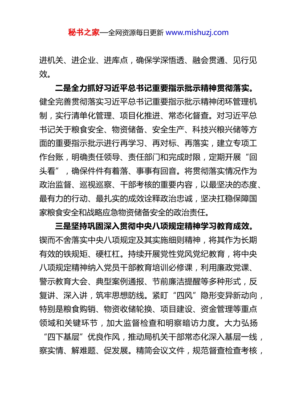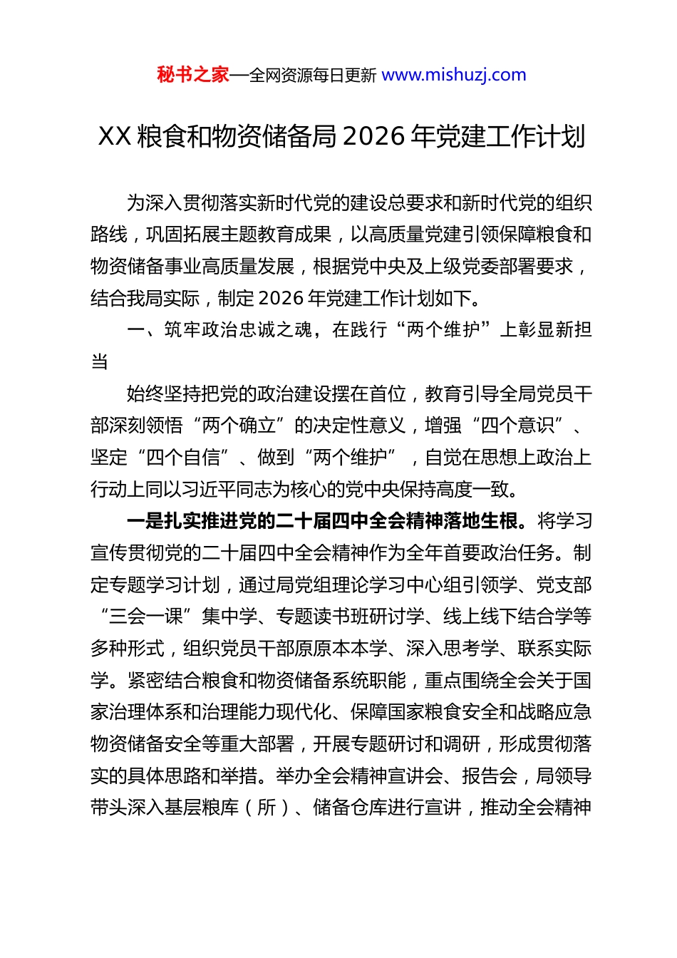 秘书之家—全网资源每日更新 www.mishuzj.comXX 粮食和物资储备局 2026 年党建工作计划为深入贯彻落实新时代党的建设总要求和新时代党的组织路线,巩固拓展主题教育成果,以高质量党建引领保障粮食和物资储备事业高质量发展,根据党中央及上级党委部署要求,结合我局实际,制定 2026 年党建工作计划如下。一、筑牢政治忠诚之魂,在践行“两个维护”上彰显新担当始终坚持把党的政治建设摆在首位,教育引导全局党员干部深刻领悟“两个确立”的决定性意义,增强“四个意识”、坚定“四个自信”、做到“两个维护”,自觉在思想上政治上行动上同以习近平同志为核心的党中央保持高度一致。一是扎实推进党的二十届四中全会精神落地生根。将学习宣传贯彻党的二十届四中全会精神作为全年首要政治任务。制定专题学习计划,通过局党组理论学习中心组引领学、党支部“三会一课”集中学、专题读书班研讨学、线上线下结合学等多种形式,组织党员干部原原本本学、深入思考学、联系实际学。紧密结合粮食和物资储备系统职能,重点围绕全会关于国家治理体系和治理能力现代化、保障国家粮食安全和战略应急物资储备安全等重大部署,开展专题研讨和调研,形成贯彻落实的具体思路和举措。举办全会精神宣讲会、报告会,局领导带头深入基层粮库(所)、储备仓库进行宣讲,推动全会精神秘书之家—全网资源每日更新 www.mishuzj.com进机关、进企业、进库点,确保学深悟透、融会贯通、见行见效。二是全力抓好习近平总书记重要指示批示精神贯彻落实。健全完善贯彻落实习近平总书记重要指示批示精神闭环管理机制,实行清单化管理、项目化推进、常态化督查。对习近平总书记关于粮食安全、物资储备、安全生产、科技兴粮兴储等方面的重要指示批示进行再学习、再对标、再落实,建立专项工作台账,明确责任领导、责任部门和完成时限,定期开展“回头看”,确保件件有着落、事事有回音。将贯彻落实情况作为政治监督、巡视巡察、干部考核的重要内容,以最坚决的态度、最有力的行动、最扎实的成效诠释政治忠诚,坚决扛稳保障国家粮食安全和战略应急物资储备安全的政治责任。三是坚持巩固深入贯彻中央八项规定精神学习教育成效。锲而不舍落实中央八项规定及其实施细则精神,将其作为长期有效的铁规矩、硬杠杠。持续开展党性党风党纪教育,将中央八项规定精神纳入党员干部教育培训必修课,利用廉政党课、警示教育大会、典型案例通报、节前廉洁提醒等多种形式,反复讲、深入讲,筑牢思想防线。紧盯“四风”隐形变异新动向,特别是粮食购销、物资收储轮换、项目建设、资金管理等重点领域和关键环节,加大监督检查和明察暗访力度。大力弘扬“四下基层”优良作风,推动局机关干部常态化深入基层一线,察实情、解难题、促发展。精简会议文件,规范督查检查考核,秘书之家—全网资源每日更新 www.mishuzj.com切实为基层减负松绑,把更多时间和精力用于抓落实、促发展。二、建强骨干队伍之本,在锻造过硬力量上实现新突破坚持党管干部、党管人才原则,聚焦粮食和物资储备事业长远发展需要,着力建设一支政治过硬、适应新时代要求、具备领导现代化建设能力的高素质专业化干部人才队伍。一是持续加强领导人员队伍建设。突出政治标准,严把选人用人政治关、品行关、能力关、作风关、廉洁关。优化领导班子结构,注重配备熟悉粮食业务、物资管理、宏观调控、法律法规、现代科技的复合型领导人才。加强领导干部能力培训,围绕提升政治能力、战略思维、专业水平、应急处突能力等,举办专题培训班、能力提升班。健全年轻干部发现培养选拔机制,有计划地安排年轻干部到艰苦岗位、复杂环境、基层一线和关键吃劲岗位磨砺锻炼,加快成长步伐。加强对“一把手”和领导班子成员的日常管理监督。二是持续强化干部履职考核。完善干部考核评价体系,强化考核结果运用,树立重实干、重实绩、重担当的鲜明导向。推行差异化考核,科学设置考核指标,将保障粮食安全、提升储备效能、推动科技创新、防范化解风险等核心任务完成情况作为考核重点。加强平时考核和专项考核,深入了解干部在重大任务、关键时刻的表现。将考核结果与干部选拔任用、教...