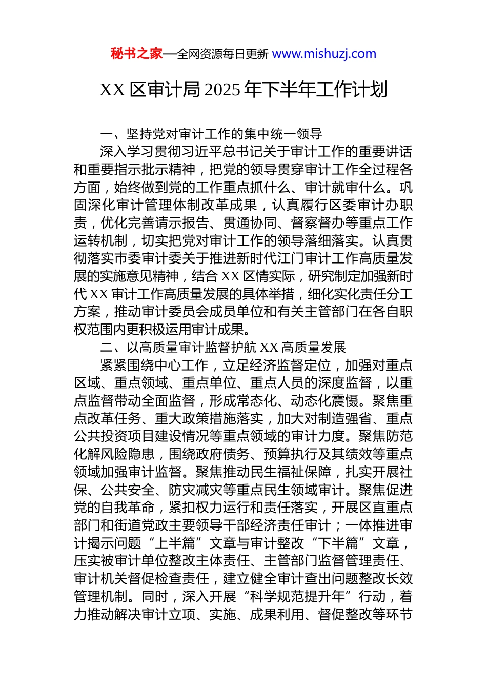 秘书之家—全网资源每日更新 www.mishuzj.comXX 区审计局 2025 年下半年工作计划一、坚持党对审计工作的集中统一领导深入学习贯彻习近平总书记关于审计工作的重要讲话和重要指示批示精神,把党的领导贯穿审计工作全过程各方面,始终做到党的工作重点抓什么、审计就审什么。巩固深化审计管理体制改革成果,认真履行区委审计办职责,优化完善请示报告、贯通协同、督察督办等重点工作运转机制,切实把党对审计工作的领导落细落实。认真贯彻落实市委审计委关于推进新时代江门审计工作高质量发展的实施意见精神,结合 XX 区情实际,研究制定加强新时代 XX 审计工作高质量发展的具体举措,细化实化责任分工方案,推动审计委员会成员单位和有关主管部门在各自职权范围内更积极运用审计成果。二、以高质量审计监督护航 XX 高质量发展紧紧围绕中心工作,立足经济监督定位,加强对重点区域、重点领域、重点单位、重点人员的深度监督,以重点监督带动全面监督,形成常态化、动态化震慑。聚焦重点改革任务、重大政策措施落实,加大对制造强省、重点公共投资项目建设情况等重点领域的审计力度。聚焦防范化解风险隐患,围绕政府债务、预算执行及其绩效等重点领域加强审计监督。聚焦推动民生福祉保障,扎实开展社保、公共安全、防灾减灾等重点民生领域审计。聚焦促进党的自我革命,紧扣权力运行和责任落实,开展区直重点部门和街道党政主要领导干部经济责任审计;一体推进审计揭示问题“上半篇”文章与审计整改“下半篇”文章,压实被审计单位整改主体责任、主管部门监督管理责任、审计机关督促检查责任,建立健全审计查出问题整改长效管理机制。同时,深入开展“科学规范提升年”行动,着力推动解决审计立项、实施、成果利用、督促整改等环节秘书之家—全网资源每日更新 www.mishuzj.com存在的“审计作为与审计地位不相适应”问题,以改革创新精神推动审计工作科学规范开展,不断提高审计监督质效。三、打造忠诚干净担当的审计干部队伍加强政治建设,持续学习和深刻领会习近平总书记关于审计工作的重要论述,用党的最新理论成果武装头脑、指导实践。提升专业能力,持续推进学习型审计机关建设,深化“审计讲堂”“业务比武”等平台,夯实财政财务收支审计基本功,不断提升审计干部专业素质。坚持从严治审,扎实开展深入贯彻中央八项规定精神学习教育,始终以高于别人的标准、严于别人的要求监督自己,做到依法审计、文明审计,常态化开展警示教育和审计现场廉政检查,守护好“国家审计”金字招牌。