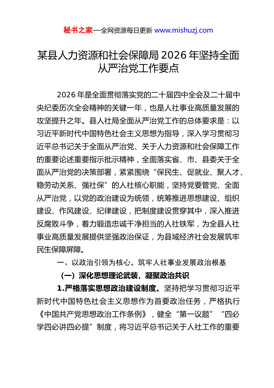 秘书之家—全网资源每日更新 www.mishuzj.com某县人力资源和社会保障局 2026 年坚持全面从严治党工作要点2026 年是全面贯彻落实党的二十届四中全会及二十届中央纪委历次全会精神的关键一年,也是人社事业高质量发展的攻坚提升之年。县人社局全面从严治党工作的总体要求是:以习近平新时代中国特色社会主义思想为指导,深入学习贯彻习近平总书记关于全面从严治党、关于人力资源和社会保障工作的重要论述重要指示批示精神,全面落实省、市、县委关于全面从严治党的决策部署,紧紧围绕“保民生、促就业、聚人才、稳劳动关系、强社保”的人社核心职能,坚持党要管党、全面从严治党,以党的政治建设为统领,统筹推进思想建设、组织建设、作风建设、纪律建设,把制度建设贯穿其中,深入推进反腐败斗争,着力锻造忠诚干净担当的人社铁军,为全县人社事业高质量发展提供坚强政治保证,为县域经济社会发展筑牢民生保障屏障。一、以政治引领为核心,筑牢人社事业发展政治根基(一)深化思想理论武装,凝聚政治共识1.严格落实思想政治建设制度。坚持把学习贯彻习近平新时代中国特色社会主义思想作为首要政治任务,严格执行《中国共产党思想政治工作条例》,健全“第一议题”“四必学四必讲四必提”制度,将习近平总书记关于人社工作的重要秘书之家—全网资源每日更新 www.mishuzj.com论述、重要指示批示精神、党的二十届四中全会精神作为党组理论学习中心组学习、党支部“三会一课”、干部职工政治学习的核心内容,做到学深悟透、融会贯通。全年党组理论学习中心组学习不少于 12 次,专题研讨不少于 4 次;各党支部集中学习每月不少于 1 次,每季度开展 1 次主题党日活动,推动理论学习往深里走、往实里走、往心里走。2.强化党的创新理论宣传教育。搭建“线上+线下”学习平台,线上依托“学习强国”“共产党员网”“人社部在线学习平台”等载体,开展常态化自主学习;线下组建“人社政策宣讲队”“青年理论学习小组”,结合“人社服务进企业、进乡村、进社区、进校园、进园区”活动,既向群众宣讲人社惠民政策,也向干部职工传导党的创新理论,实现理论学习与业务实践双向赋能。全年组织开展理论宣讲、政策解读活动不少于 20 场,青年理论学习小组集中学习交流不少于 8 次。3.筑牢意识形态工作防线。严格落实意识形态工作责任制,定期分析研判人社领域意识形态领域形势,重点关注社保基金监管、就业政策调整、人事考试招录、劳动关系处理等敏感领域的舆情动态,建立舆情监测、预警、处置闭环机制。加强人社系统网络阵地管理,规范官方网站、微信公众号等平台信息发布流程,坚决抵制错误言论,弘扬主旋律、传播正能量。全年开展意识形态工作专题研判不少于 4 次,网络舆情处置演练不少于 2 次。秘书之家—全网资源每日更新 www.mishuzj.com(二)规范党内政治生活,涵养政治生态1.严格执行民主集中制。完善党组议事决策规则,明确议事范围、程序和要求,凡属重大决策、重要人事任免、重大项目安排、大额度资金使用等“三重一大”事项,必须经党组集体讨论决定,做到科学决策、民主决策、依法决策。健全党组书记末位表态制,充分听取班子成员意见建议,杜绝“一言堂”“家长制”。全年召开党组会议不少于 15 次,专题研究全面从严治党工作不少于 4 次。2.提升党内政治生活质量。严格落实《关于新形势下党内政治生活的若干准则》,高质量召开民主生活会和组织生活会,做到批评与自我批评实事求是、辣味十足。认真落实谈心谈话制度,党组书记与班子成员、班子成员与分管科室(单位)负责人、支部书记与党员干部每季度至少开展 1 次谈心谈话,及时沟通思想、交换意见、化解矛盾。规范党员领导干部参加双重组织生活制度,带头落实“三会一课”、民主评议党员等制度,提升党内政治生活的政治性、时代性、原则性、战斗性。3.加强党性教育锤炼。结合庆祝建党 105 周年等重要节点,组织党员干部赴红色教育基地开展现场教学,重温入党誓词、回顾革命历程,传承红色基因、锤炼坚强党性。开展“党员示范岗”“党员责任区”创建活动,引导党员干部在人社服务、攻坚任务中亮身...