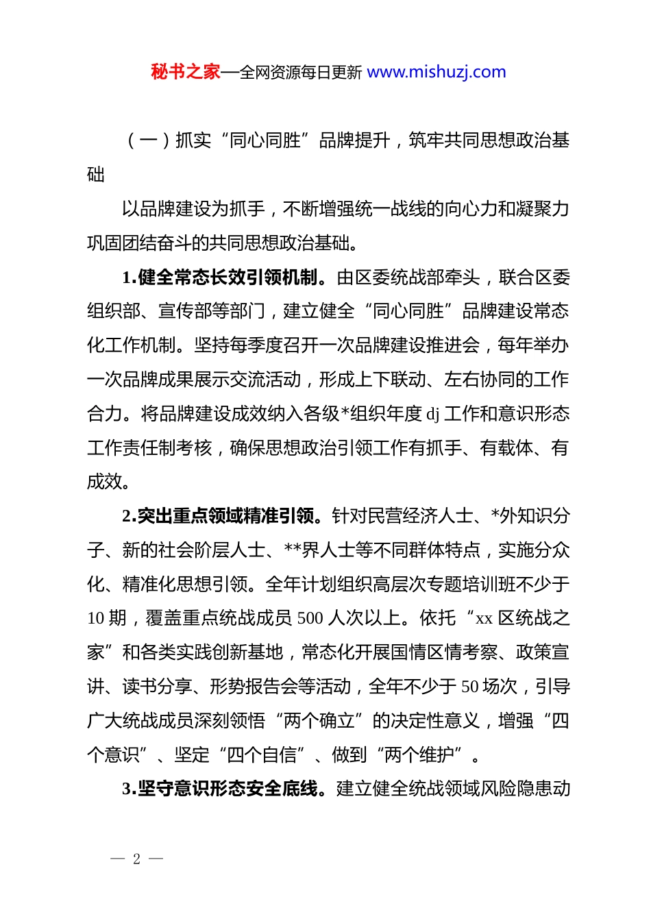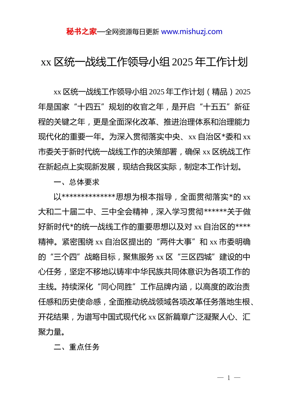秘书之家—全网资源每日更新 www.mishuzj.comxx 区统一战线工作领导小组 2025 年工作计划xx 区统一战线工作领导小组 2025 年工作计划(精品)2025年是国家“十四五”规划的收官之年,是开启“十五五”新征程的关键之年,更是全面深化改革、推进治理体系和治理能力现代化的重要一年。为深入贯彻落实中央、xx 自治区*委和 xx市委关于新时代统一战线工作的决策部署,确保 xx 区统战工作在新起点上实现新发展,现结合我区实际,制定本工作计划。一、总体要求以**************思想为根本指导,全面贯彻落实*的 xx大和二十届二中、三中全会精神,深入学习贯彻******关于做好新时代*的统一战线工作的重要思想以及对 xx 自治区的****精神。紧密围绕 xx 自治区提出的“两件大事”和 xx 市委明确的“三个四”战略目标,聚焦服务 xx 区“三区四城”建设的中心任务,坚定不移地以铸牢中华民族共同体意识为各项工作的主线。持续深化“同心同胜”工作品牌内涵,以高度的政治责任感和历史使命感,全面推动统战领域各项改革任务落地生根、开花结果,为谱写中国式现代化 xx 区新篇章广泛凝聚人心、汇聚力量。二、重点任务— 1 —秘书之家—全网资源每日更新 www.mishuzj.com(一)抓实“同心同胜”品牌提升,筑牢共同思想政治基础以品牌建设为抓手,不断增强统一战线的向心力和凝聚力巩固团结奋斗的共同思想政治基础。1.健全常态长效引领机制。由区委统战部牵头,联合区委组织部、宣传部等部门,建立健全“同心同胜”品牌建设常态化工作机制。坚持每季度召开一次品牌建设推进会,每年举办一次品牌成果展示交流活动,形成上下联动、左右协同的工作合力。将品牌建设成效纳入各级*组织年度 dj 工作和意识形态工作责任制考核,确保思想政治引领工作有抓手、有载体、有成效。2.突出重点领域精准引领。针对民营经济人士、*外知识分子、新的社会阶层人士、**界人士等不同群体特点,实施分众化、精准化思想引领。全年计划组织高层次专题培训班不少于10 期,覆盖重点统战成员 500 人次以上。依托“xx 区统战之家”和各类实践创新基地,常态化开展国情区情考察、政策宣讲、读书分享、形势报告会等活动,全年不少于 50 场次,引导广大统战成员深刻领悟“两个确立”的决定性意义,增强“四个意识”、坚定“四个自信”、做到“两个维护”。3.坚守意识形态安全底线。建立健全统战领域风险隐患动— 2 —秘书之家—全网资源每日更新 www.mishuzj.com态排查预警机制,由区委统战工作领导小组办公室统筹,各成员单位分工负责,重点围绕网络舆情、民族**、经济领域等开展常态化监测和分析研判。每季度形成一份风险评估报告,对苗头性、倾向性问题做到早发现、早报告、早处置。加强对统一战线各类新媒体平台和阵地的管理,确保统战领域意识形态绝对安全。4.加强统战理论实践创新。鼓励和支持各镇(街道)、各单位围绕统一战线服务中心大局的重点难点问题开展理论研究和实践探索。设立年度统战工作创新研究课题 5-8 个,并给予专项经费支持。年底组织开展全区统战工作“十大创新实践案例”评选活动,将优秀成果转化为推动工作的制度性安排,不断提升全区统战工作的科学化、规范化水平。(二)抓实“三地一城”目标任务,有形有感有效推进中华民族共同体建设将铸牢中华民族共同体意识作为新时代*的民族工作的“纲”,贯穿于经济社会发展的各领域和全过程。1.深化宣传教育覆盖面。深入实施“石榴籽+”工程,拓展宣传教育的广度和深度。推动铸牢中华民族共同体意识教育纳入全区干部教育、*员教育、国民教育、社会教育体系,确保干部教育培训覆盖率达到 100%。在全区 103 所中小学、幼儿园— 3 —秘书之家—全网资源每日更新 www.mishuzj.com持续深化“五个一”教育活动。依托全区 127 个铸牢中华民族共同体意识实践教育所(站)和 123 处“统战之家”,组建“同心宣讲团”,全年开展“感*恩、听*话、跟*走”等主题宣讲活动不少于 500 场次,受众超 20 万人次。打造“同心同胜·石榴花开”等主题公园、主题街区 3-5 个,营造“处处是课堂、时时受教育”的浓厚氛围...