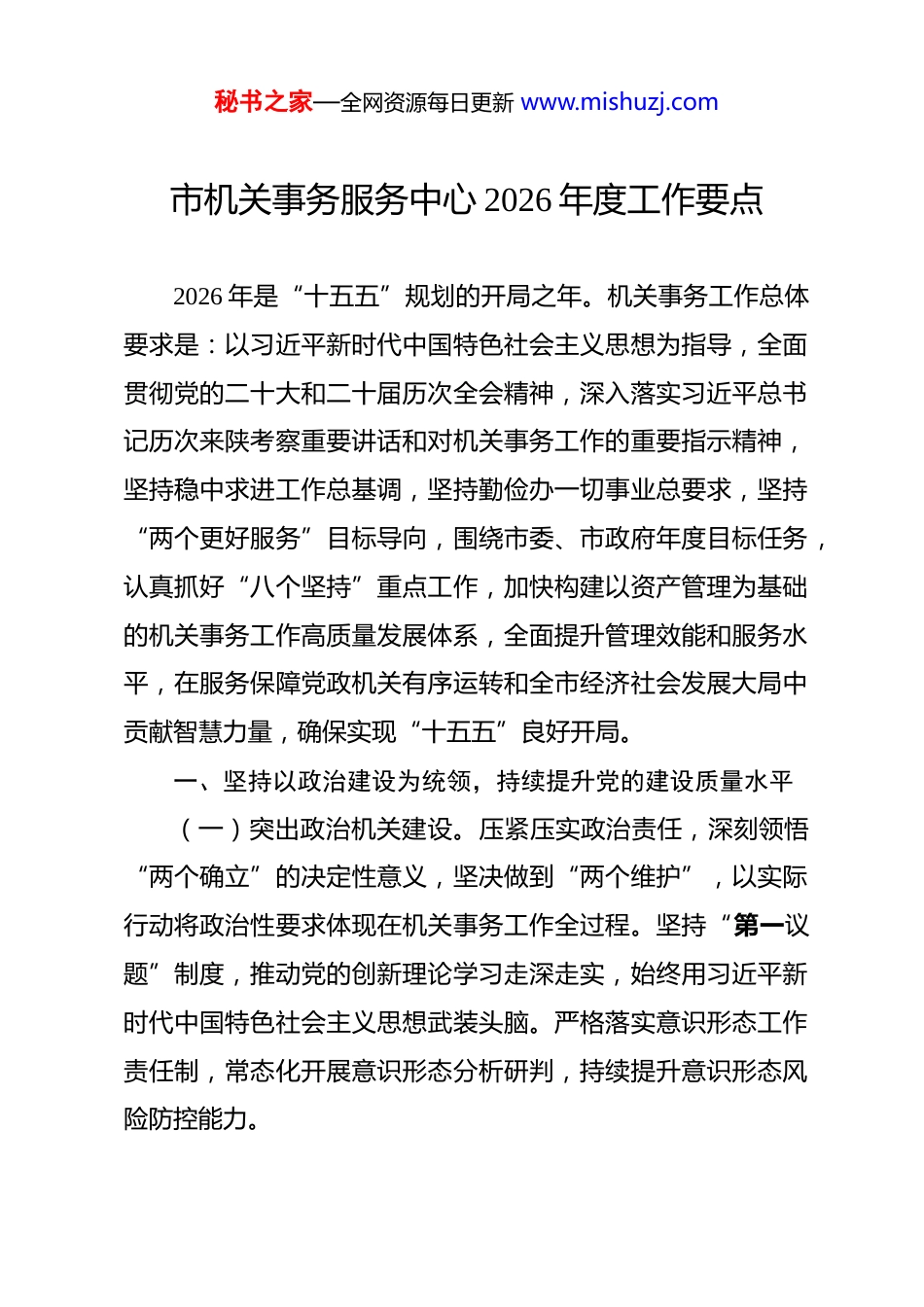 秘书之家—全网资源每日更新 www.mishuzj.com市机关事务服务中心 2026 年度工作要点 2026 年是“十五五”规划的开局之年。机关事务工作总体要求是:以习近平新时代中国特色社会主义思想为指导,全面贯彻党的二十大和二十届历次全会精神,深入落实习近平总书记历次来陕考察重要讲话和对机关事务工作的重要指示精神,坚持稳中求进工作总基调,坚持勤俭办一切事业总要求,坚持“两个更好服务”目标导向,围绕市委、市政府年度目标任务,认真抓好“八个坚持”重点工作,加快构建以资产管理为基础的机关事务工作高质量发展体系,全面提升管理效能和服务水平,在服务保障党政机关有序运转和全市经济社会发展大局中贡献智慧力量,确保实现“十五五”良好开局。一、坚持以政治建设为统领,持续提升党的建设质量水平(一)突出政治机关建设。压紧压实政治责任,深刻领悟“两个确立”的决定性意义,坚决做到“两个维护”,以实际行动将政治性要求体现在机关事务工作全过程。坚持“第一议题”制度,推动党的创新理论学习走深走实,始终用习近平新时代中国特色社会主义思想武装头脑。严格落实意识形态工作责任制,常态化开展意识形态分析研判,持续提升意识形态风险防控能力。秘书之家—全网资源每日更新 www.mishuzj.com(二)强化基层组织建设。以提升政治功能和组织功能为核心,持续抓好基层党支部组织生活规范化建设,推动党建和业务深度融合。坚持“一单位一品牌、一支部一特色”创建路径,充分发挥好基层党组织战斗堡垒作用。完善党员教育管理机制,抓好党员队伍思想政治建设,充分发挥好党员先锋模范作用。(三)狠抓党风廉政建设。深入学习领会习近平总书记关于党的自我革命的重要思想,贯彻落实二十届中央纪律检查委员会第五次全体会议精神,引导党员干部牢固树立和践行正确政绩观。锲而不舍落实中央八项规定及其实施细则精神,巩固拓展学习教育成果,持续推进作风建设常态化长效化,以优良作风凝心聚力、真抓实干。建立权力运行制度机制,完善政府采购、大中修项目等廉政风险防控清单。加大监督执纪“四种形态”运用力度,强化问责追究与警示震慑,着力提升制度执行力和刚性约束力。(四)持续巩固勤文化品牌。坚持以文育人、以化聚力,系统总结提炼“勤文化”三年集中建设经验,着力打造“勤文化”品牌矩阵。依托“勤文化”大讲堂、文化课堂等活动载体,宣传贯彻“一条主线、三个维度”高质量发展体系,深入基层开展两项法规等宣讲培训。聚焦勤俭办一切事业,组织开展形秘书之家—全网资源每日更新 www.mishuzj.com式多样的主题演讲和征文活动。推动统一思想凝聚共识,举办“习惯过紧日子”专题培训班,让勤俭节约、履职担当成为机关事务人的行动自觉。二、坚持以资产管理为基础,持续推动资产集约高效利用(一)加强对资产的集中统一管理。树立大资产与集约管理理念,研究制定加强市级行政事业单位国有资产集中统一管理的办法措施,进一步明确中心资产管理职能和管理范围,履行监管职能,推动国有资产管理集约化、高效化。依托中心“数字孪生”可视化管理平台,实现对市政府基础设施设备的统一标识、分类与归档,实现基础设施设备在桌面终端的全景可视化。抓住事业单位改革机遇,开展机关事务职能和编制体制调研,积极协调优化机构设置,强化资产管理职能和组织架构,为机关事务工作高质量发展注入新动能。(二)强化办公用房全生命周期管理。建立健全办公用房与土地资产台账,依托信息化管理平台实现动态监控。从严规范办公用房配备和使用标准,持续优化市级机关办公布局,推进相对集中办公与统一保障。持续推进权属登记历史遗留问题解决,探索事业单位办公用房权属统一登记路径。统筹实施大中修项目统一代建,加强全过程监管。探索维修保险新模式,降低财政维修负担,提升资金使用效益。秘书之家—全网资源每日更新 www.mishuzj.com(三)强化公务用车规范化管理。严格落实公务用车“五统一”(统一编制、统一标准、统一购置经费、统一采购配备、统一处置管理)管理规定,对照编制核查车辆信息,摸清存量底数,结合事业单位改革做好编制调整。建立分级保障机制,完善用车...