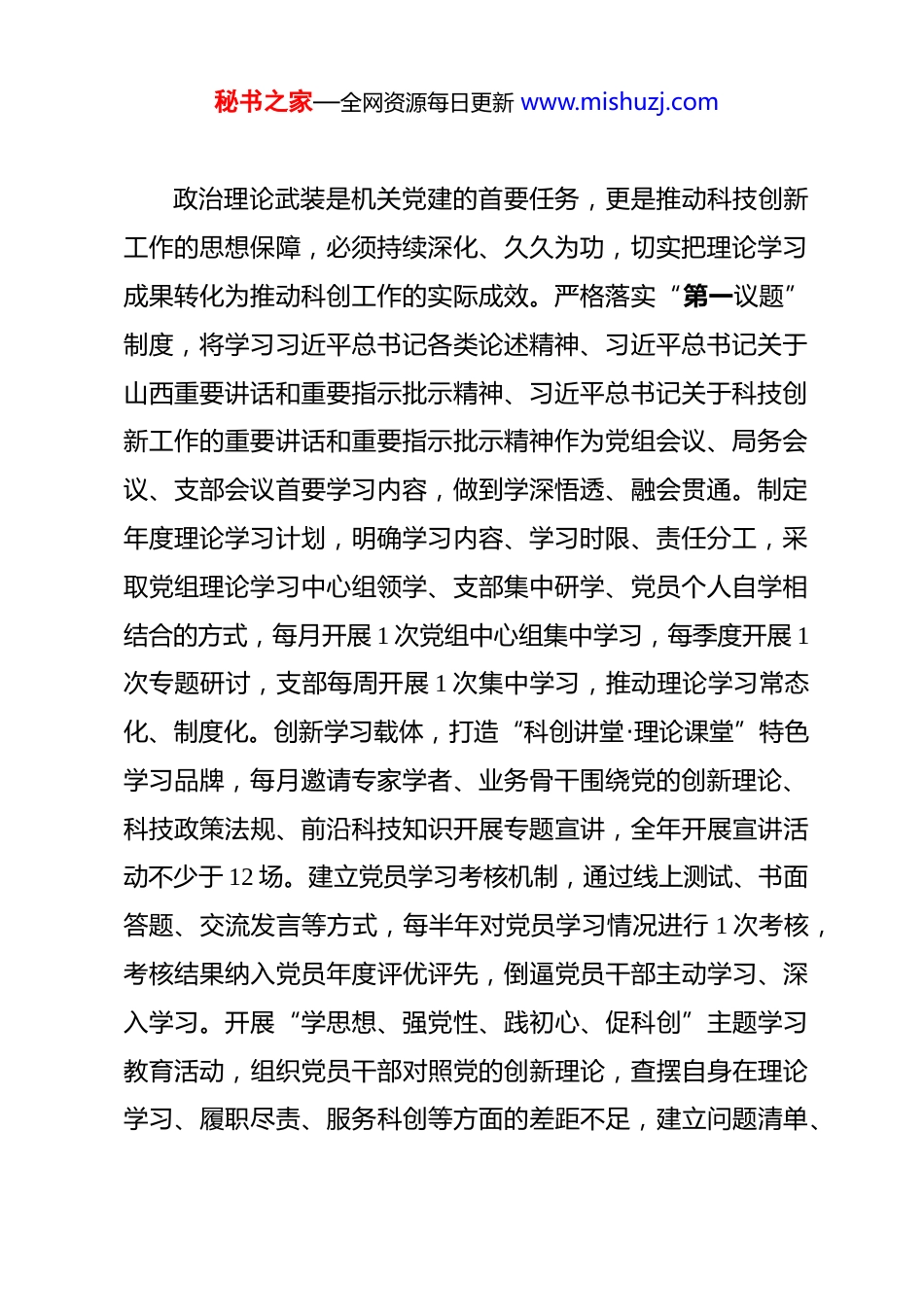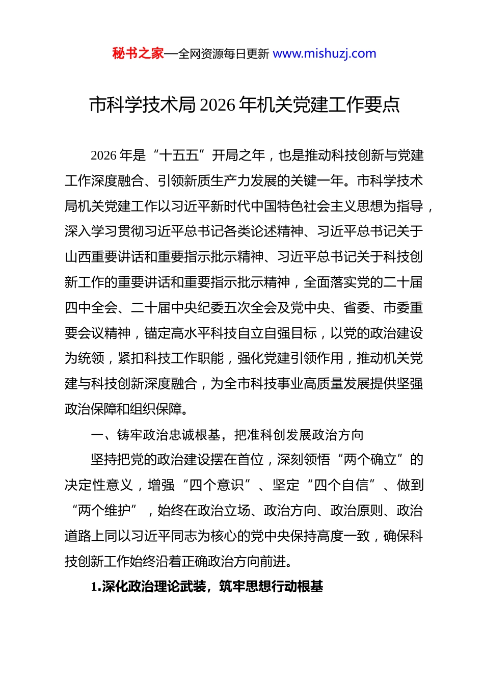 秘书之家—全网资源每日更新 www.mishuzj.com市科学技术局 2026 年机关党建工作要点 2026 年是“十五五”开局之年,也是推动科技创新与党建工作深度融合、引领新质生产力发展的关键一年。市科学技术局机关党建工作以习近平新时代中国特色社会主义思想为指导,深入学习贯彻习近平总书记各类论述精神、习近平总书记关于山西重要讲话和重要指示批示精神、习近平总书记关于科技创新工作的重要讲话和重要指示批示精神,全面落实党的二十届四中全会、二十届中央纪委五次全会及党中央、省委、市委重要会议精神,锚定高水平科技自立自强目标,以党的政治建设为统领,紧扣科技工作职能,强化党建引领作用,推动机关党建与科技创新深度融合,为全市科技事业高质量发展提供坚强政治保障和组织保障。一、铸牢政治忠诚根基,把准科创发展政治方向坚持把党的政治建设摆在首位,深刻领悟“两个确立”的决定性意义,增强“四个意识”、坚定“四个自信”、做到“两个维护”,始终在政治立场、政治方向、政治原则、政治道路上同以习近平同志为核心的党中央保持高度一致,确保科技创新工作始终沿着正确政治方向前进。1.深化政治理论武装,筑牢思想行动根基秘书之家—全网资源每日更新 www.mishuzj.com政治理论武装是机关党建的首要任务,更是推动科技创新工作的思想保障,必须持续深化、久久为功,切实把理论学习成果转化为推动科创工作的实际成效。严格落实“第一议题”制度,将学习习近平总书记各类论述精神、习近平总书记关于山西重要讲话和重要指示批示精神、习近平总书记关于科技创新工作的重要讲话和重要指示批示精神作为党组会议、局务会议、支部会议首要学习内容,做到学深悟透、融会贯通。制定年度理论学习计划,明确学习内容、学习时限、责任分工,采取党组理论学习中心组领学、支部集中研学、党员个人自学相结合的方式,每月开展 1 次党组中心组集中学习,每季度开展 1次专题研讨,支部每周开展 1 次集中学习,推动理论学习常态化、制度化。创新学习载体,打造“科创讲堂·理论课堂”特色学习品牌,每月邀请专家学者、业务骨干围绕党的创新理论、科技政策法规、前沿科技知识开展专题宣讲,全年开展宣讲活动不少于 12 场。建立党员学习考核机制,通过线上测试、书面答题、交流发言等方式,每半年对党员学习情况进行 1 次考核,考核结果纳入党员年度评优评先,倒逼党员干部主动学习、深入学习。开展“学思想、强党性、践初心、促科创”主题学习教育活动,组织党员干部对照党的创新理论,查摆自身在理论学习、履职尽责、服务科创等方面的差距不足,建立问题清单、秘书之家—全网资源每日更新 www.mishuzj.com整改清单、责任清单,限期整改落实,切实把学习成效体现到推动科技创新各项工作中,以理论清醒保证政治坚定,以思想自觉引领行动自觉。2.严明政治纪律规矩,强化政治执行力政治纪律和政治规矩是最重要、最根本、最关键的纪律,必须严格遵守、坚决执行,确保党中央、省委、市委关于科技创新工作的各项决策部署落地生根。深入学习贯彻《中国共产党纪律处分条例》等党内法规,组织开展“纪律教育学习月”活动,通过专题党课、案例警示教育、廉政谈话等形式,引导党员干部知敬畏、存戒惧、守底线,自觉遵守党的政治纪律、组织纪律、廉洁纪律、群众纪律、工作纪律、生活纪律。严格执行重大事项请示报告制度,凡涉及科技创新重大政策制定、重大项目安排、大额资金使用等重要事项,及时向市委、市政府和上级科技部门、纪检监察机关请示报告,坚决杜绝自行其是、擅自作主。强化政治监督,成立政治监督专项小组,聚焦党中央、省委、市委关于科技创新的重大决策部署,围绕山西资源型经济转型、能源革命、科技创新赋能等重点任务,开展专项监督检查,每季度形成 1 次监督报告,对发现的问题及时督促整改,坚决纠正贯彻落实不到位、打折扣、搞变通的行为。加强党内政治生活锻炼,严格落实“三会一课”、民主生活会、秘书之家—全网资源每日更新 www.mishuzj.com组织生活会、民主评议党员等制度,提高党内政治生活的政治性、时代性、原则性、战斗性,引导党员干部在严肃的党内政...